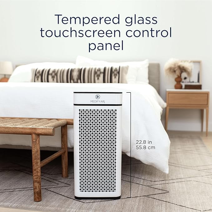 Great for medium to large sized rooms, including bedrooms, offices, kitchens, dining rooms, or entryways. Helps control dust, smoke, odors, and pet dander while filtering airborne particles throughout the home. Tempered-glass touch controls include 3 fan speeds, preset timers, child lock, sleep mode, filter indicator and optional ionizer. This Medify Air filter has three layers of filtration, including a pre-filter, True HEPA H13, and an active carbon composite for odors. HEPA Air Purifier Filtration: The HEPA H13 filter material is tested to remove 99.97% of airborne particles from 0.1 to 0.3 microns. That’s 1,000 times thinner than one strand of human hair. About Medify Air: At Medify Air, we’re committed to making clean indoor air available to everyone through our advanced air purification technology. Our mission is to facilitate healthier environments everywhere with our affordable, effective, and easy-to-operate air filtration systems.Every purifier comes with a Limited Lifetime Warranty and is CARB, ETL, AHAM Verifide, and Energy Star Certified