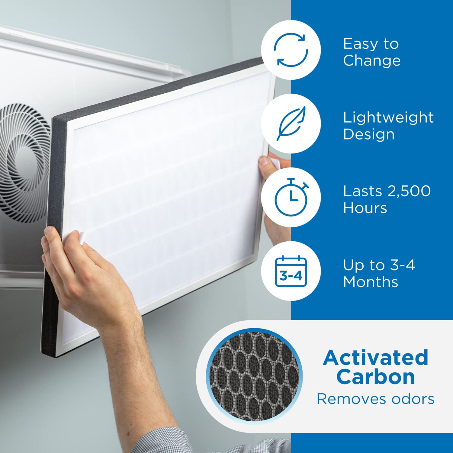 Wall-Mounted Air Purifier: Great for nurseries, children’s rooms, offices, or any medium to large sized room. Helps control dust, smoke, odors, and pet dander while filtering airborne particles throughout the home. The MA-35 filter replacement lasts 3–4 months or 2,500 hours and can clean up to 1,312 sqare feet in an hour This Medify Air filter has three layers of filtration, including a pre-filter, True HEPA H13 layer, and an active carbon composite for odors HEPA Air Purifier Filtration: The HEPA H13 filter material is tested to remove 99.97% of airborne particles from 0.1 to 0.3 microns. That’s 1,000 times thinner than one strand of human hair. About Medify Air: At Medify Air, we’re committed to making clean indoor air available to everyone through our advanced air purification technology. Our mission is to facilitate healthier environments everywhere with our affordable, effective, and easy-to-operate air filtration systems.Every purifier comes with a Limited Lifetime Warranty and is CARB, ETL, AHAM Verifide, and Energy Star Certified