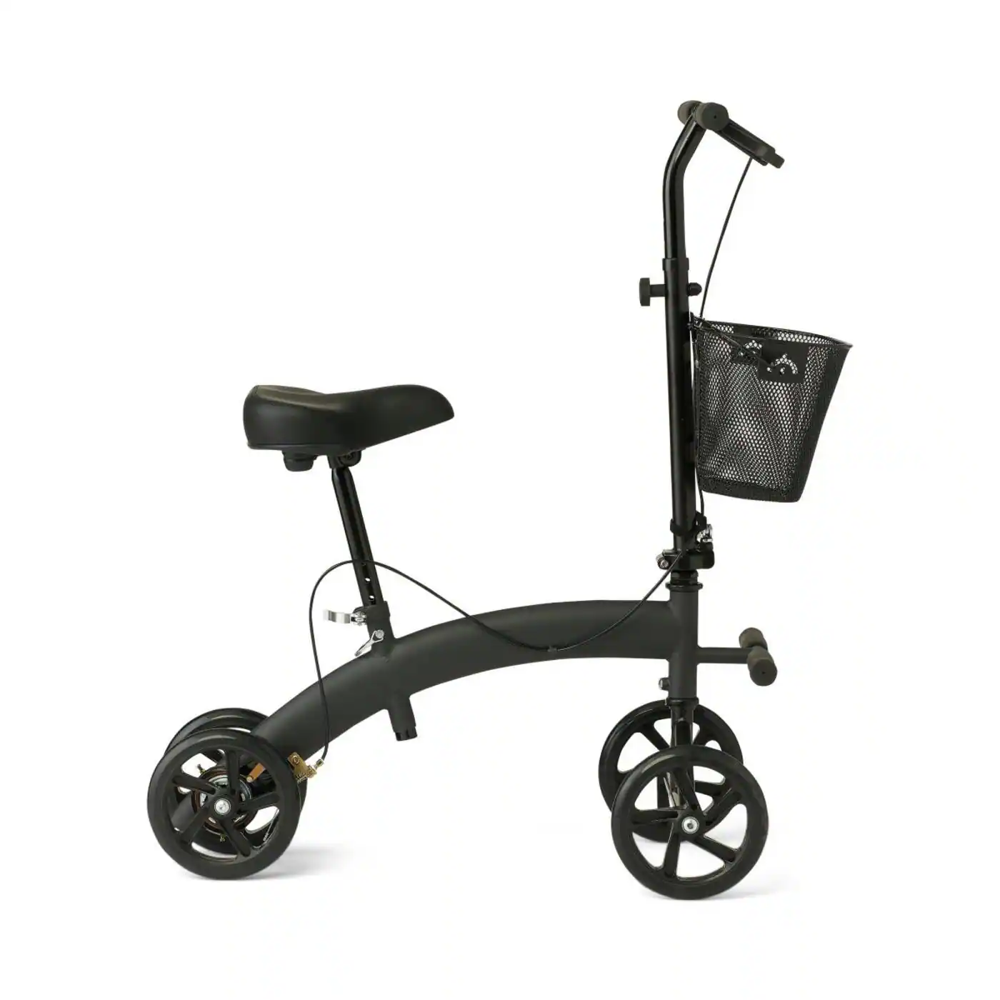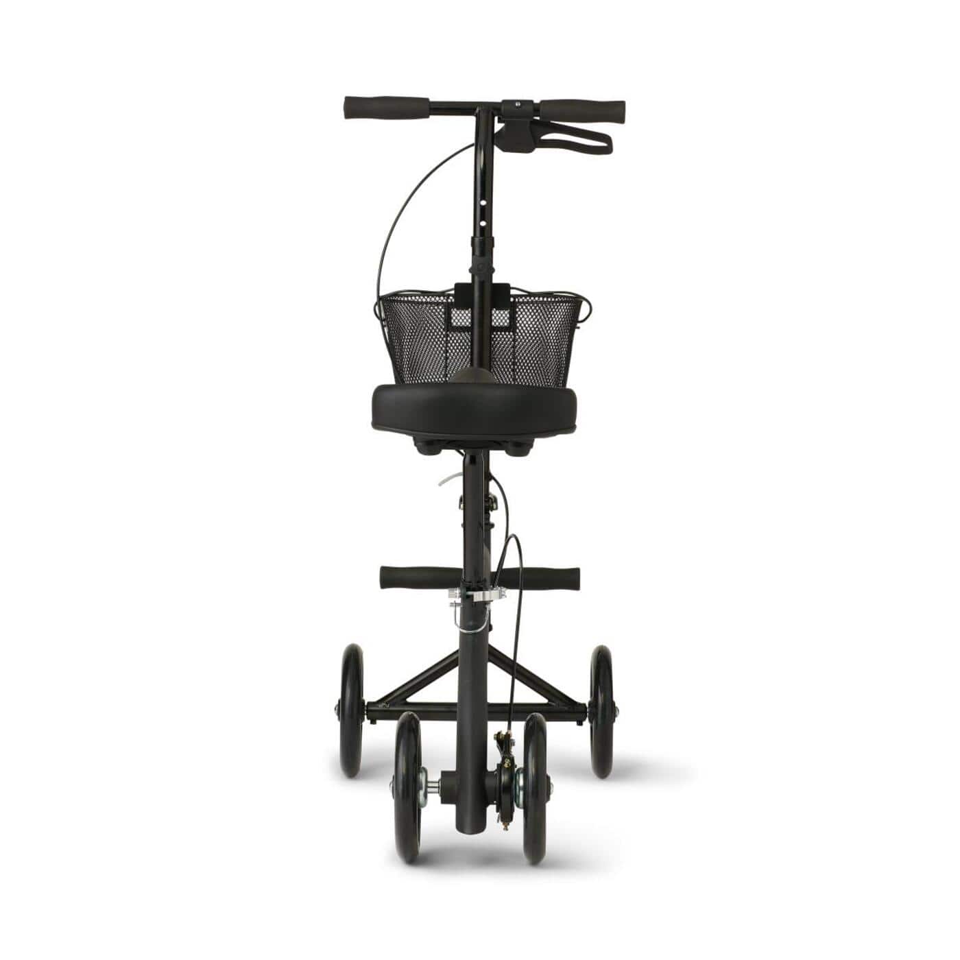 Seated scooter designed to provide stability for patients recovering from lower-leg injury. Made for indoor and outdoor use and can be a great crutch alternative. Padded seat for added comfort, convenient basket for added storage. Handle bar folds down for easy transport and storage.