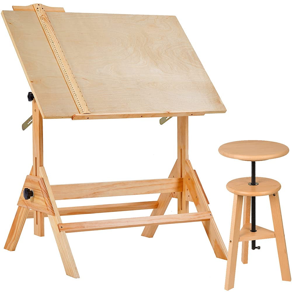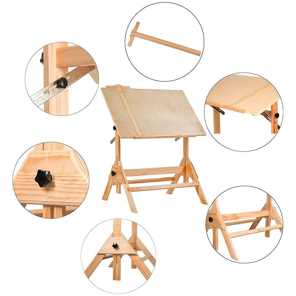 MEEDEN Adjustable Solid Wood Drafting Table with Angle Top, Natural Ample Working Surface Features a 23½D x 35½W tabletop with a smooth natural birch wood finish and a 25 builtin pencil ledge to keep your stationery organized Height & Tabletop Adjustable Height adjusts from 29½ to 37½ and the angle adjustable top tilts from flat to 45° providing a comfortable position for various tasks Sturdy and Stable Construction Handcrafted from solid pinewood this drafting table offers a sturdy work surface The cross support design eliminates lateral movement for a wobblefree experience MultiPurpose Usage Ideal for artists engineers crafters and hobbyists Suitable for use as an art table study desk home office desk or craft station Easy to Assemble Comes with clear instructions and a handy tool All small parts are organized in separate bags for easy assembly which takes about 20 minutes with two people Includes a bonus 24inch Tsquare with both inch and metric calibrations