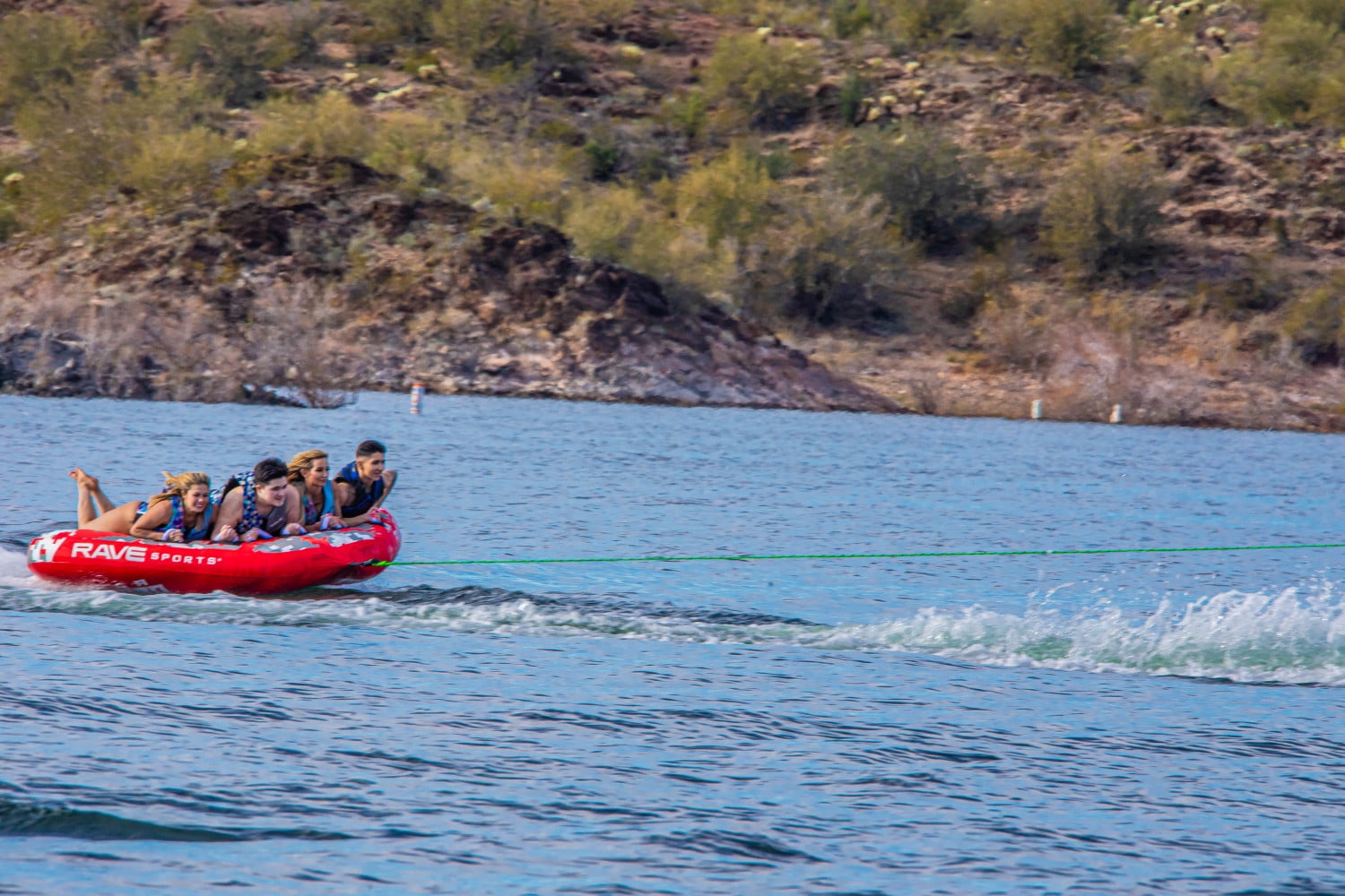 4 Rider Towable 680 lbs. (308 Kg) max rider weight If you think you’ve already been on the wildest tube ride of your life, then you haven’t tried the RAVE Sports Mega Mambo boat towable! Take your tubing experience to the EXTREME! 72″ x 98″ x 20″ (183cm x 249cm x 51cm) inflated. 74″ x 102″ (188cm x 259cm) deflated. Swept wing deck tube. Durable 840D Nylon cover. Heavy duty 28 gauge PVC bladder. Twin rear boarding straps. Large anti-chafe guard. 8 foam-filled handles with Neoprene knuckle guards. Quick connect tow point.
