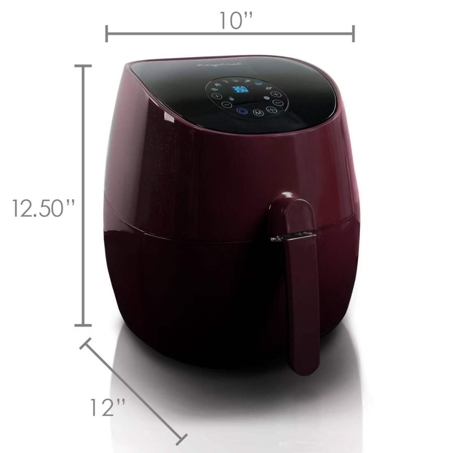 Voltage: 120V-60Hz / Power: 1350 WattsMax Temperature 400FCapacity: 3.5 quart7 Pre-programmed SettingsColor: BurgundyItem Measurements: 12″ Length, 10″ Width, 12.5″ Height