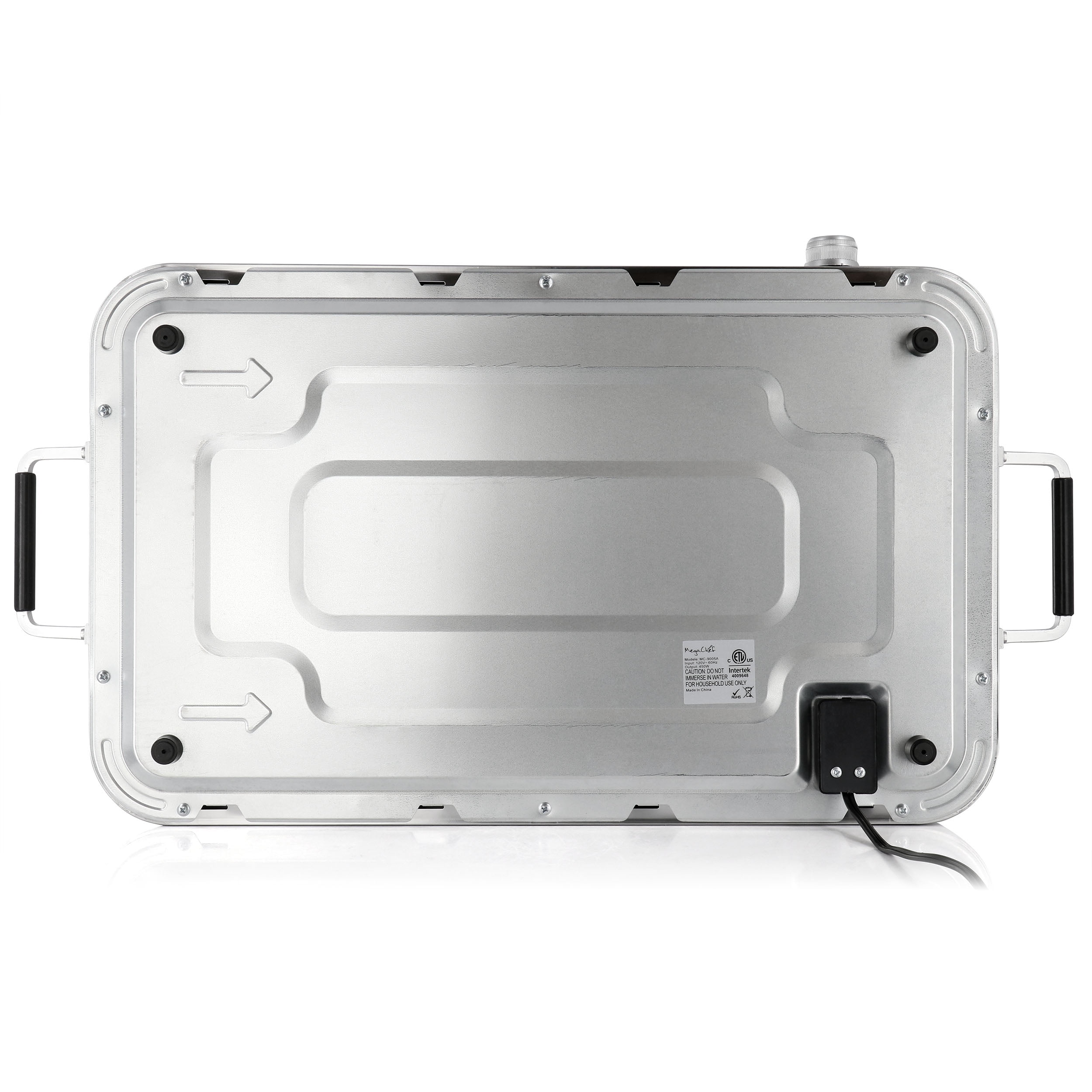 THREE 2.63QT BUFFET TRAYS: Each food grade stainless steel tray comes with its own utensil slotted and transparent lid that is perfect for serving up a variety of dishes while keeping food warm and fresh. ONE 8.6 QUART BAKING PAN: This large food grade stainless steel baking pan is oven-safe, allowing you to bake in the oven and transfering directly to warming tray. WARMING BASE: The food safe warming tray can be used with your own pieces or you can place appetizers and sides directly onto the base. TEMPERATURE CONTROL: Adjustable temperature setting allows you to set the perfect temperature ranging from low to high for all you buffet needs. Temperature range from 32 – 320 Degrees Fahrenheit. PERFECT FOR ALL EVENTS: Good food doesn’t have to be cold food. This warming tray and buffet warmer is portable and easy to transport for indoor events and outdoor events. EASE OF USE: Easy to use parts and pieces allows you provide and have a wide range of exceptional dining experiences. Mix and match trays from your favorites sides to delicious sauces and gravy’s to main courses and warm desserts all without the worry of cold food or the need to reheat anything. Set: 3 x’s 2.63 Quart Serving Trays, 8.6 Quart Baking Pan, 3 Clear Slotted Dome Lids with Utensil Slots Color: Silver Material Stainless Steel Lightweight construction with carry handles Removable trays and baking pan Heat/Power Indicator Light Temperature Light 120Volt/60Hz 430 Stainless Steel Grade 450 Watts Temperature ranges from 32-320 Degrees Silicone Coated Grips Dishwasher Safe Serving Trays, Hand Wash Others Oven Safe Pans up to 356 Degrees Set includes: Three serving trays with clear lids, one baking pan and one heating base Per Item Measurements: Base- 13.25in length 25.7in width with handles, 21.5in width, 2.25in height, 3.9lb weight Baking Pan- 13in length, 25.7in width with handles, 21.5in width, 2.5in height, 2.25lb weight Individual Trays- 12.75in length, 6.9in width, 4in height with lid, 2.25in height, 0.95lb weight Combined dimensions-13.25in length, 25.7in width, 7in height height, 9lb weight