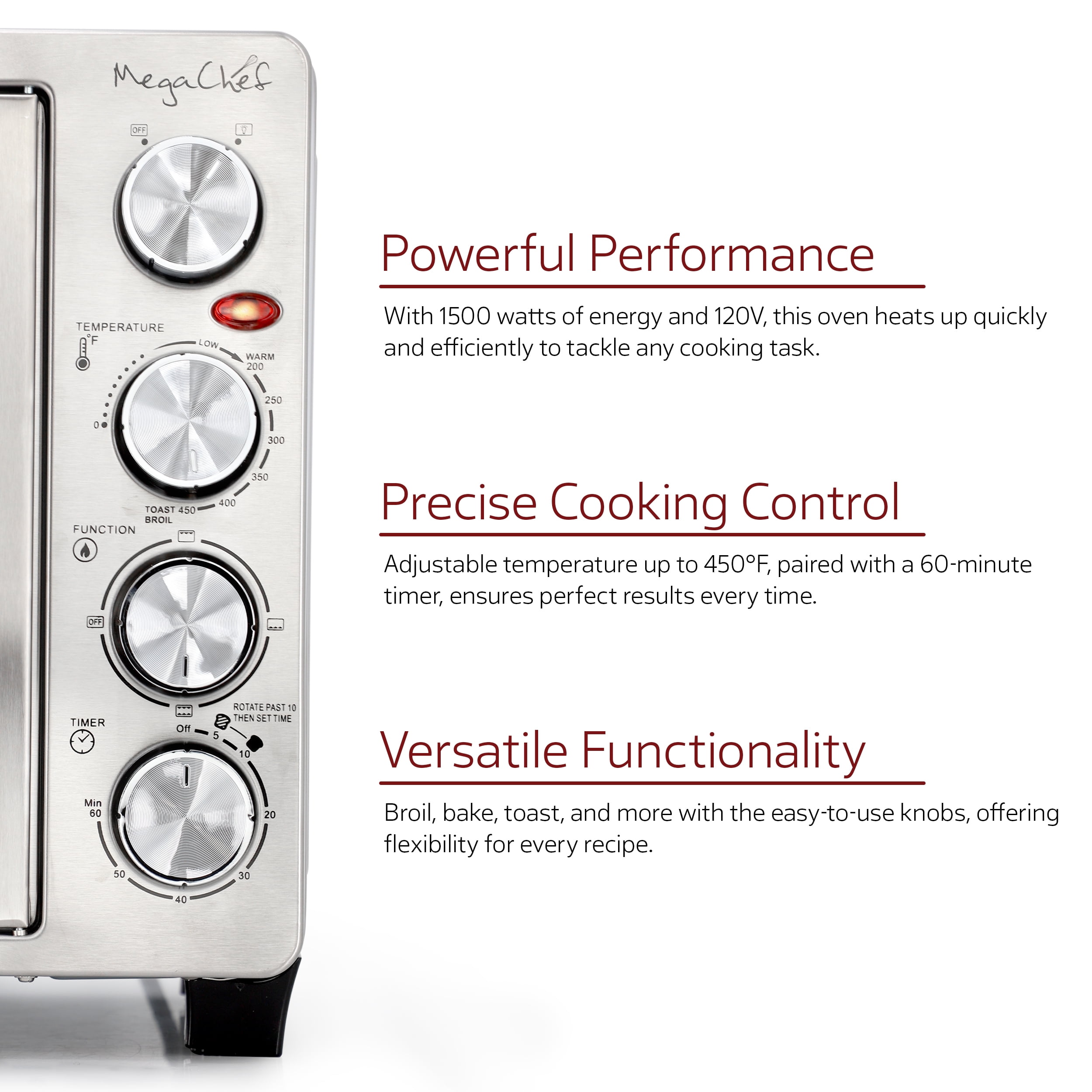 60 Minute Timer Up to 450 Degree Temperature Range Function Switch: Broil, Bake, Toast