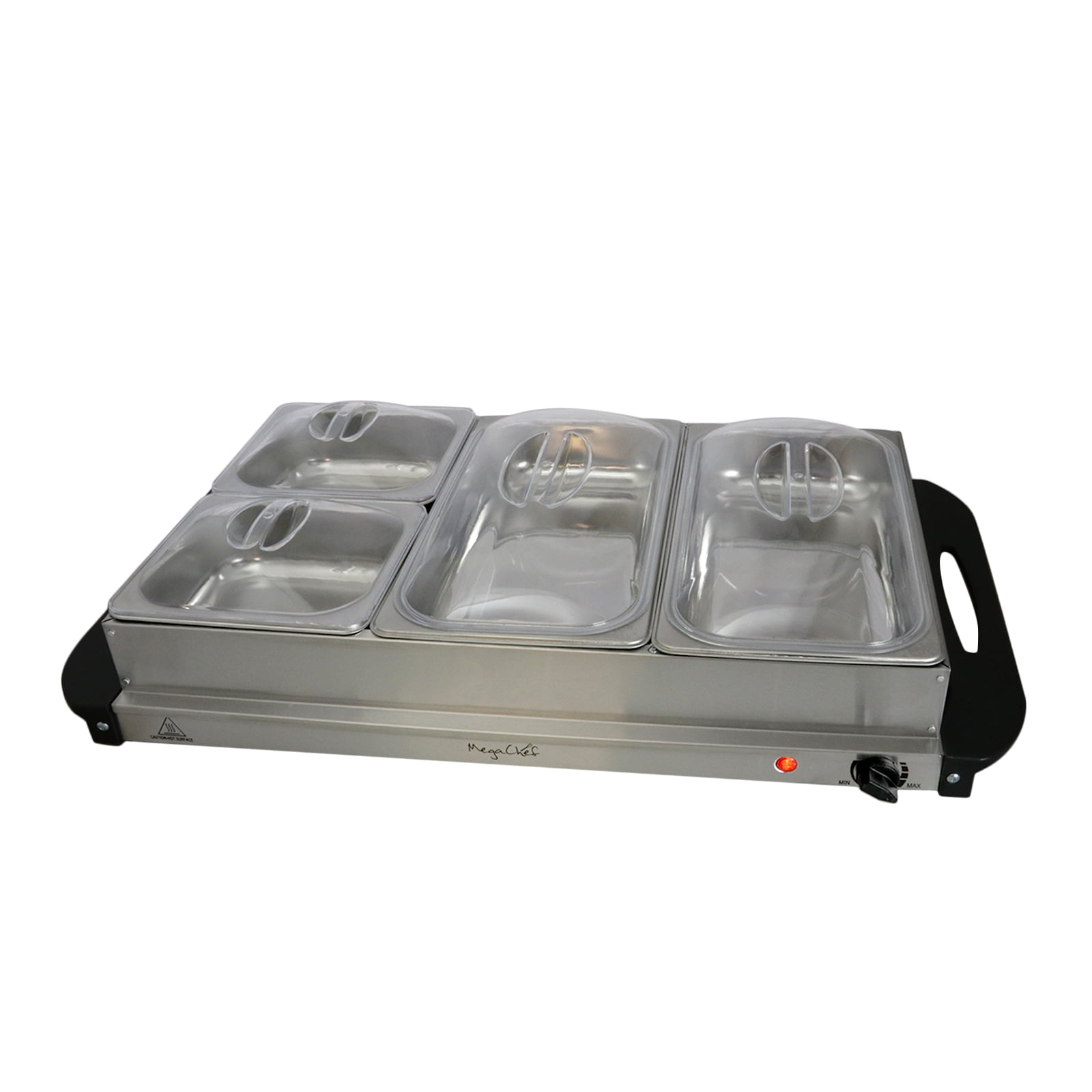 The MegaChef Buffet Server & Food Warmer With 4 Removable Sectional Trays, Heated Warming Tray and Removable Tray Frame are designed with you in mind. This ultimate party sidekick will make your guests feel as though they are being served a delicious hot meal at the most exclusive banquet. You will love the versatility of this wonderful buffet server at your next party or gathering. If you are in need of keeping prepared meals warm enough to serve through out the day or night this server has you covered. This large capacity buffet server and warming tray offer you the ability to serve food that may be warmed in the stainless steel containers or on the warming tray which is the base of the unit. The warming tray comes with hard mounted side handles to ensure that you can easily transport your buffet server from one location to another without worry. This lightweight and compact portable food warmer is safe to use on your kitchen counters or serving tables. Having quality stainless steel containers to serve your meals in will give you piece of mind, and you’ll need not worry about leaving these containers in the sink overnight! MegaChef understands that you have a variety of surfaces on which meals may be served, for added protection this unit features 4 bottom legs which provide spacing between your surfaces and the buffet server. In addition to the large capacity stainless steel food warming containers, you’ll also have the option of using the base warming tray to keep sauces, appetizers and much more warmed up for your guests by using the large base warming tray. All in all, this unit will have you covered from the beginning of your party to the very end!