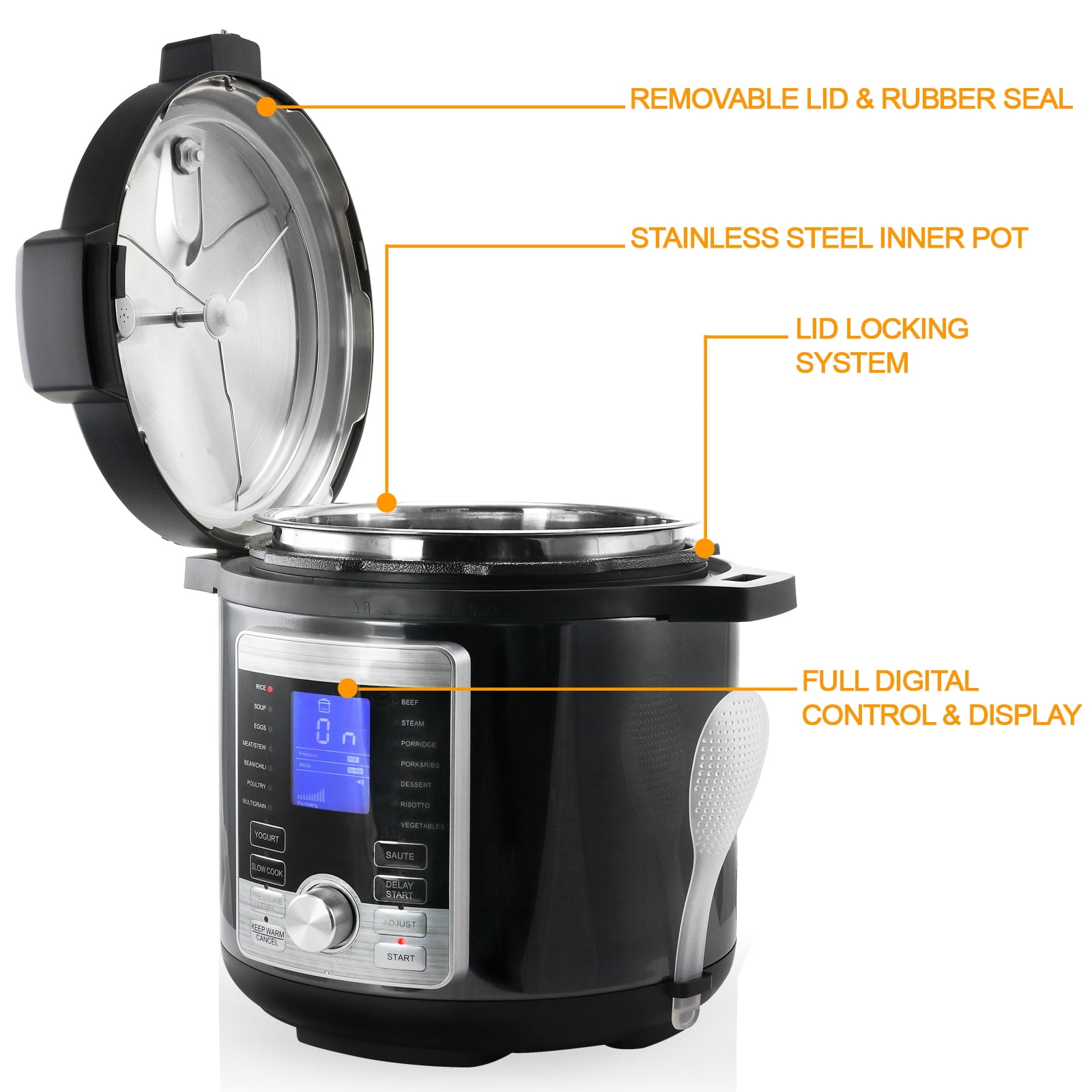 Digital Pressure CookerWatts: 1000, 120V~60HzMaterial: Stainless Steel, PlasticFinish: BrushedEasy to use digital interface14 programmable optionsSafe to use pressure release valveEmbossed measuring guideSafety release lidDetachable Power cordDrip trayIncludes:One 6qt. pressure cookerOne removable stainless steel cooking potOne 9.5″ tempered glass lidOne Detachable Drip TrayOne Plastic Serving SpoonItem Measurements:Pressure Cooker: 12″ diameter, 14″ height, 6qt. capacity, 10.15 lbs. weight