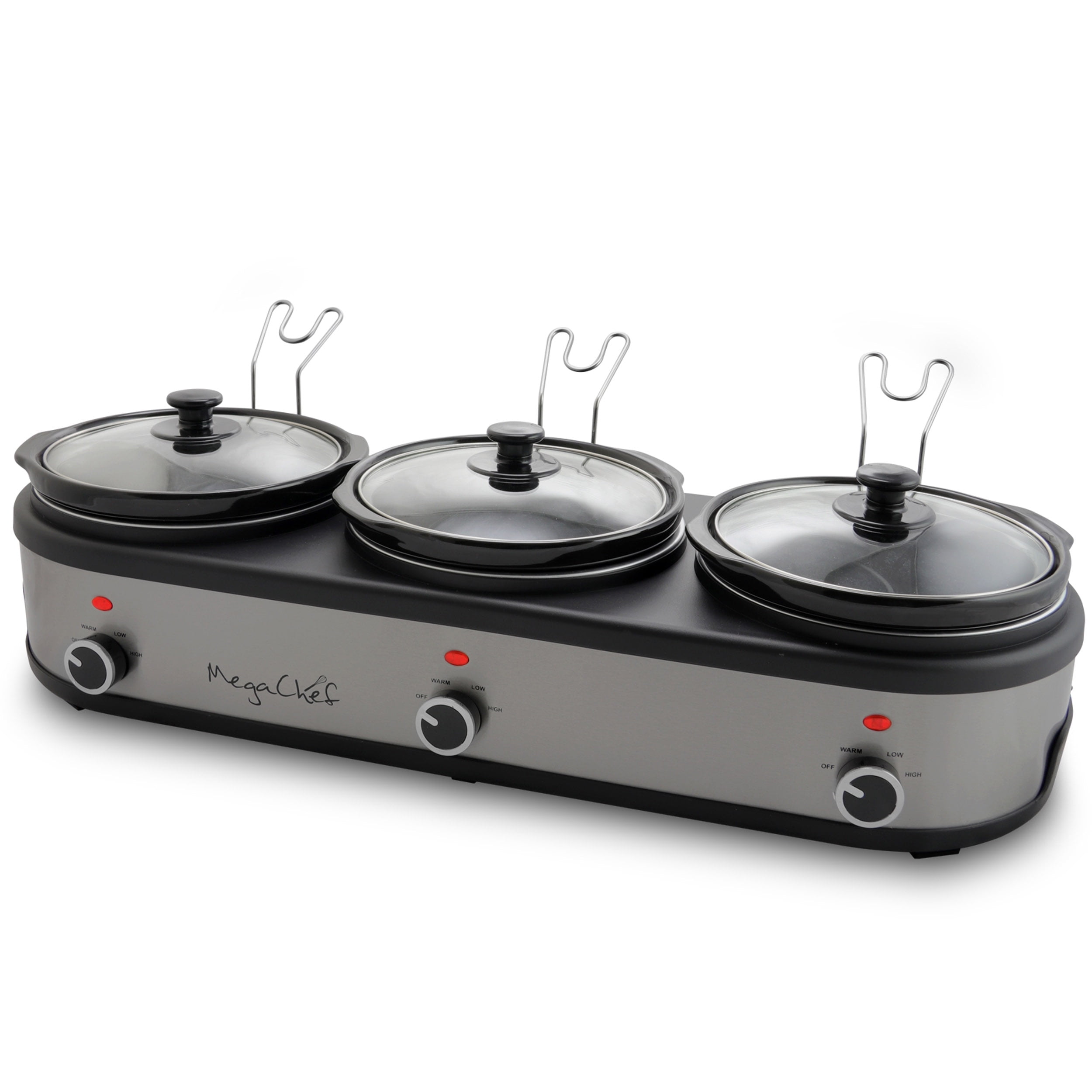 MegaChef Triple 2.5 Quart Slow Cooker and Buffet Server in Brushed Silver and Black Finish with 3 Ceramic Cooking Pots and Removable Lid Rests