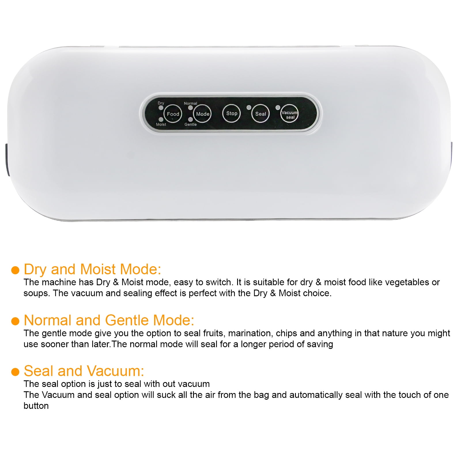 The MegaChef Home Vacuum Sealer and Food Preserver with Extra Bags is a must have for any household. This vacuum sealer keeps food fresh up to 5x longer, preserves freshness, taste, and aids in preventing freezer-burn. Make cooking experience and meal preparation easier, more economical and faster. The dry and moist options provide your food with best possible preservation based on the different food types and storage requirements. Includes 10 large sized individual bags and a 10 Foot roll for larger food items. Food Bags are BPA Free, so you never have to worry about storing your favorite foods. This Megachef compact food saver sealer has a small and compact design to easily store when not in use. Space saving size makes it perfect for dorm rooms, boats, RVs, or motor homes where space might be limited. Vacuum Sealer Color: White Dry and Moist Food Mode Normal and Gentle Mode Seal and Vacuum Function Built-In High-Density Heating Strip Drip Tray Feature Equipped Locking Mechanism Preserves food up to 5x longer than conventional storage. Includes: One Vacuum Sealer 10 Storage bags On 10 Foot Roll Item Measurements: Vacuum Sealer: 16″ length, 6″ width, 3″ height, 2.12lbs. weight