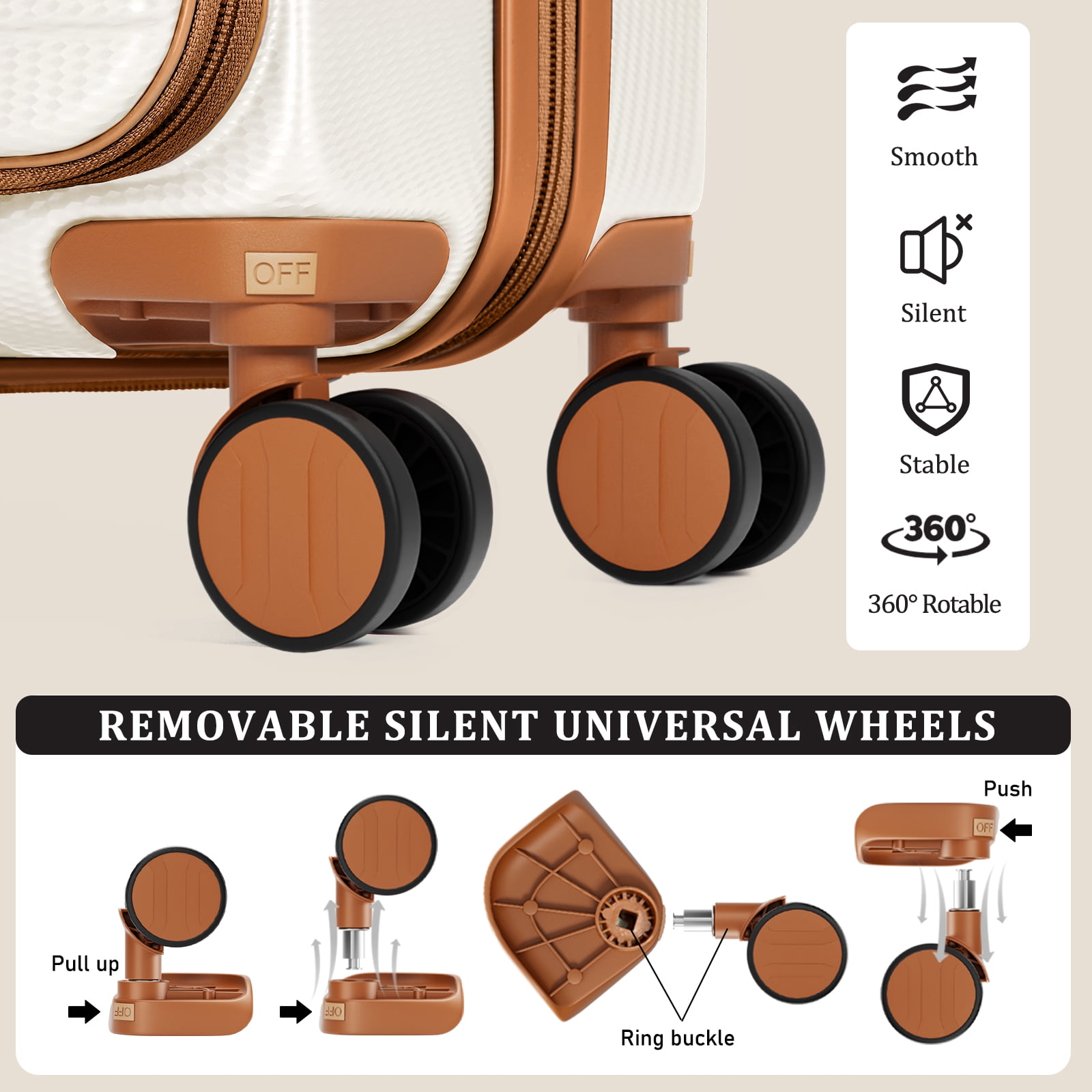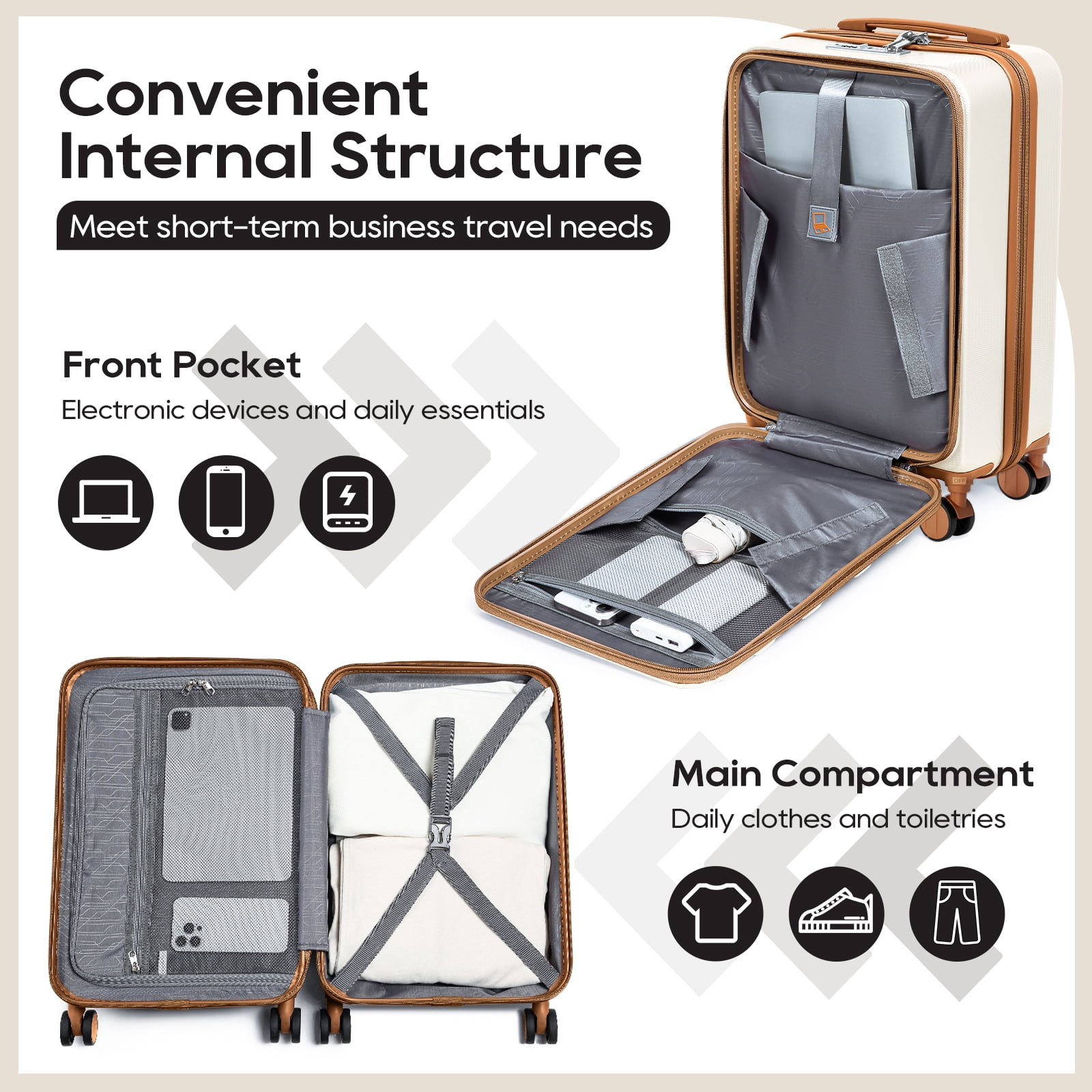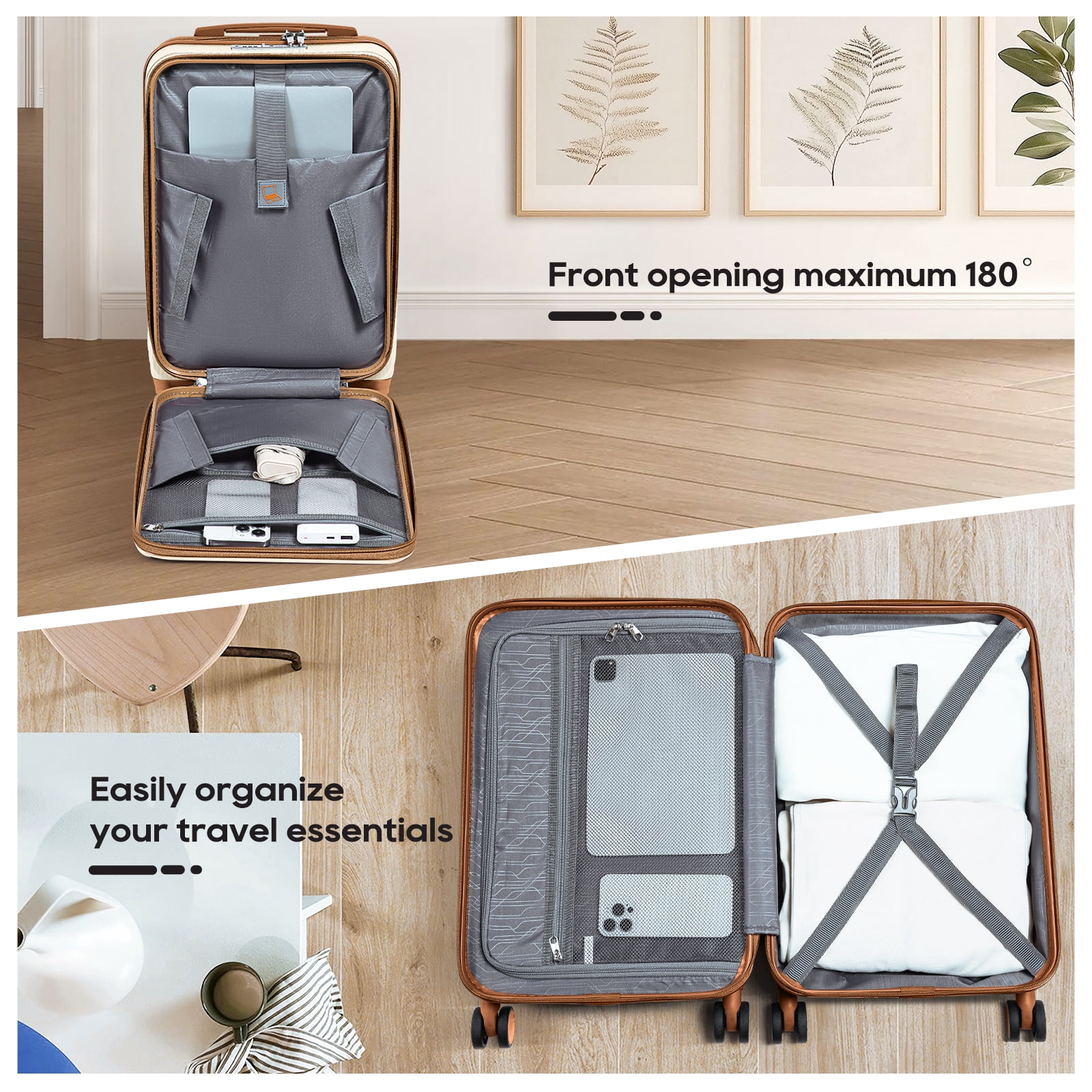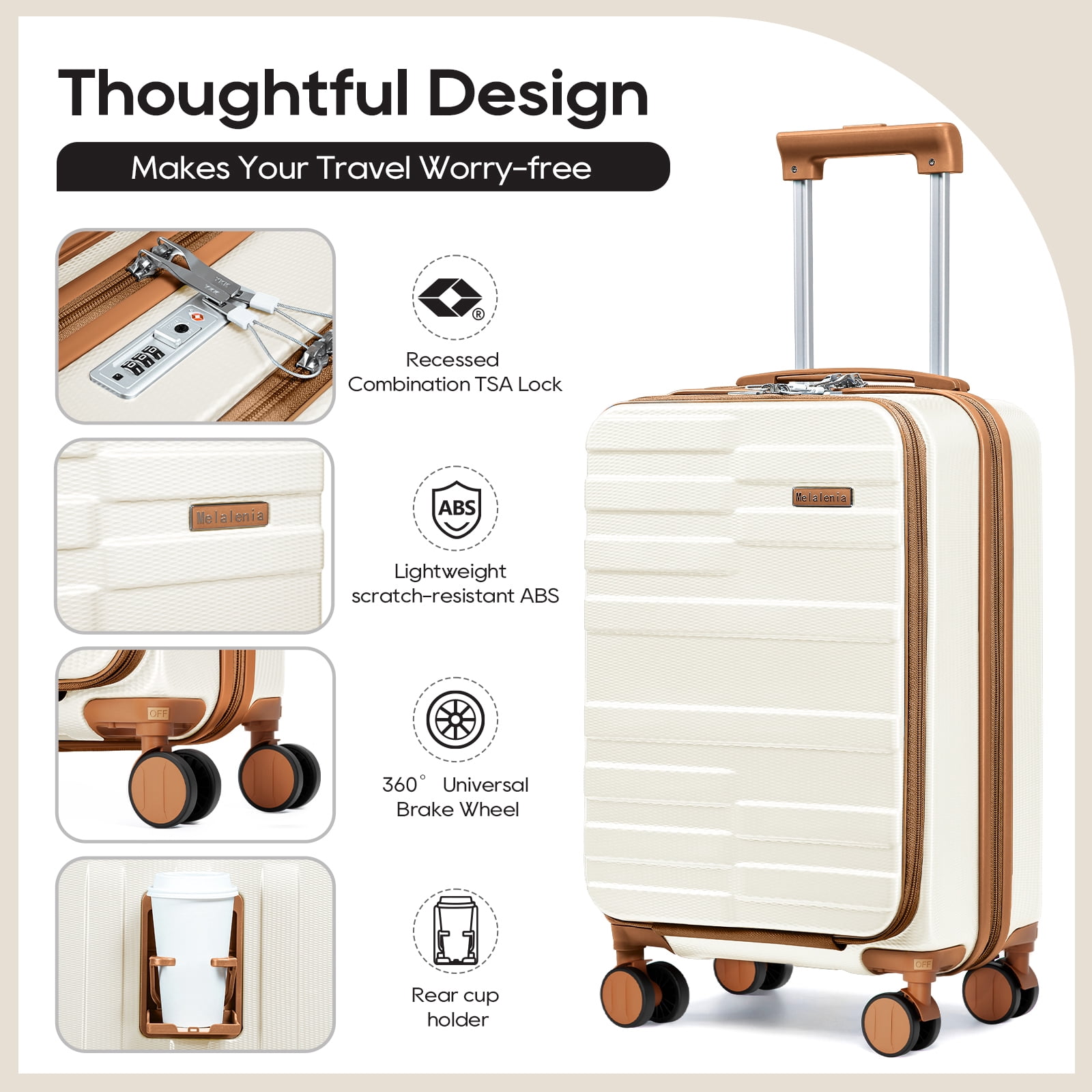 Airline approved 20″ carry-on business travel case with portable laptop compartment. Hard shell is lightweight and durable. Makes travel more convenient. Made of ABS material, this luggage set strikes a perfect balance between lightweight construction and durability. The hard shell surface protects against scratches, making it an ideal choice for both business and personal travel. The 20-inch front-opening carry-on suitcase (13.9″*8.66″*20.4″, 9 lbs) and matching handbag (17.3″ x 16.9″ x 8.6″, 1.3 lbs) and matching toiletry bag (11.8″ x 5.9″ x 4.7″, 0.3 lbs) provide a complete three-piece set to meet all your travel needs. 20-inch suitcase with zippered and mesh compartments inside. Travel tote can be hung on the suitcase and has multiple independent pockets. Toiletry bag can store cosmetics and toiletries, and can effectively classify clothing and cosmetics The carry-on luggage includes 360° brake-rotatable spinner wheels, a full-aluminum three-section telescopic handle, a recessed TSA lock, smooth YKK zippers, soft silicone handles, and four-foot spike hooks, ensuring your journey will be easier and more enjoyable. This luggage features a TSA-approved combination lock for added security. It also features a convenient luggage cup holder that allows you to access your drinks at any time, ensuring you travel comfortably and stay connected.