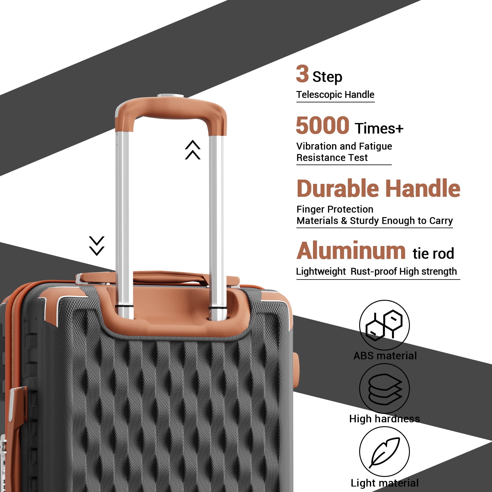 【7-piece luggage set】: 1 storage bag, 1 travel backpack, 1 14-inch cosmetic bag, 1 18-inch carry-on suitcase, 1 20-inch carry-on suitcase, 1 24-inch medium suitcase, 1 28-inch checked suitcase 【7-piece luggage set】: 1 storage bag, 1 travel backpack, 1 14-inch cosmetic bag, 1 18-inch carry-on suitcase, 1 20-inch carry-on suitcase, 1 24-inch medium suitcase, 1 28-inch checked suitcase 【Easy Steering in Narrow Spaces】Silent Dual Spinner wheels rotate 360°, providing superior maneuverability and a smooth glide in every direction.Save time and effort a relaxing and enjoyable trip。 【Easy Steering in Narrow Spaces】Silent Dual Spinner wheels rotate 360°, providing superior maneuverability and a smooth glide in every direction.Save time and effort a relaxing and enjoyable trip。 【TSA Lock & YKK Zipper】The Built-in TSA lock does not have to be forced open and damaged during inspection. It ensures the safety of your valuables and facilitates your passage through security. The YKK zippers allow travelers to effortlessly open and close their luggage, which adds a safety and convenience to the entire trip. 【TSA Lock & YKK Zipper】The Built-in TSA lock does not have to be forced open and damaged during inspection. It ensures the safety of your valuables and facilitates your passage through security. The YKK zippers allow travelers to effortlessly open and close their luggage, which adds a safety and convenience to the entire trip. 【Corner Protection & Side Stand Feet】Three-Claw Corner Protection can withstand impacts, so you no longer have to worry about your luggage sets for women being damaged or damaged during your trip. Anti-collision feet provide support when the luggage is placed on the floor and prevent wear and tear. 【Corner Protection & Side Stand Feet】Three-Claw Corner Protection can withstand impacts, so you no longer have to worry about your luggage sets for women being damaged or damaged during your trip. Anti-collision feet provide support when the luggage is placed on the floor and prevent wear and tear. [Freely Adjustable Telescopic Pull Rod & Carry Handles] Equipped with an adjustable aluminum three-section telescopic pull rod, the luggage can be adjusted to different heights to meet different height requirements. TPR soft handle with straight handle makes you more comfortable when need to carry [Freely Adjustable Telescopic Pull Rod & Carry Handles] Equipped with an adjustable aluminum three-section telescopic pull rod, the luggage can be adjusted to different heights to meet different height requirements. TPR soft handle with straight handle makes you more comfortable when need to carry