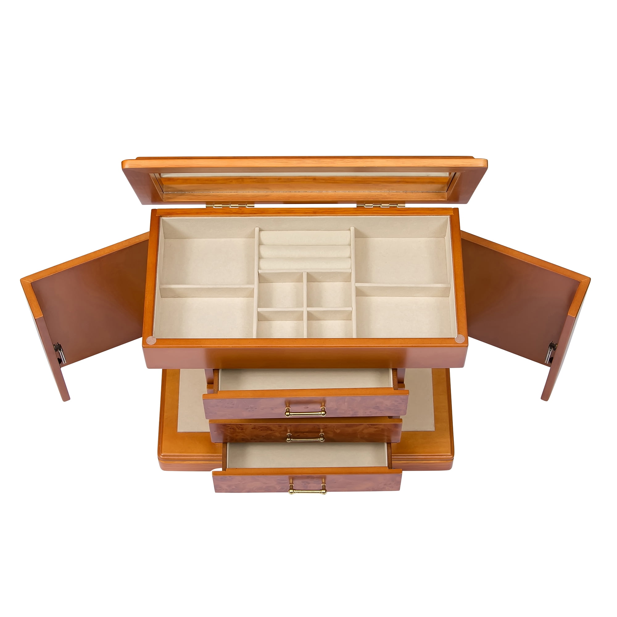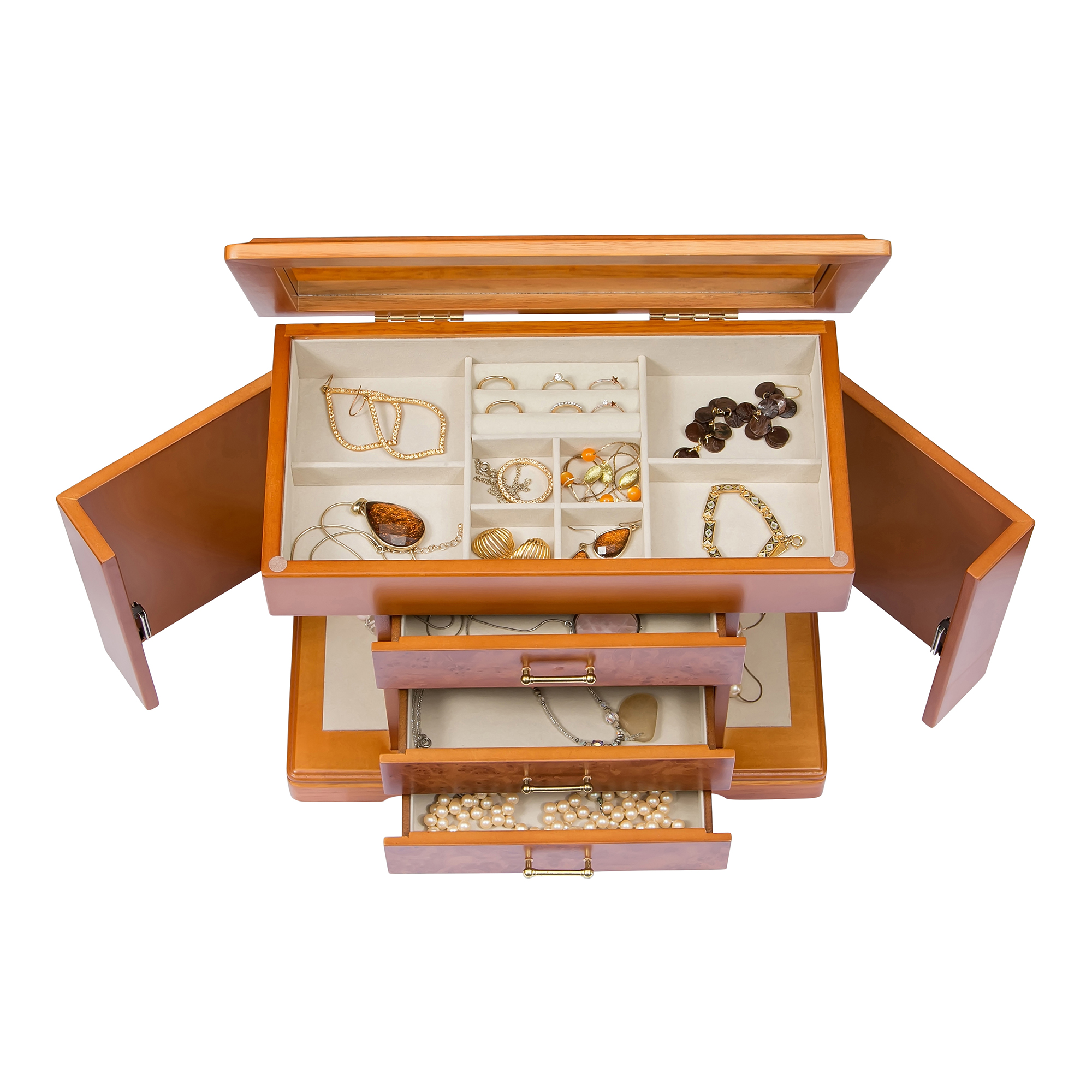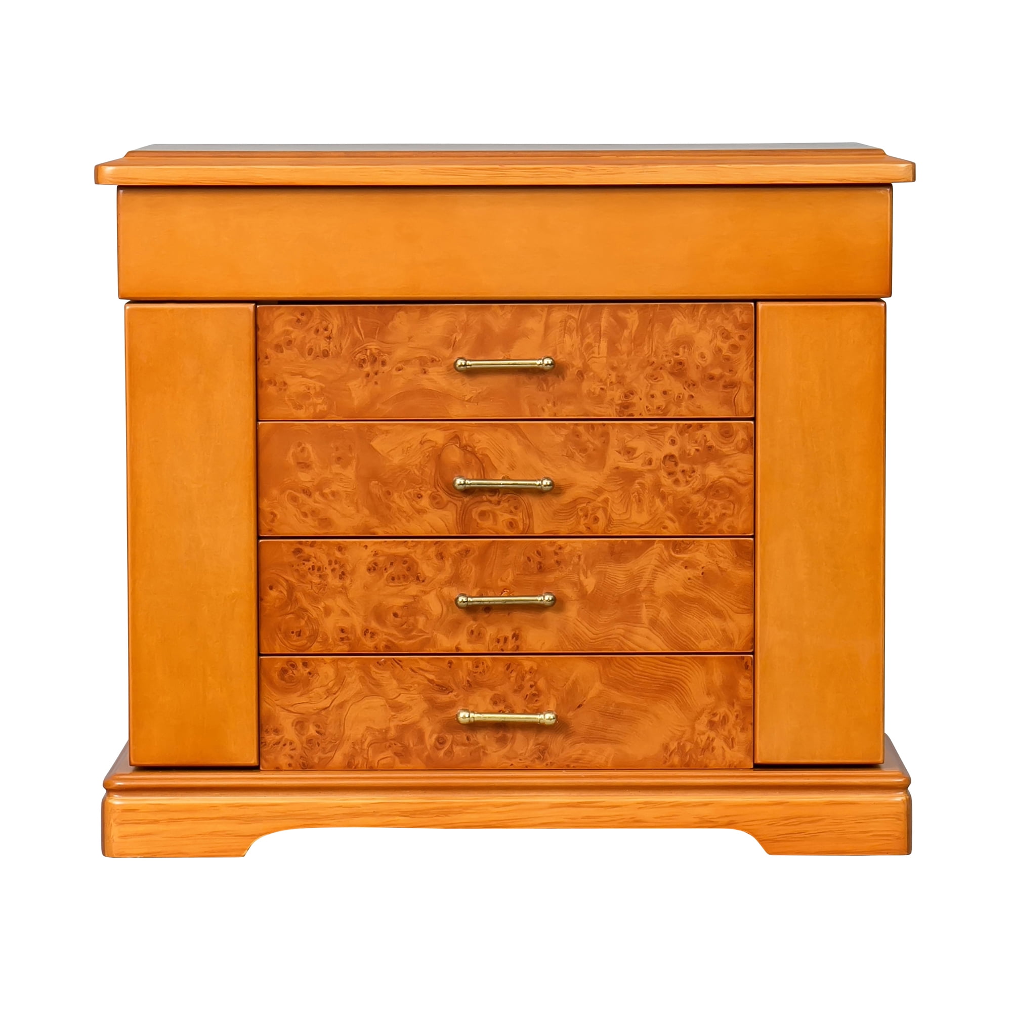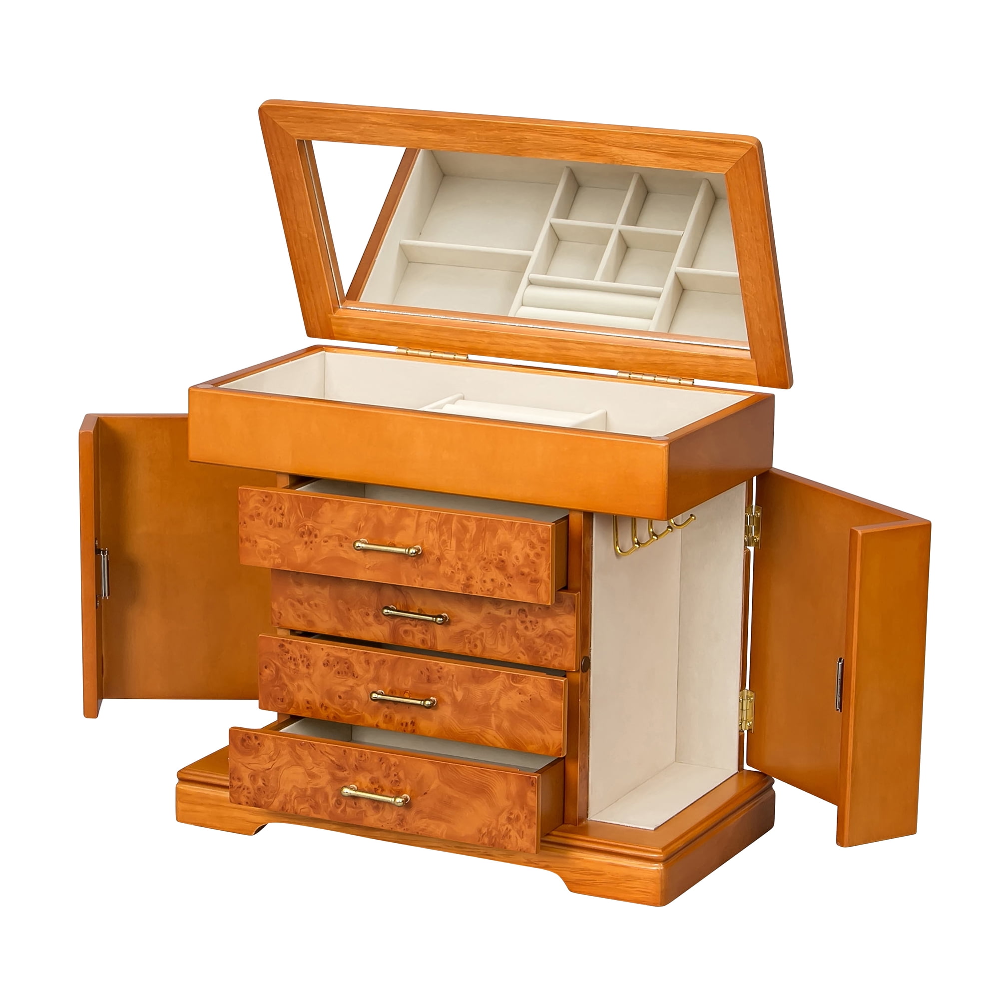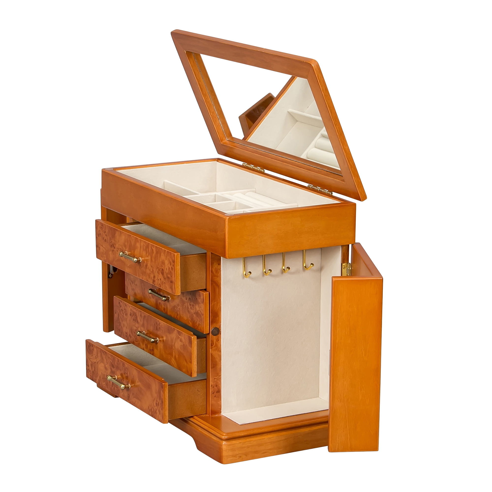 Burlwood oak finish Upright Scroll footed platform base Lift lid with full interior mirror Top compartment has nine sections – eight open area sections one ring roll section Dual necklace closets house four hooks each – eight in all Four drawers offer open area storage Hand lined in ivory sueded fabric Gold tone drawer pulls and hardware Product Dimensions:13 1/2″ x 7″ x 11 5/8″