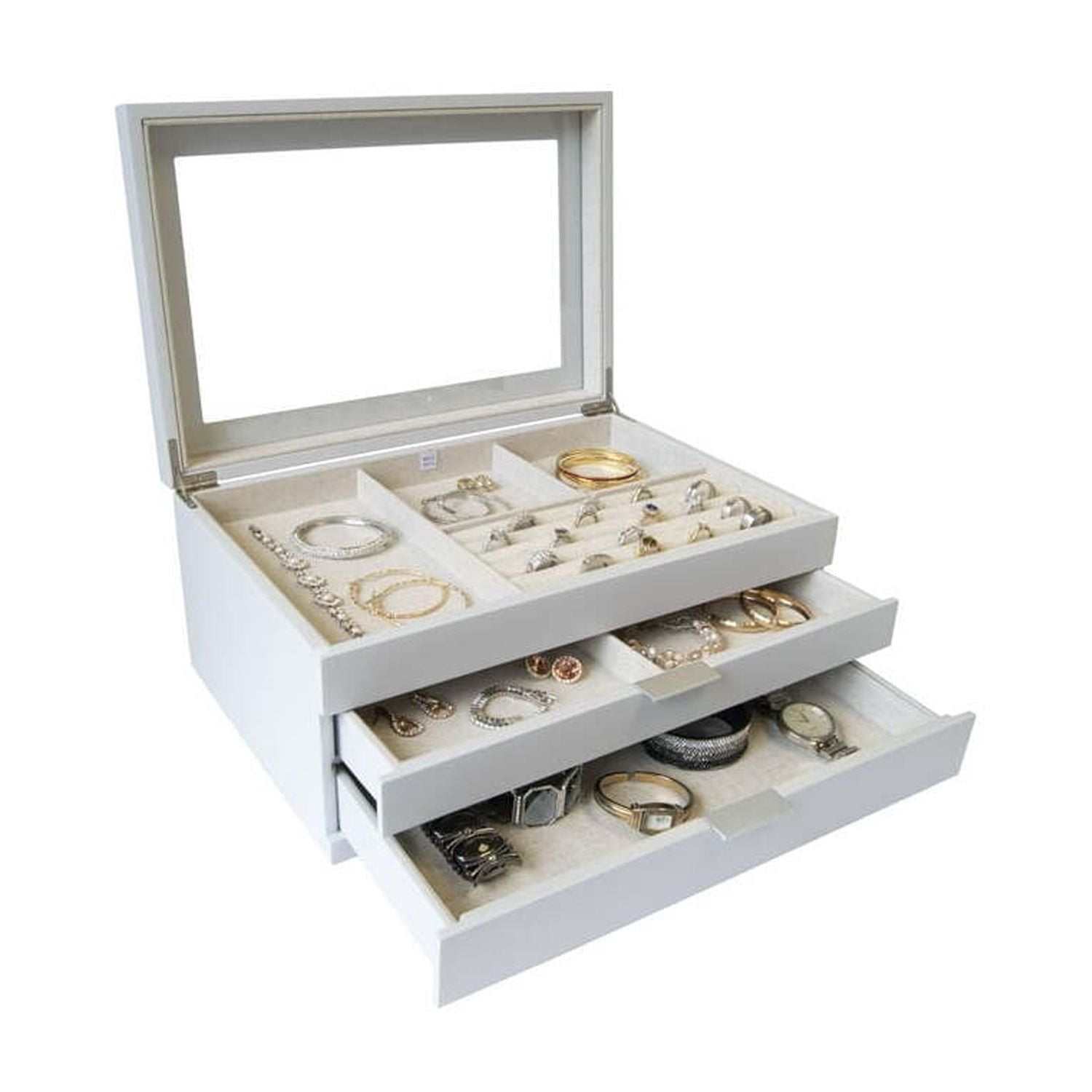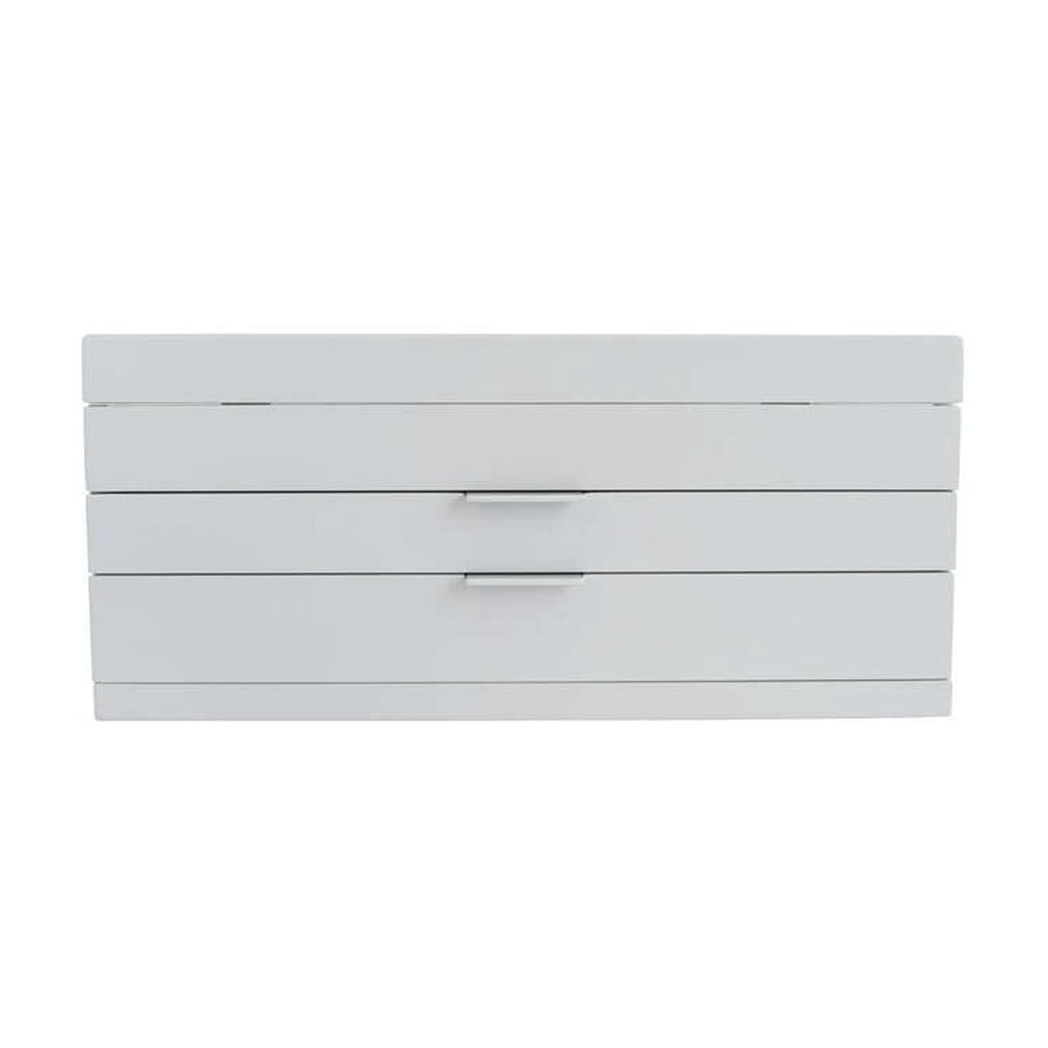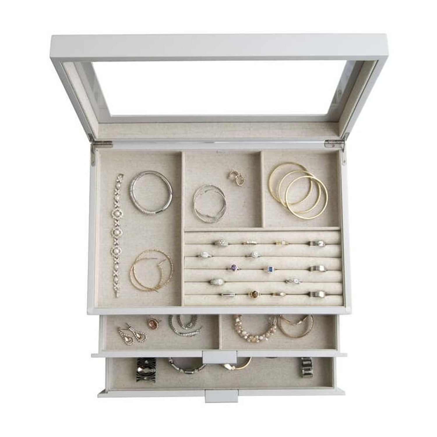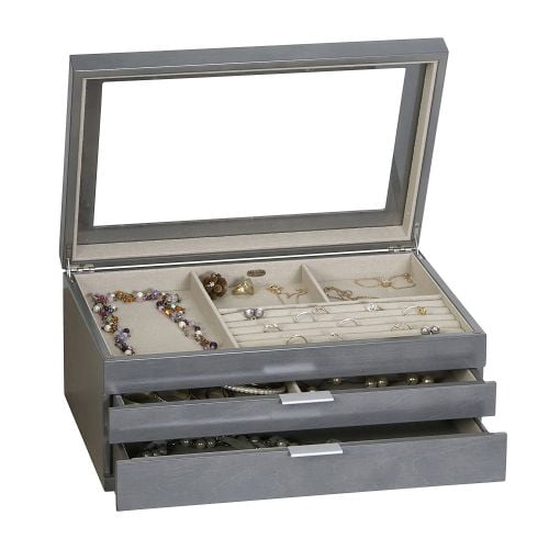 Fresh and modern with the casual sophistication of today’s design, the Mele and Co Misty glass top jewelry box makes a sublime presentation. Featuring an ample ring roll section, chic linen weave lining and an elegant grey wood grain finish, this jewelry chest is simple, yet sumptuous. Oceanside Grey finish glass top wooden jewelry box. Lift lid with clear viewing window. Top compartment features a large ring roll section, large full depth open area section and two smaller equally sized sections. Two drawers. Top drawer offers four equally sized sections. Bottom drawer offers open area storage. Hand lined in natural color linen weave fabric. Brushed metal silver tone drawer pulls and compass hinges. Features Mele and Co logo plate inside. 15″ x 10″ x 6 1/2″.
