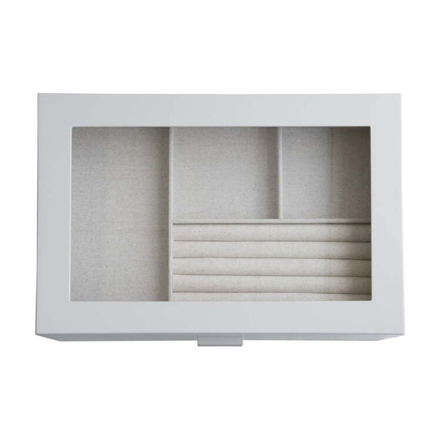 Lift lid with glass top Large ring roll section plus three open area sections Two drawers Top drawer offers for equally sized sections Bottom drawer offers open area storage Hand lined in natural color linen weave fabric