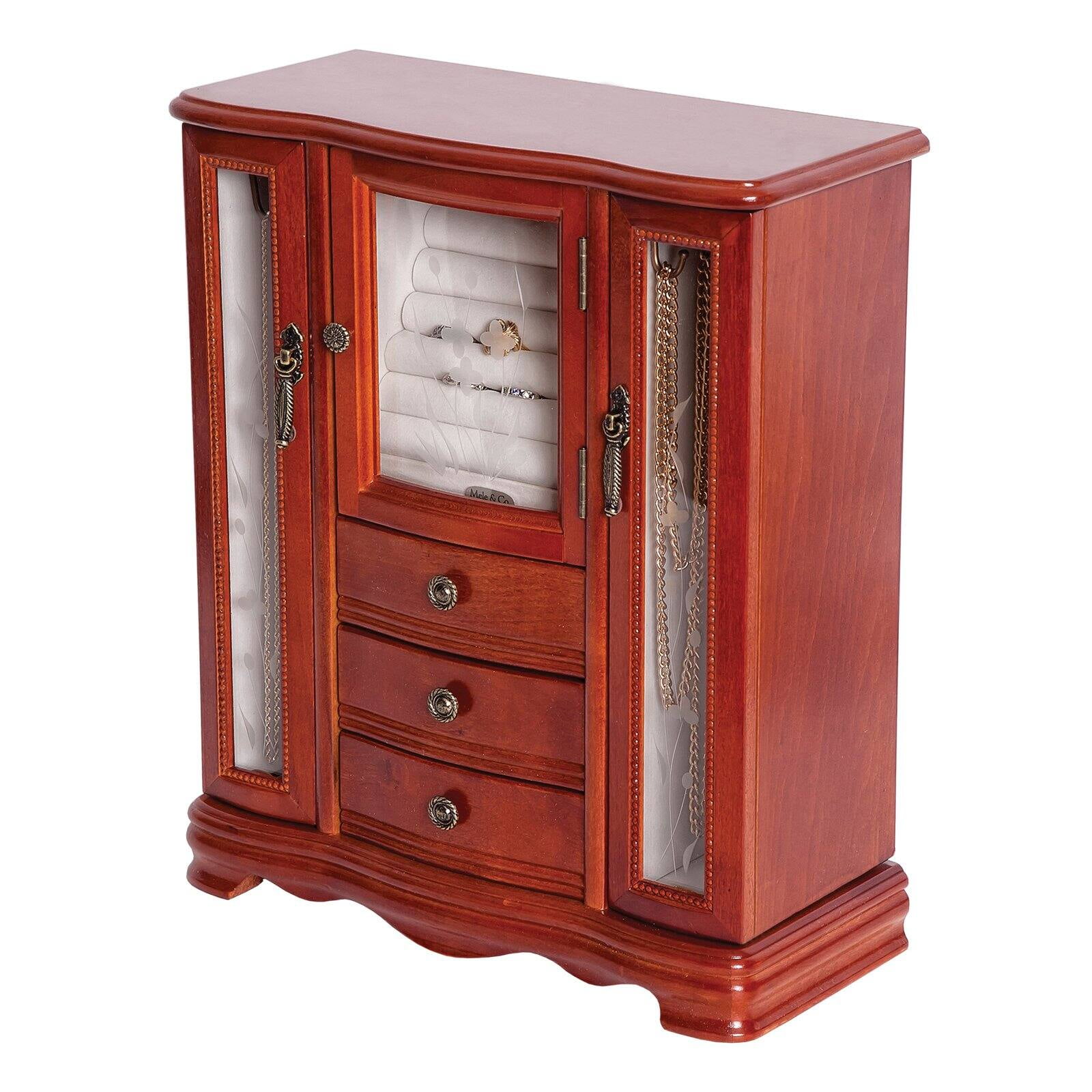 Richmond Wooden Jewelry Box by Mele & Co.. Traditional styling and delicate accents give the Mele & Co. Richmond jewelry box an unmistakable elegance. Its decorative etched glass panels, ring roll closet, and three drawers make this jewelry chest an exquisite way to display your treasures. Accessories not included. Features: Upright Scroll-footed platform base Dual necklace closets feature etched glass doors Mirrored back and house six hooks each Ring roll closet with etched glass door Three open drawers Antiqued brass tone drawer and door pulls Hand lined in suede fabric Materials: Composite Wood, Glass, Metal Dimensions: 11″L x 5″W x 13″H Weight: 5.25 lbs