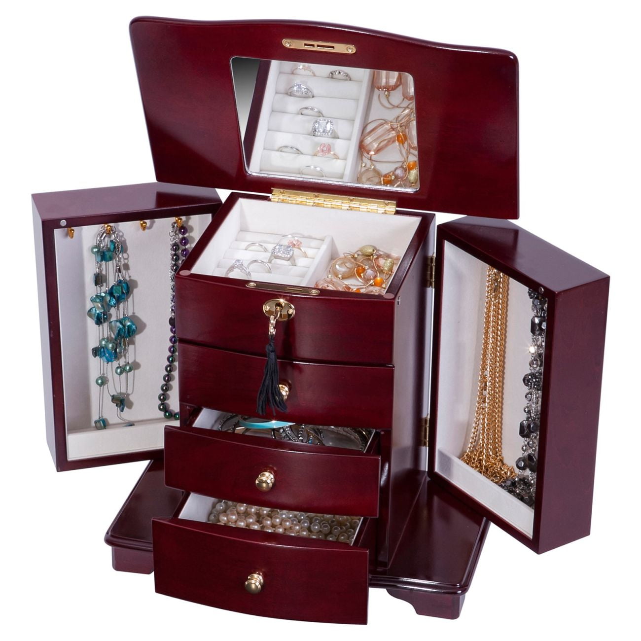 Beautifully crafted in a timeless style, the Mele Designs Waverly jewelry box is unquestionably classic. Its deep cherry finish, locking top compartment and dual necklace doors offer superb storage in an upscale package.Cherry finish wooden jewelry box. Upright. Scroll-footed platform base. Scalloped lift lid with interior mirror. Locking top compartment has one section and ring rolls. Dual necklace doors feature catch panels and house four hooks each. Three open drawers. Gold tone drawer pull