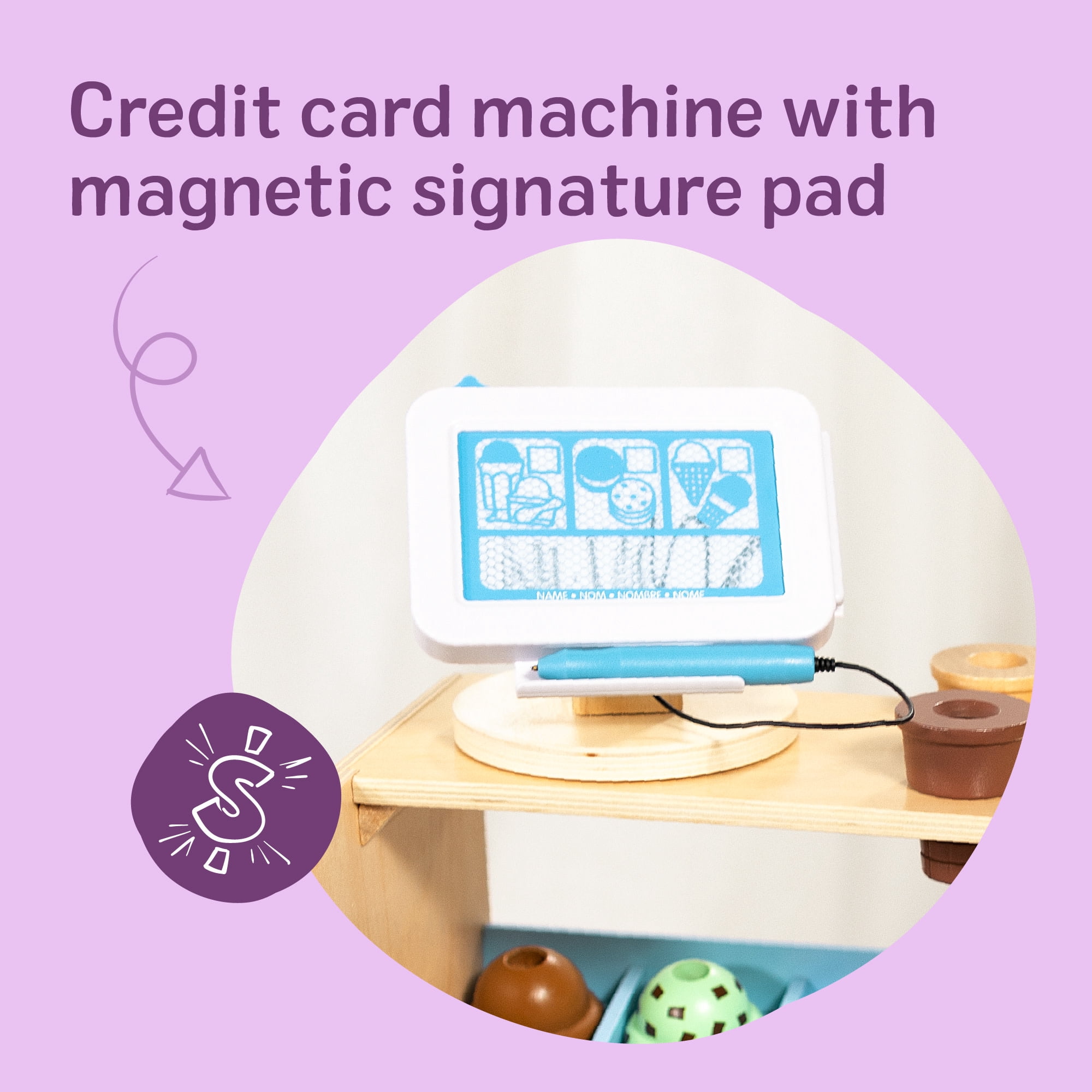 Order, create, and serve cool pretend play frozen treats with this sturdy wooden ice cream shop counter featuring a soft serve dispenser, magnetic write-on ordering and payment tablet, magnetic menu board, display area, and lots of storage Includes 2-part soft serve swirls, wooden ice cream scoops, sandwiches, and cones, a scooper that lifts scoops, soft roll-up waffle cone, cup, milkshake cup, straw, activity card, loyalty card, play credit card Top stackable scoops with play sprinkles and dip into snap-on hot fudge topping; create single flavor or mixed swirl soft serve; put ice cream “to go” in the tub with removable lid; swipe play credit card in machine with magnetic signature pad Helps kids develop fine-motor, sorting, and counting skills and promotes imaginative play and storytelling Makes a great gift for 3- to 7-year-old boys and girls, for hands-on, screen-free play; product made with FSC-certified materials that support responsible forestry; applies to new inventory only (FSC C156584)
