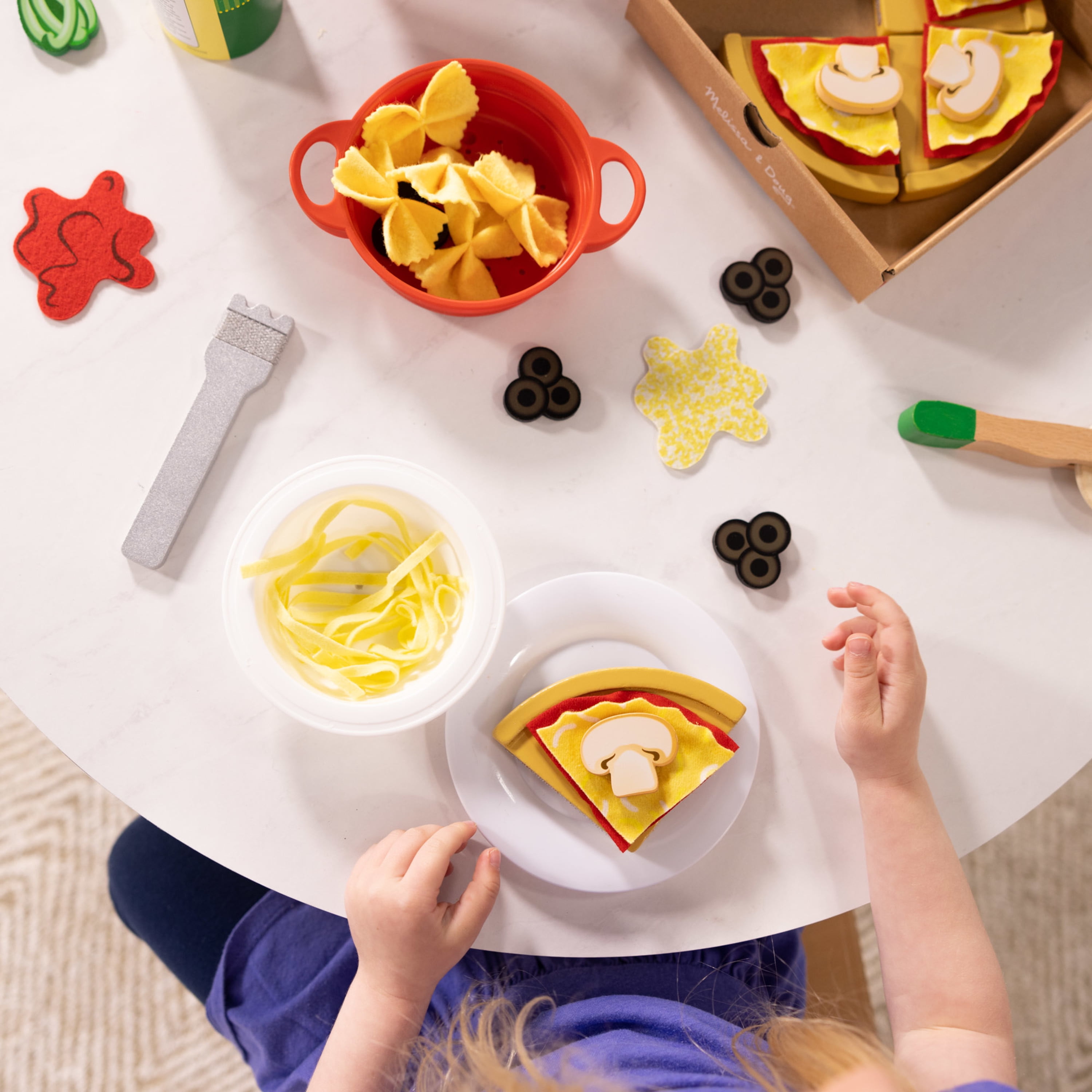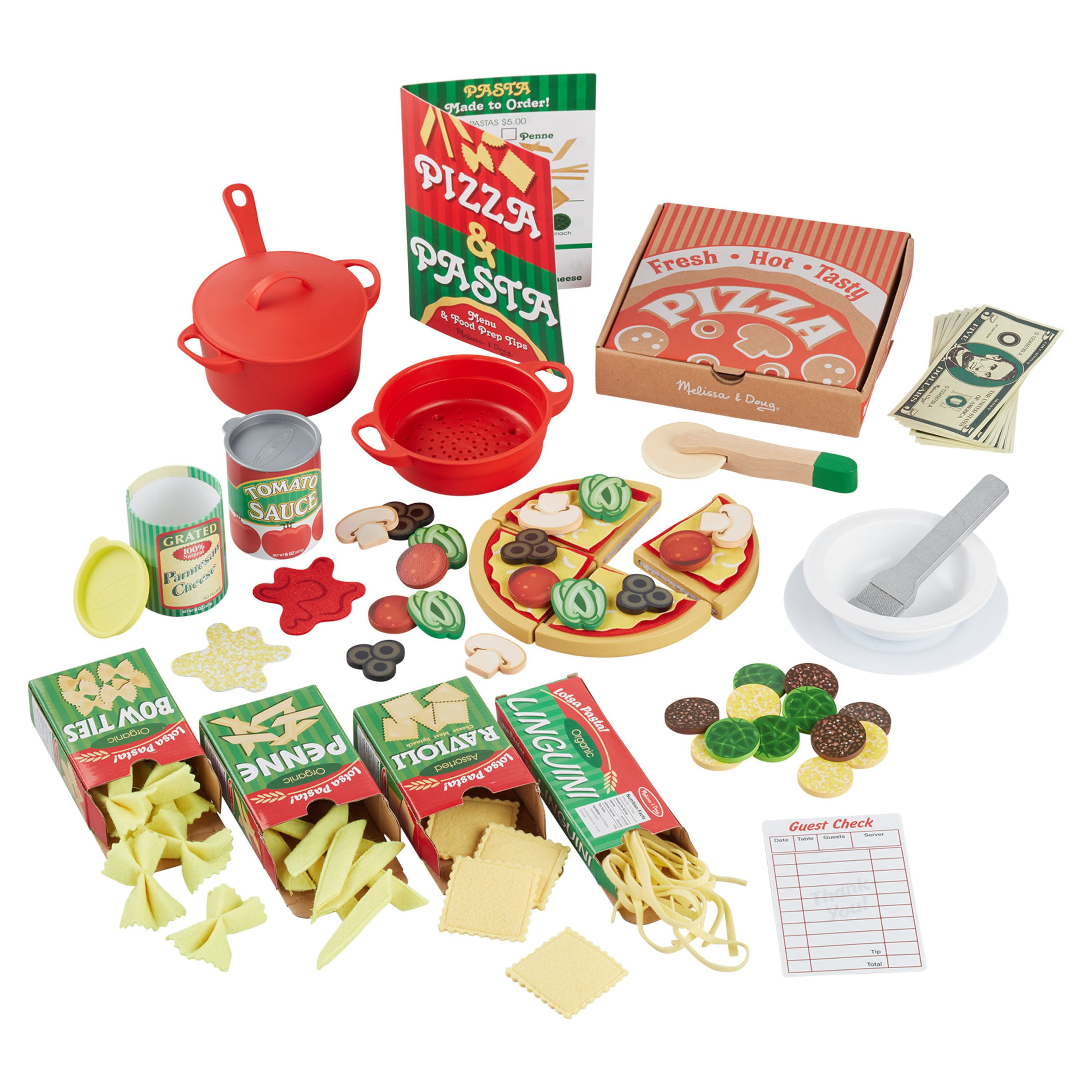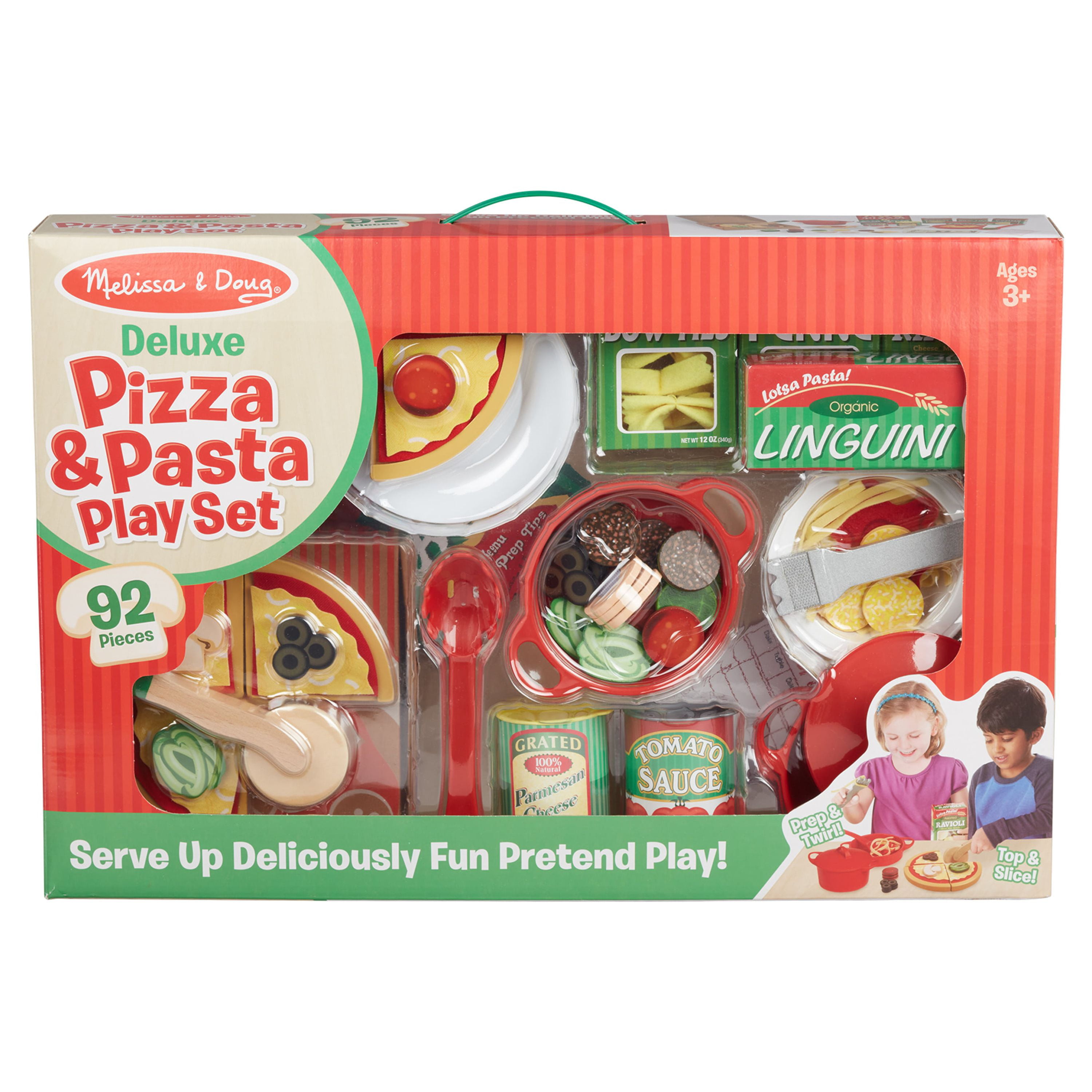 92-piece deluxe pizza and pasta play food set from Melissa & Doug that lets kids pretend to be the customer or the chef Play food includes sliceable wooden pizza crust with felt and wooden toppings, 4 kinds of felt pasta (linguini, farfalle, penne, ravioli pockets), wooden ravioli fillings, felt sauce and cheese Round out the play experience with pasta boxes, sauce and cheese “cans” with removable lids, pizza box, wooden rolling pizza cutter, durable cookware, plate, and bowl, reusable menu and guest check, play money Encourages fine motor, sorting and counting, and color recognition skills, as well as imaginative play Makes a great gift for 3- to 6-year-olds, for hands-on, screen-free play