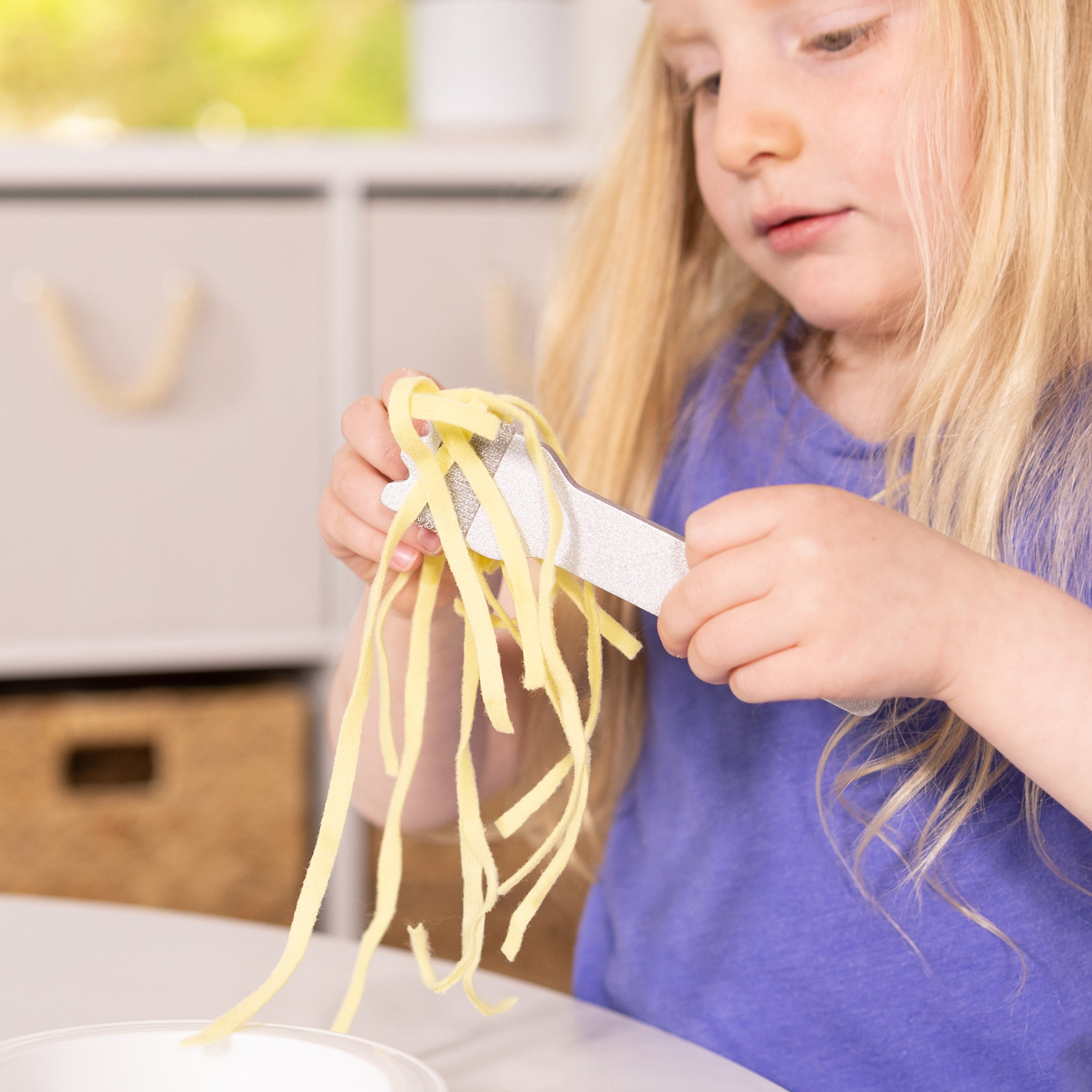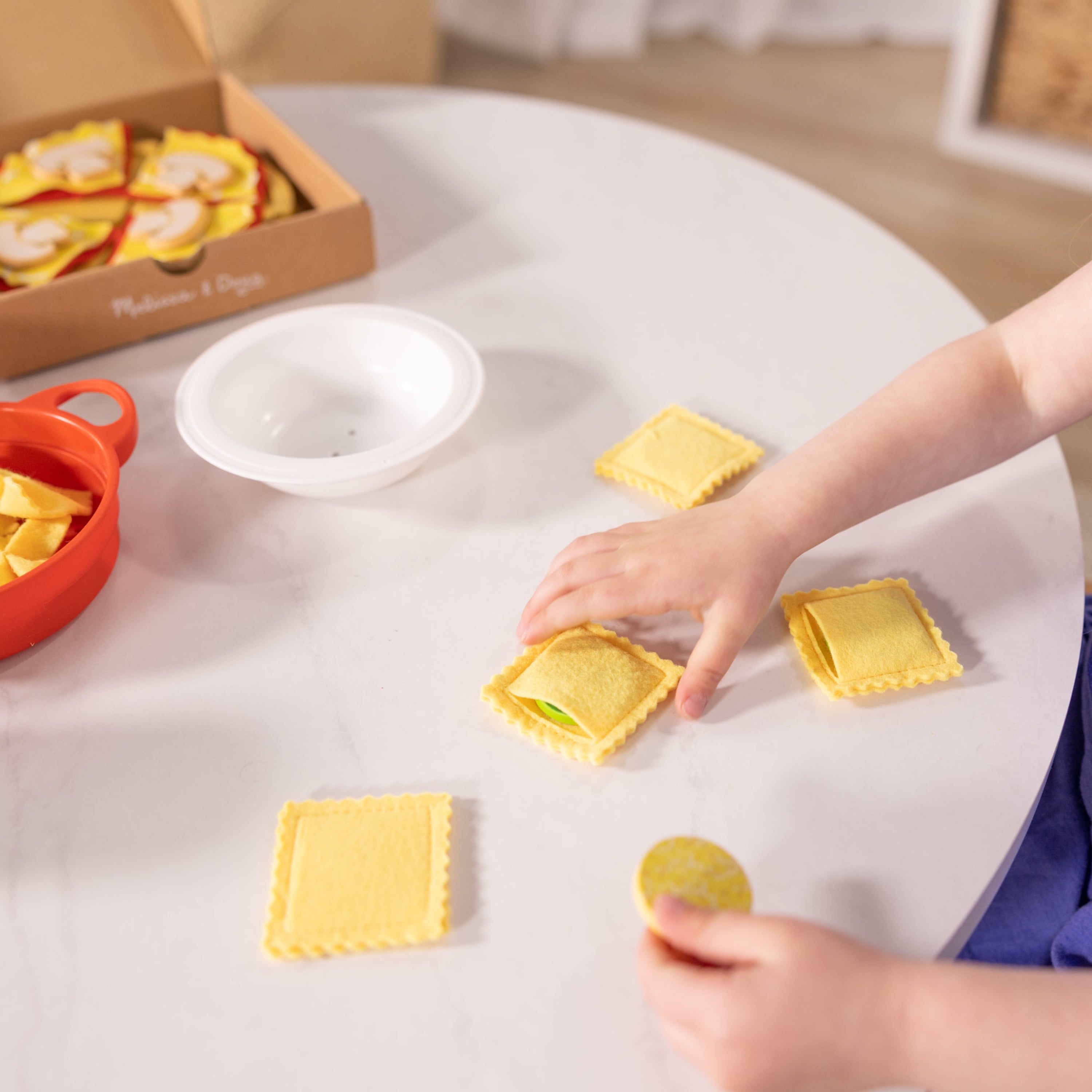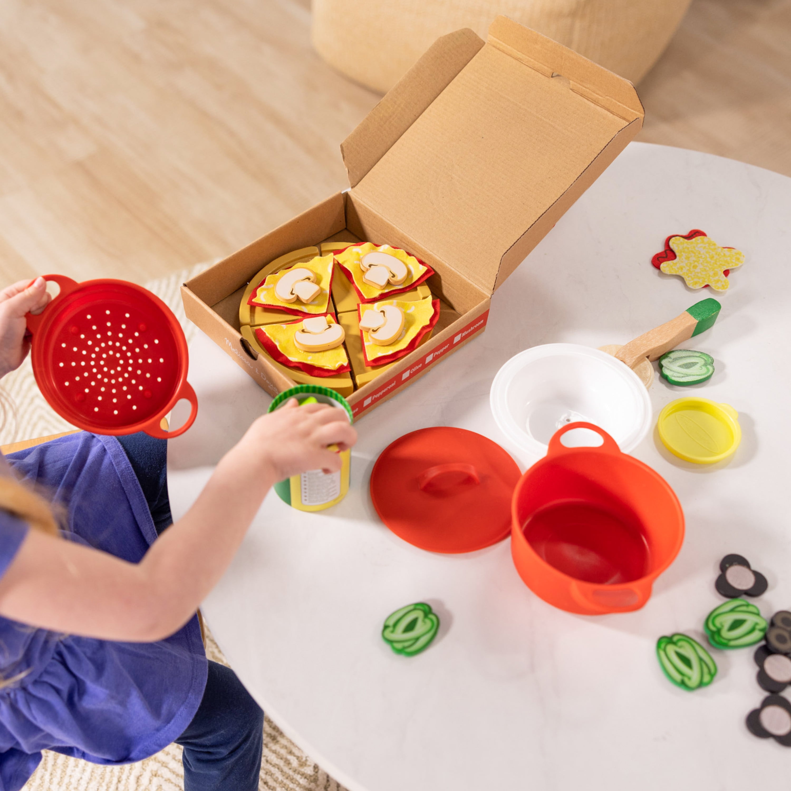 92-piece deluxe pizza and pasta play food set from Melissa & Doug that lets kids pretend to be the customer or the chef Play food includes sliceable wooden pizza crust with felt and wooden toppings, 4 kinds of felt pasta (linguini, farfalle, penne, ravioli pockets), wooden ravioli fillings, felt sauce and cheese Round out the play experience with pasta boxes, sauce and cheese “cans” with removable lids, pizza box, wooden rolling pizza cutter, durable cookware, plate, and bowl, reusable menu and guest check, play money Encourages fine motor, sorting and counting, and color recognition skills, as well as imaginative play Makes a great gift for 3- to 6-year-olds, for hands-on, screen-free play