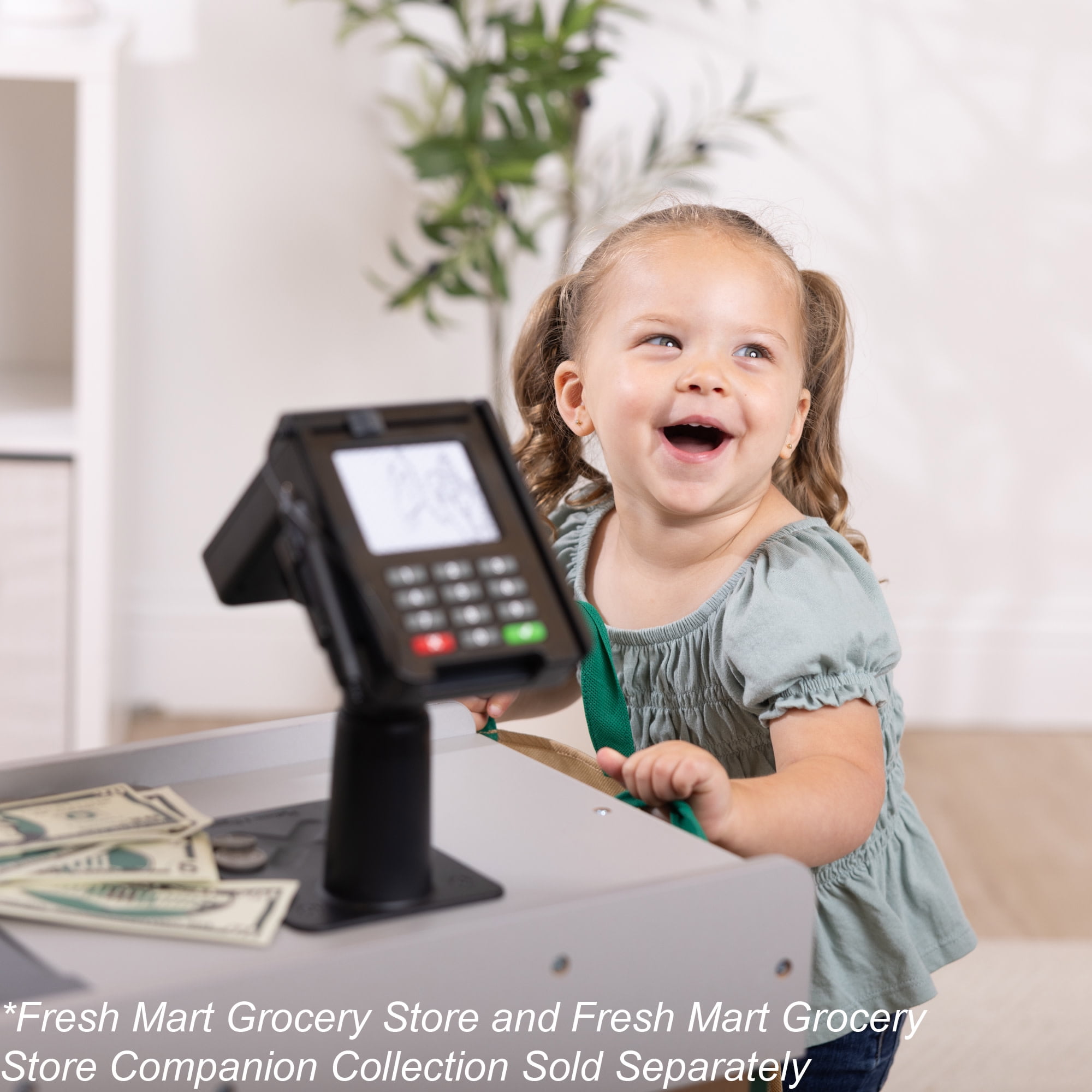 Shopping and playful purchasing is exciting at the sturdy wooden Fresh Mart Grocery Store! The free-standing play space with smooth, curved corners and edges lets customers three and older browse the shelves and pay for purchases on one side, and allows the grocer to ring up items on the other. Realistic features include beeping “scanner,” a hand-crank conveyor belt, a card-swiping machine, a keypad/calculator, and cash drawer. Styles and colors may vary. Kids are sure to find everything on their shopping list at this friendly neighborhood grocery store! This product is certified by the Forest Stewardship Council. FSC certification ensures that products come from responsibly managed forests that provide environmental, social, and economic benefits, and that forests are protected for future generations. Please note that FSC certification applies to new inventory only (FSC C156584)