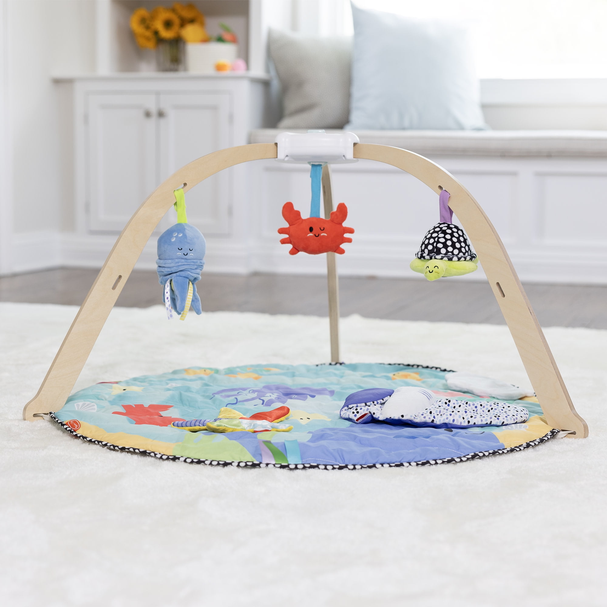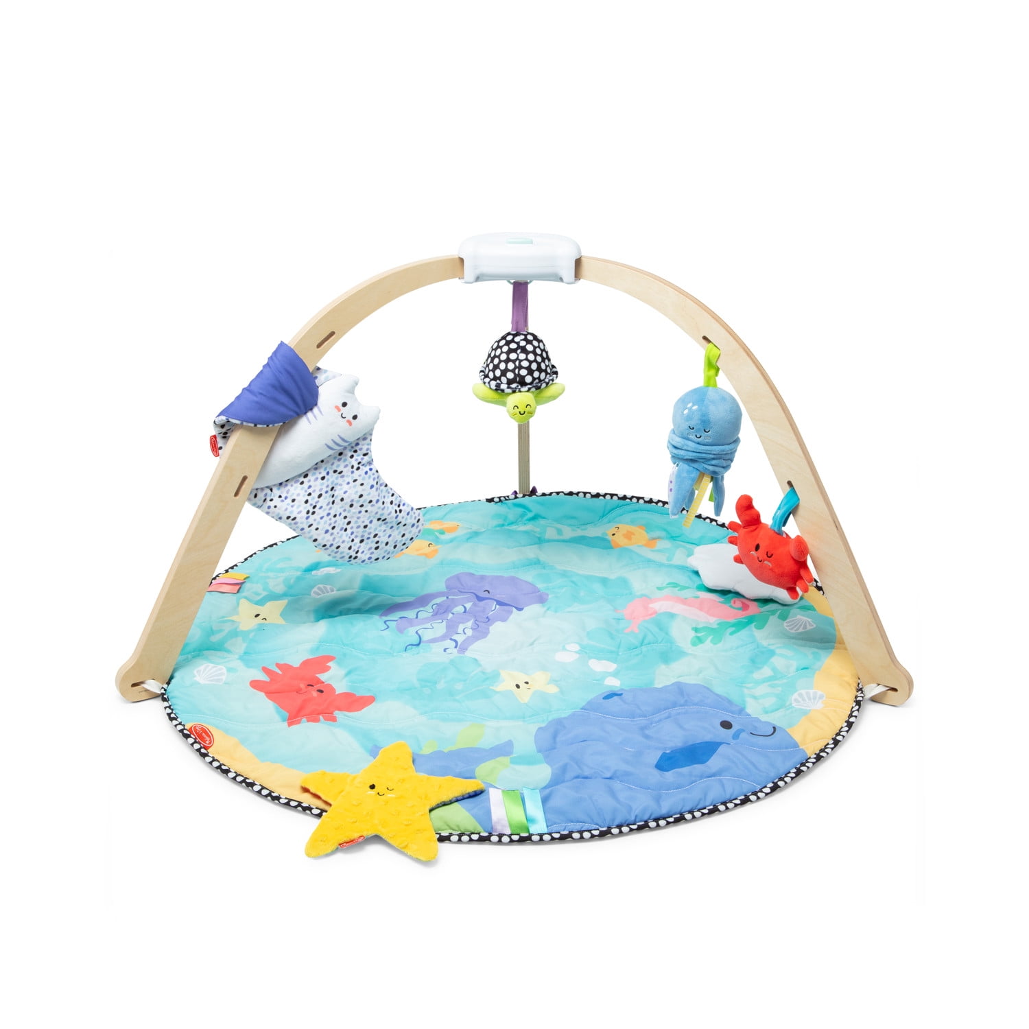 Wooden play gym encourages babies to play and learn through multiple developmental stages; includes sturdy wooden frame with wide opening for easy access to baby, double-sided machine-washable play mat, and 5 sort skill-supporting attachable toys Cozy play mat features high-contrast black-and-white graphics for early visual stimulation on one side, and on the other, a full-color ocean scene with sensory ribbons and a crinkling peek-a-boo clam shell to keep older babies engaged as vision develops Washable toys include a vibrating wiggly octopus, a chiming high-contrast turtle with built-in child-safe mirror, a double-sided, multi-textured crinkling sea star, a bright squeaking crab, and a chiming and rattling manta ray kicker Innovative Quick-Close™ button allows for speedy fold-and-go with or without the mat and toys still attached Makes a great shower gift or present for infants, ages birth to 9 months, for hands-on, screen-free play and developmental skill-building; product made with FSC-certified materials that support responsible forestry; applies to new inventory only (FSC C156584)