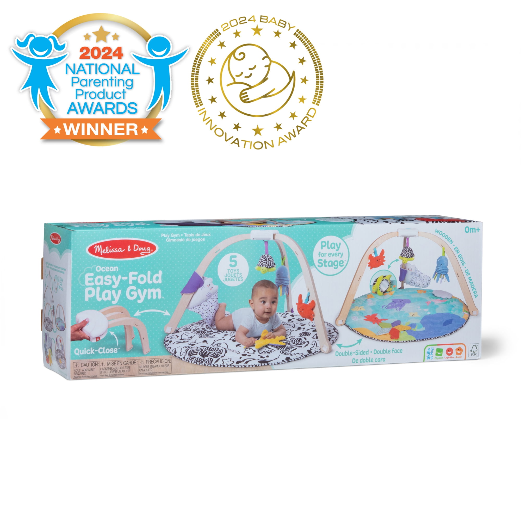 The Melissa & Doug Ocean Easy-Fold Play Gym with Quick-Close™ storage is thoughtfully designed to encourage babies from birth to 9 months old to play and learn through multiple stages and ages! Sturdy, wide wooden arches are pre-assembled for easy set-up and offer caregivers easy access to baby. The arches stay secure on the comfy, reversible play mat with sensory ribbons and a crinkling peek-a-boo clam shell. One side of the mat features high-contrast black-and-white graphics for early visual stimulation, and the other includes a full-color ocean scene to keep older babies engaged as vision develops. Attach the included soft, skill-supporting toys to the gym or play with them independently! There’s a vibrating wiggly octopus, a chiming high-contrast turtle with built-in child-safe mirror, a double-sided, multi-textured crinkling sea star, a bright squeaking crab, and a chiming manta ray that rattles when it’s kicked. Mat and toys are machine washable. Press the innovative Quick-Close™ button to unlock the frame and easily fold for storage or to take the play gym on the go! The included Play Guide illustrates the many ways the play gym supports the powerful role play has in brain development, physical well-being, and creating connections! This product is certified by the Forest Stewardship Council. FSC certification ensures that products come from responsibly managed forests that provide environmental, social, and economic benefits, and that forests are protected for future generations. Please note that FSC certification applies to new inventory only (FSC C156584)