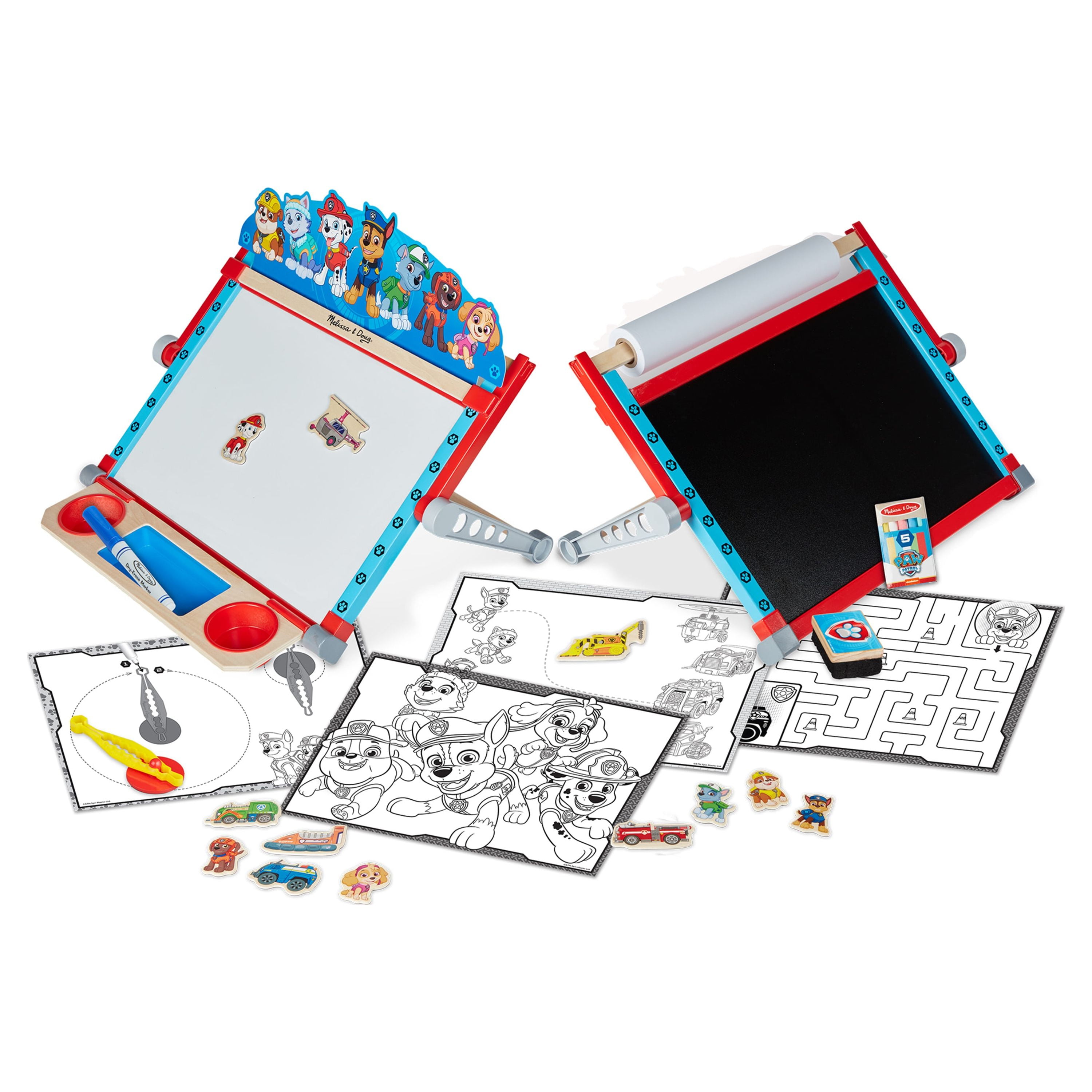 Tabletop easel with storage tray features magnetic dry-erase board on one side, chalkboard on the other Includes dry-erase marker, drawing compass, 5 colored chalk sticks, eraser, 50-foot-long paper roll (12 inches wide), 10 activity sheets, 12 wooden pup and vehicle magnets, pup header card Easel folds flat for convenient storage PAW Patrol™ is always ready to help, inspiring preschoolers with a blend of teamwork, adventure, and humor as they develop social, emotional, and developmental skills through play Makes a great gift for preschoolers, ages 3 to 5, for hands-on, screen-free play
