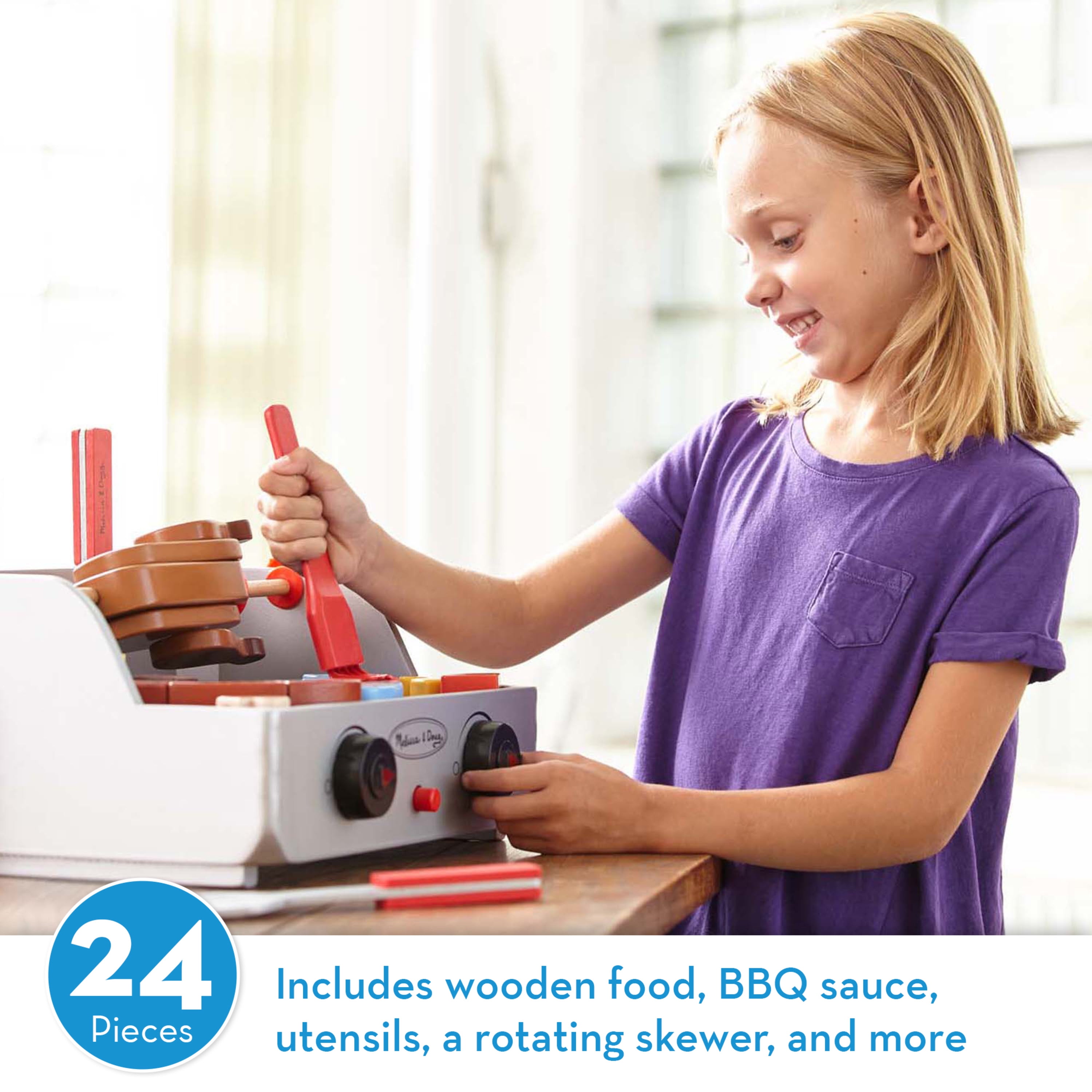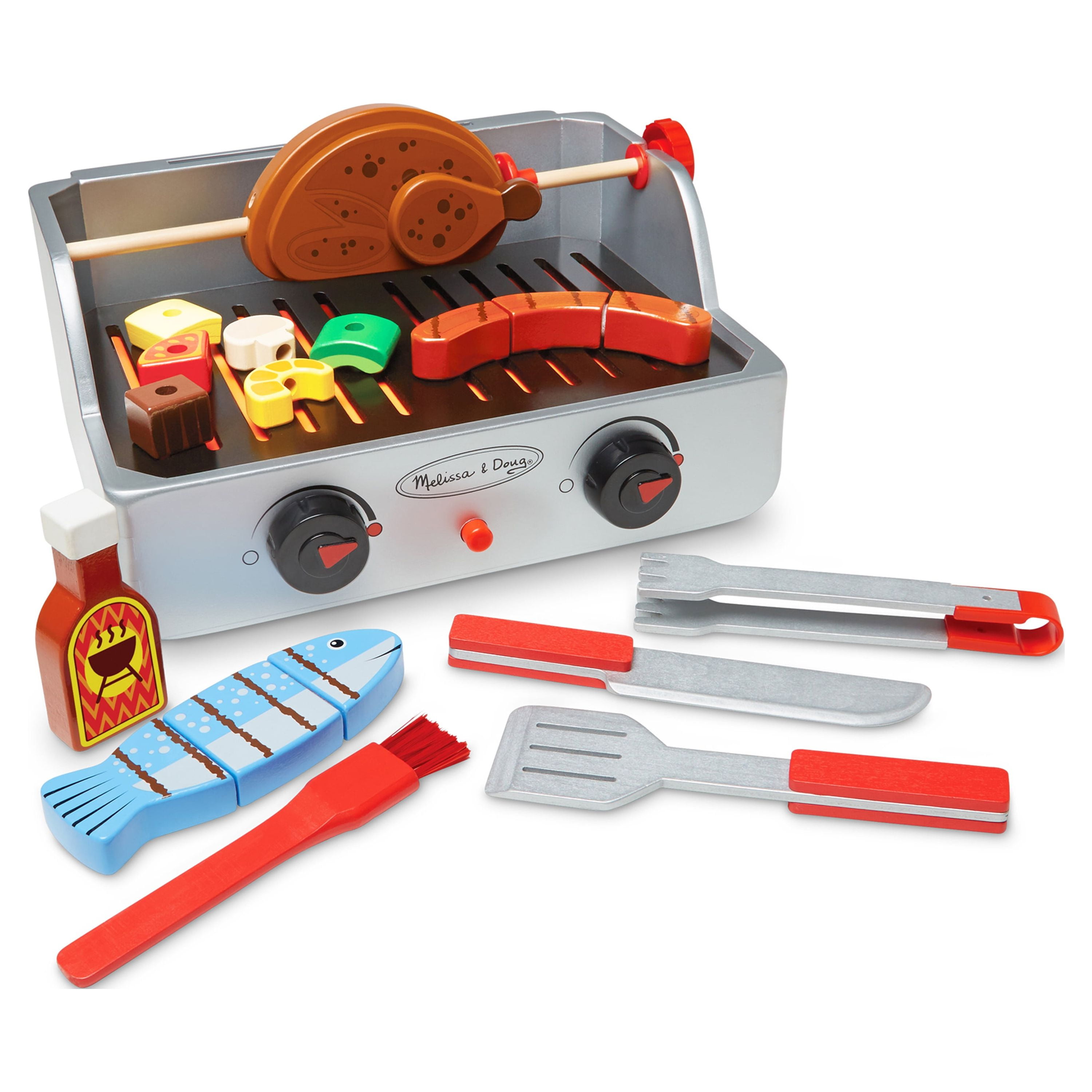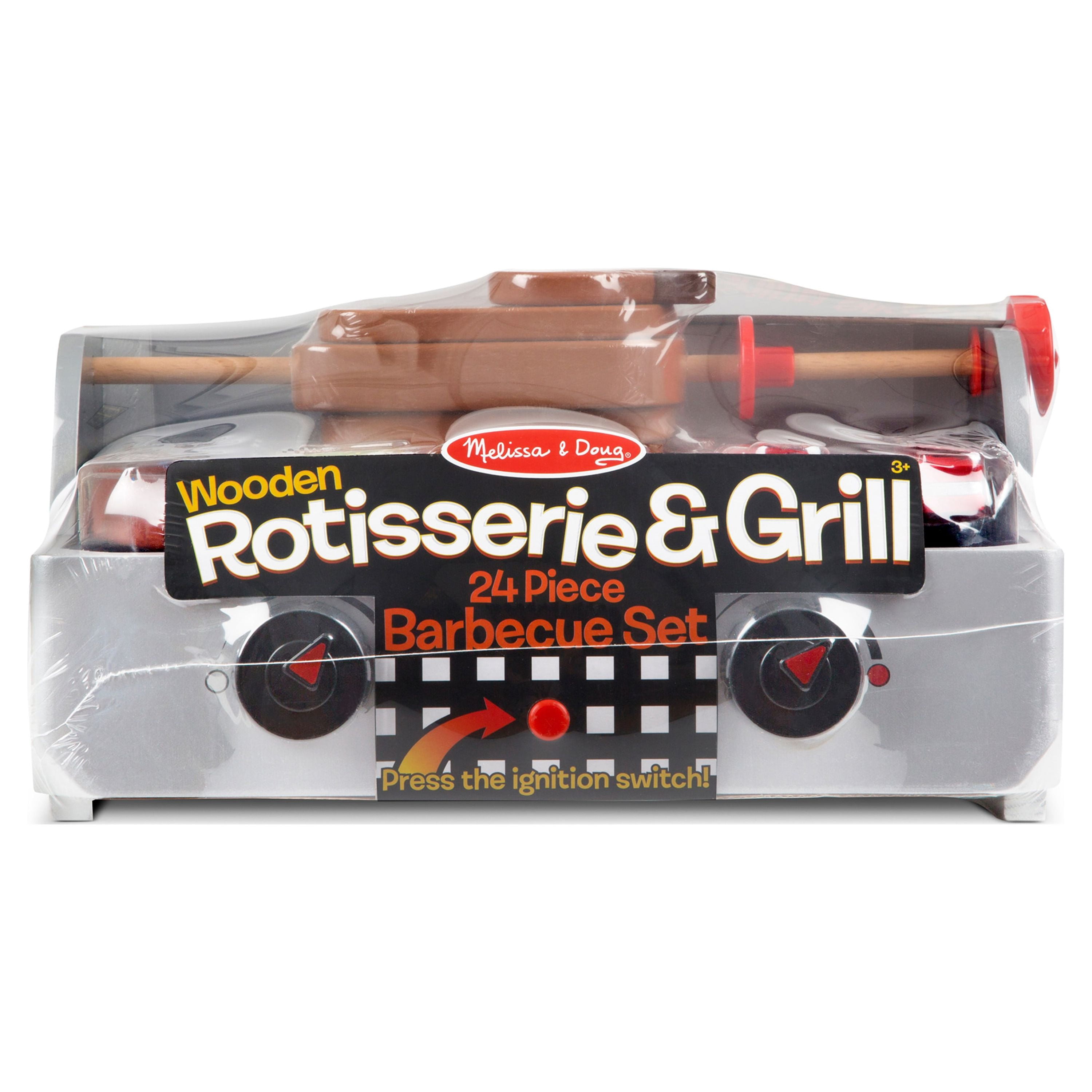 Deluxe wooden barbecue grill and rotisserie set 24-piece set includes wooden food items, BBQ sauce, utensils, and a rotating skewer, all of which store neatly in barbecue Easy-to-grip spatula, tongs, knife, and basting brush are safe and kid-friendly Fish, sausage, and chicken pieces are held together with self-stick tabs and can be cut apart with the knife Makes a great gift for girls and boys, ages 3 to 6, for hands-on, screen-free play