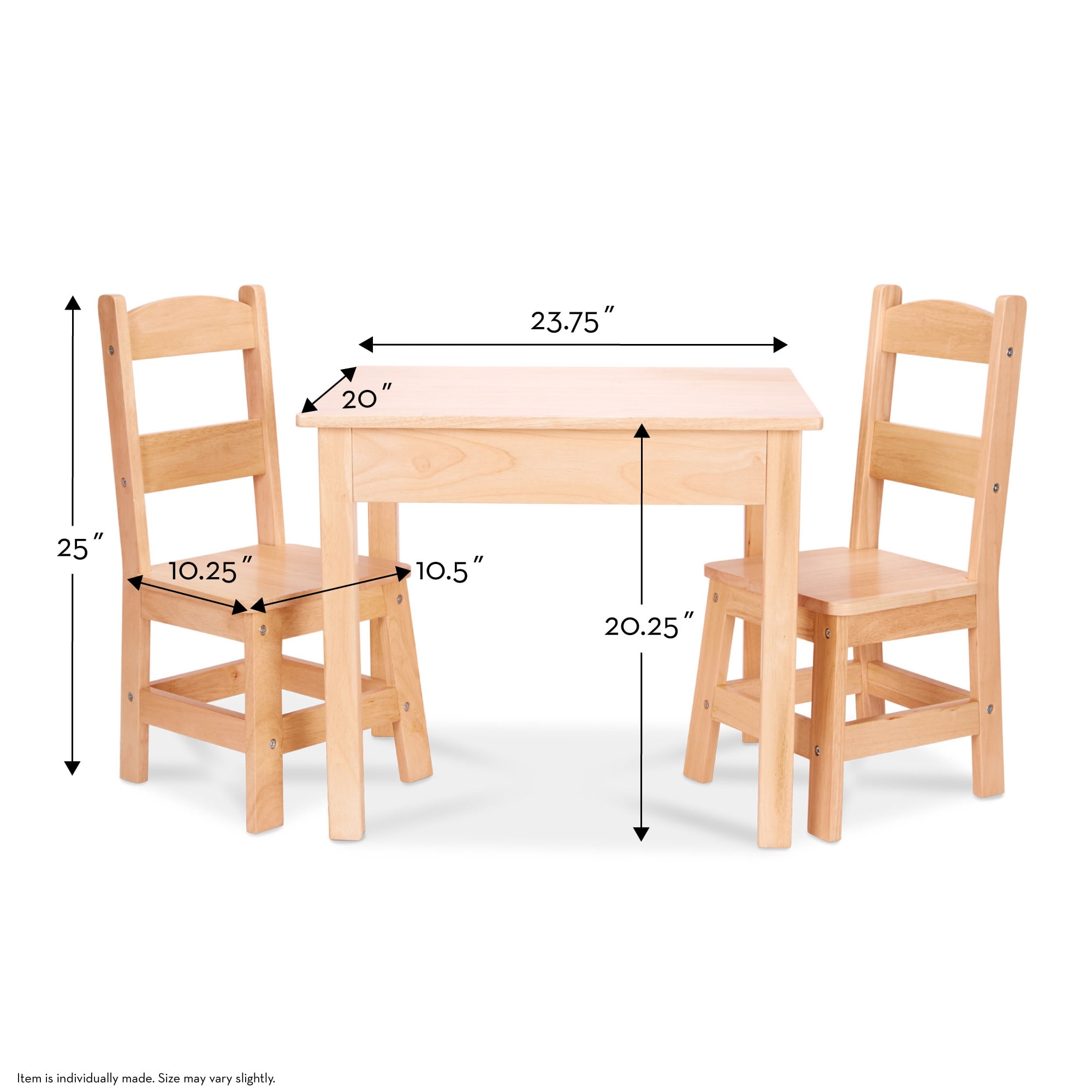 3-piece set (table and 2 chairs) gives children a kid-sized space for creativity Chair seat height: 11″ Sturdy wooden construction Easy assembly Additional set of 2 chairs sold separately to accommodate four kids at the table