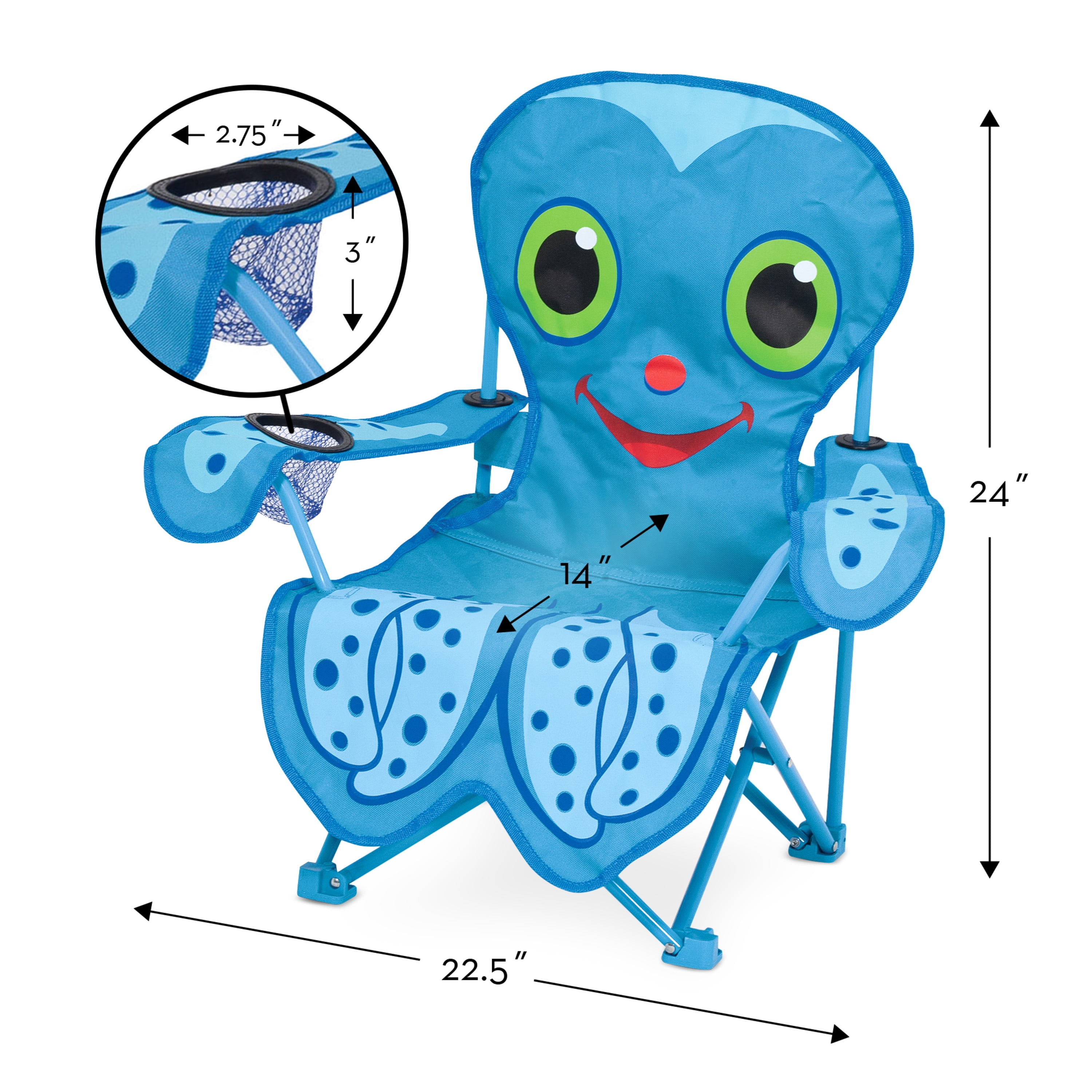 Folding beach chair for kids Features cup holder, padded feet and matching storage bag. Vibrant colors and cheerful Flex Octopus artwork Durable fabric Sturdy metal frame