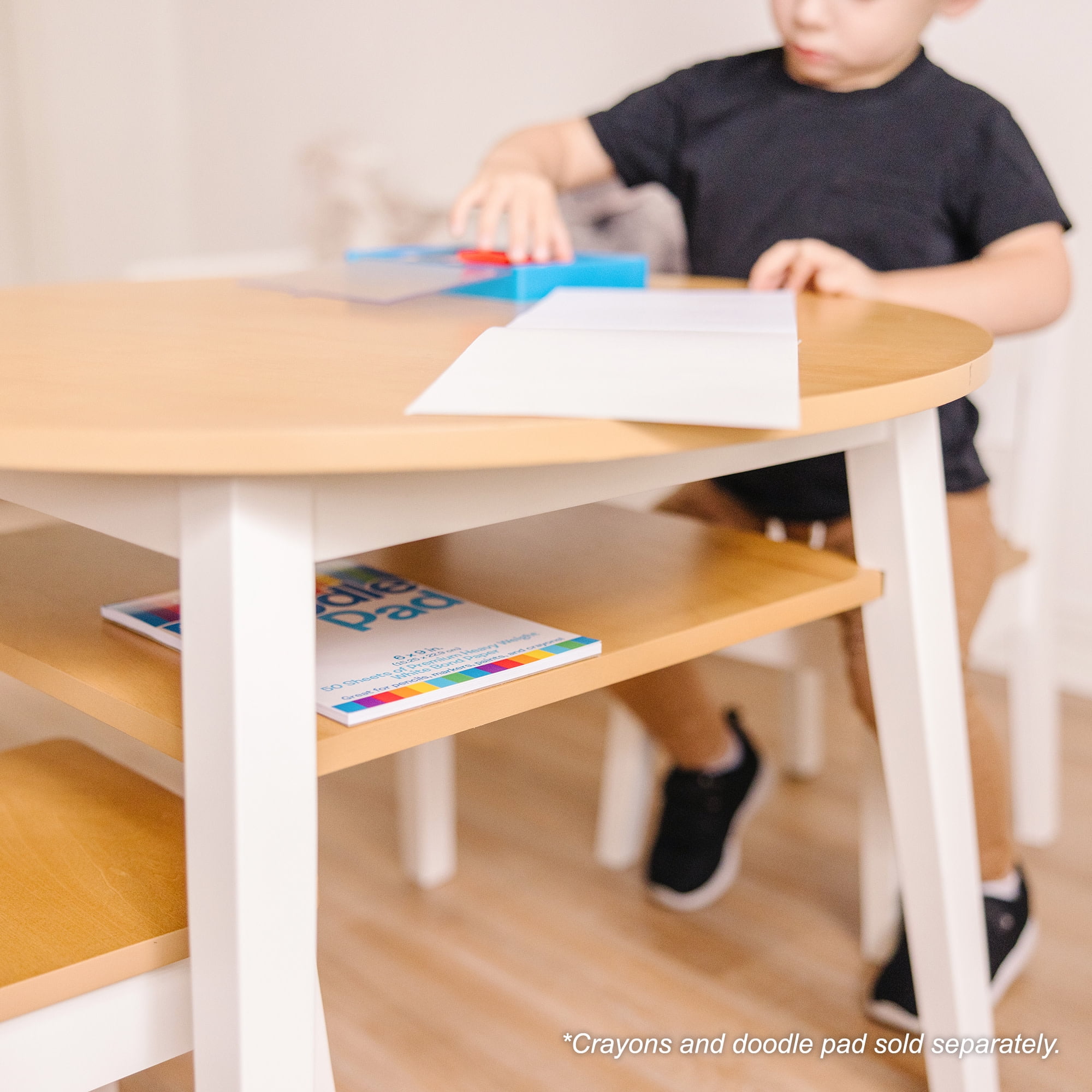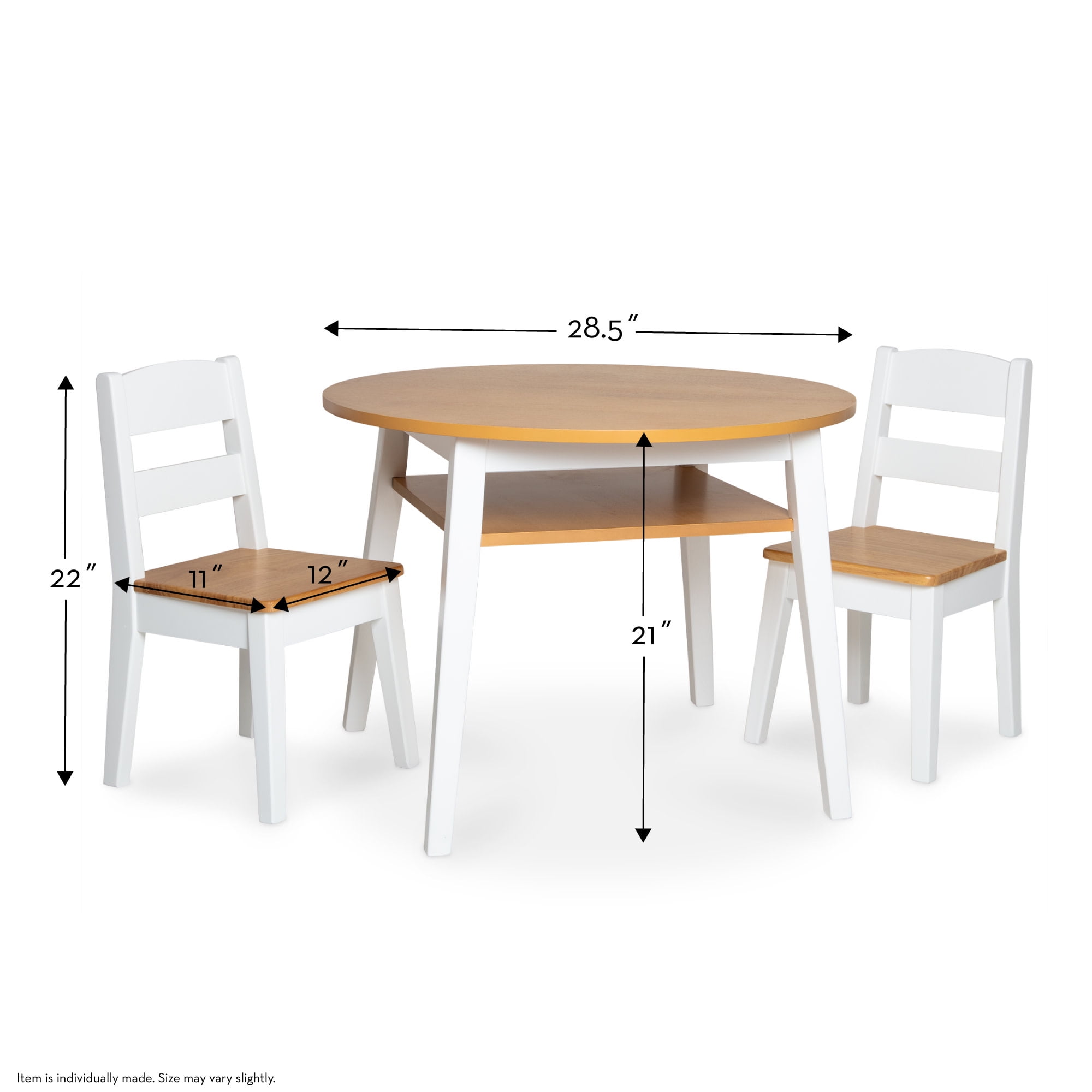 Melissa & Doug Wooden 3-Piece Kids Round Activity Table and Chair Set, Light Woodgrain/White Easy-to-assemble, two-tone sturdy wooden round table and two matching wooden chairs sized for kids Round tabletop with a square shelf underneath in natural wood finish; white legs for a modern look Ideal for games, puzzles, arts and crafts, snacks, and more; features a storage shelf under the tabletop for quick cleanup Assembly requires only a Phillips-head screwdriver (not included); power tools are not recommended Designed for ages 3-8; holds up to 100 pounds; assembled table dimensions: 28.5” diameter x 21” height; assembled chair dimensions: 12.75” depth x 12” width x 22.5” height with an 11.25” seat height