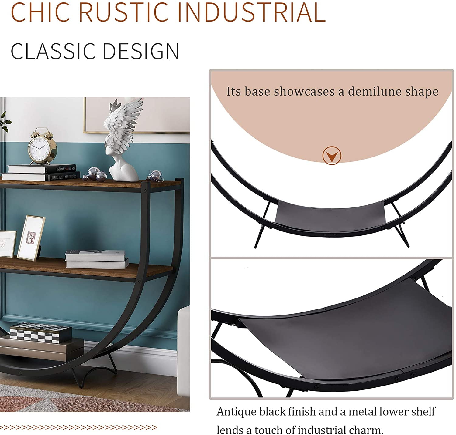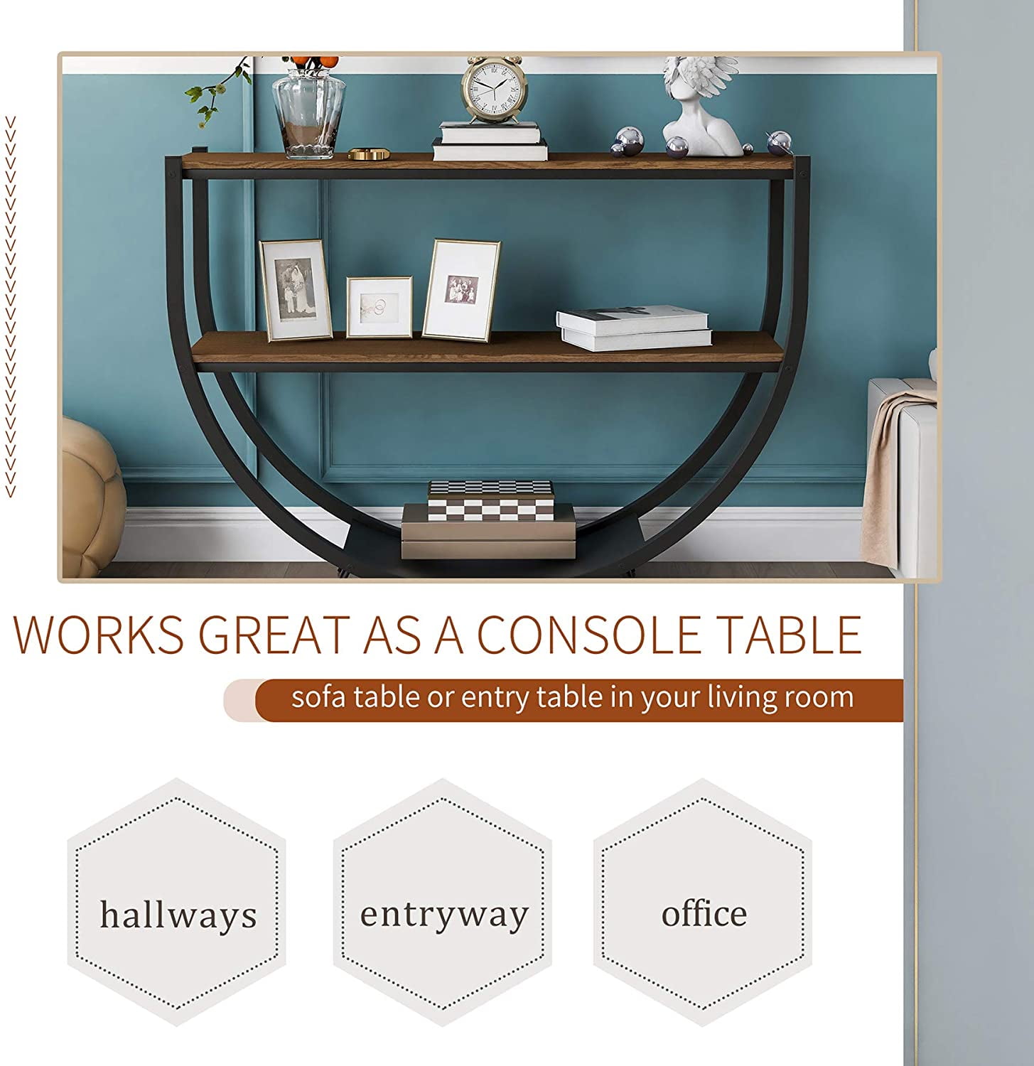 The console table desktop with storage metal frame is made of MDF, which has good wear resistance. It is easy to install and disassemble. 2 tier console table offer you a place for your books, magazines and decor. Works great at any place of your house. Rustic style chic with simple construction to create an attractive look and feel, which adds a touch of elegant charm to your room.