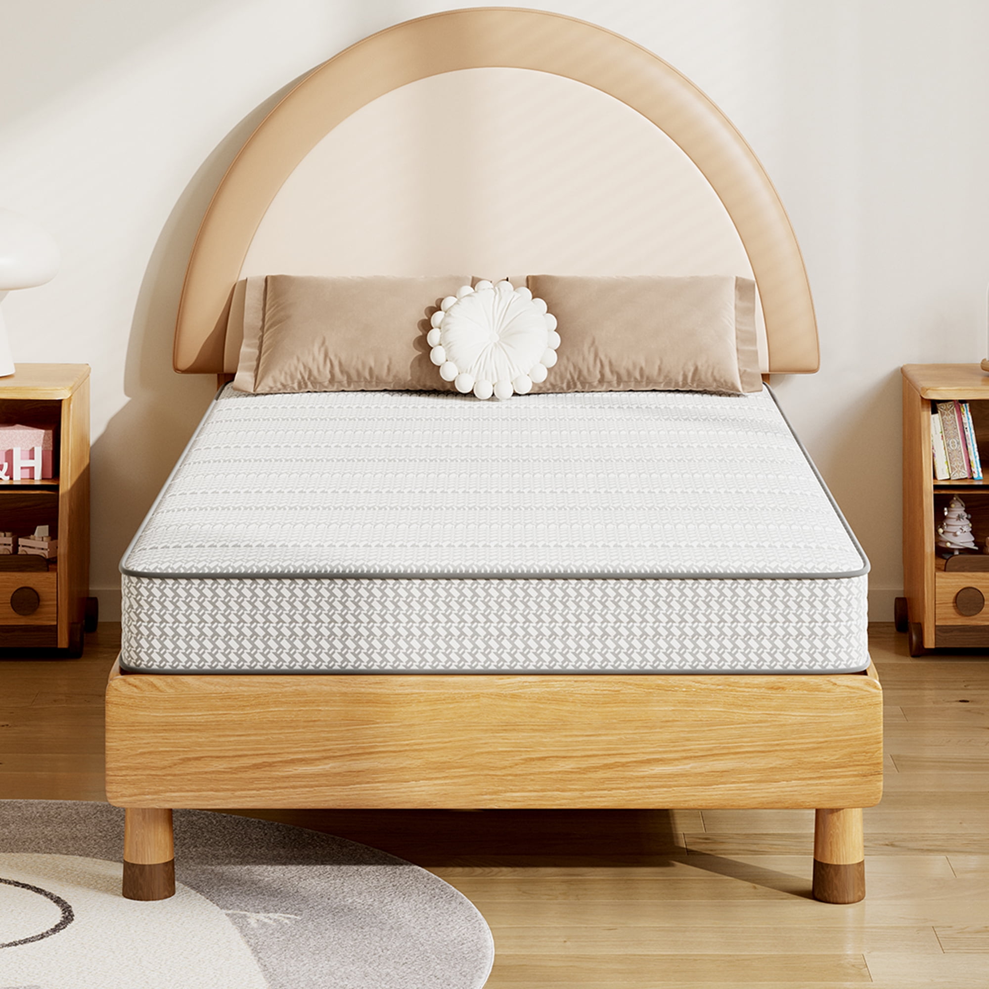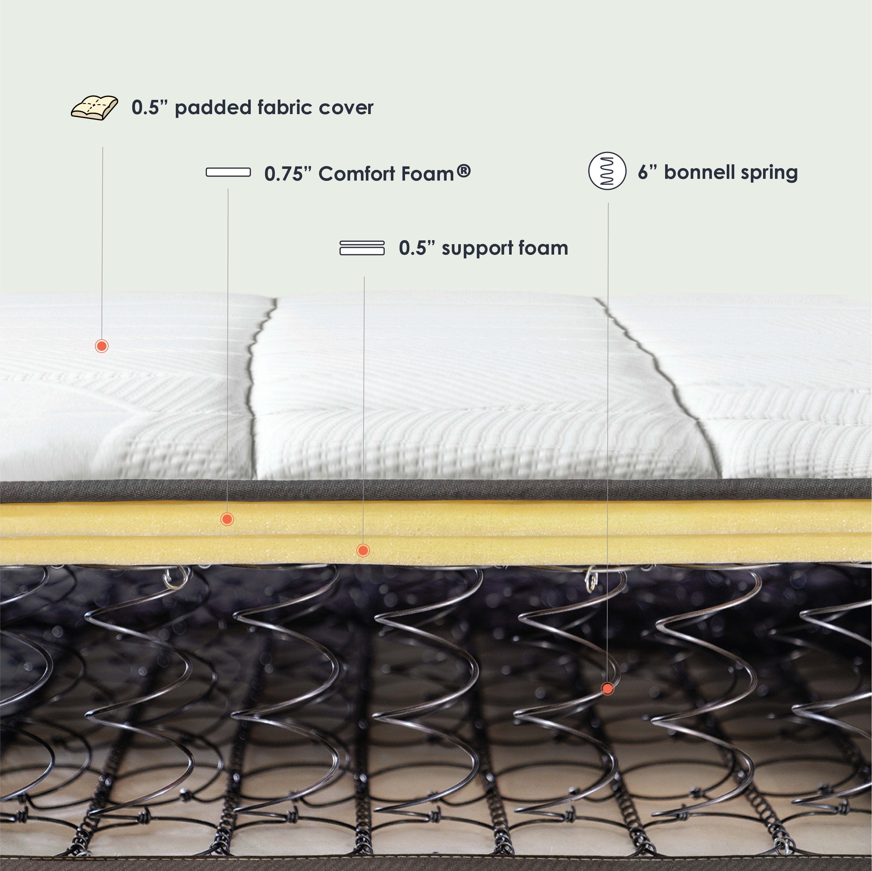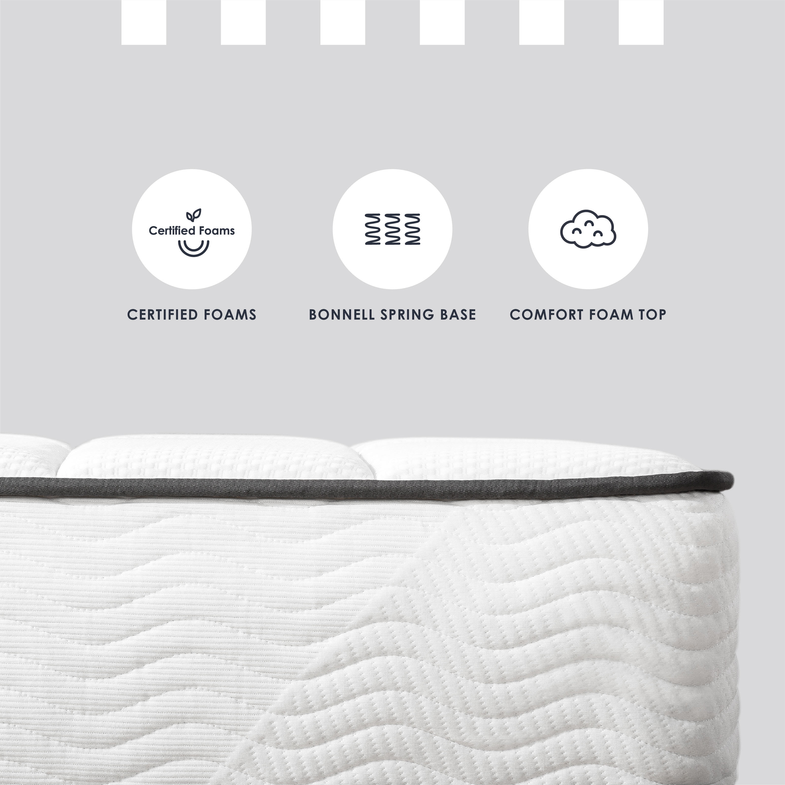 Classic bonnell spring mattress layered with a comfort foam top and supportive innersprings Smooth poly jacquard fabric cover with fiber padding Heavy duty bonnell spring base for highly durable and even support CertiPUR-US certified foam meets high standards of content, performance and durability Bed in a box delivered straight to your door with easy setup 10-year manufacturer’s warranty Available in Twin, Full, Queen and King sizes Height options : 6-inch, 8-inch and 10-inch