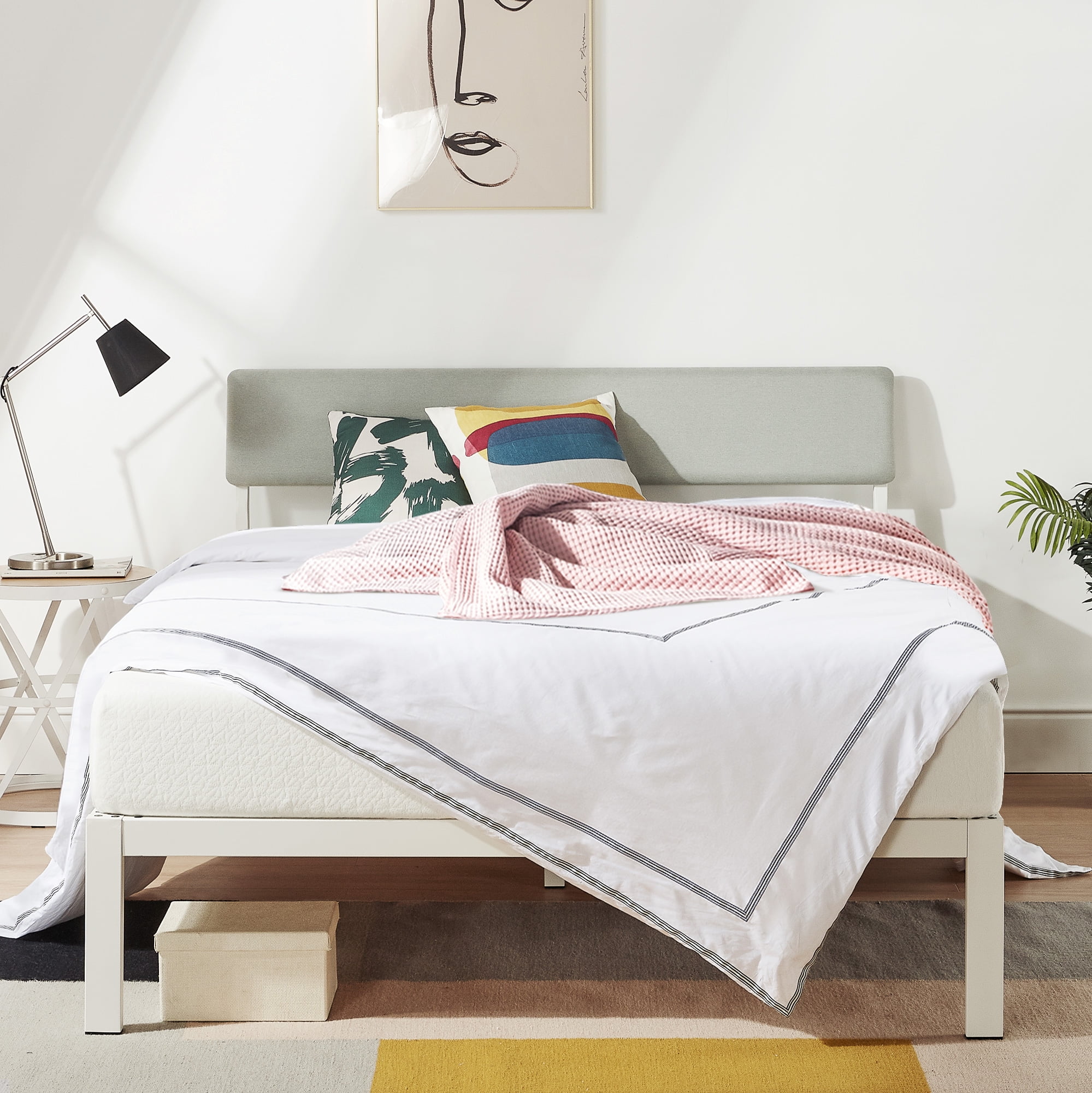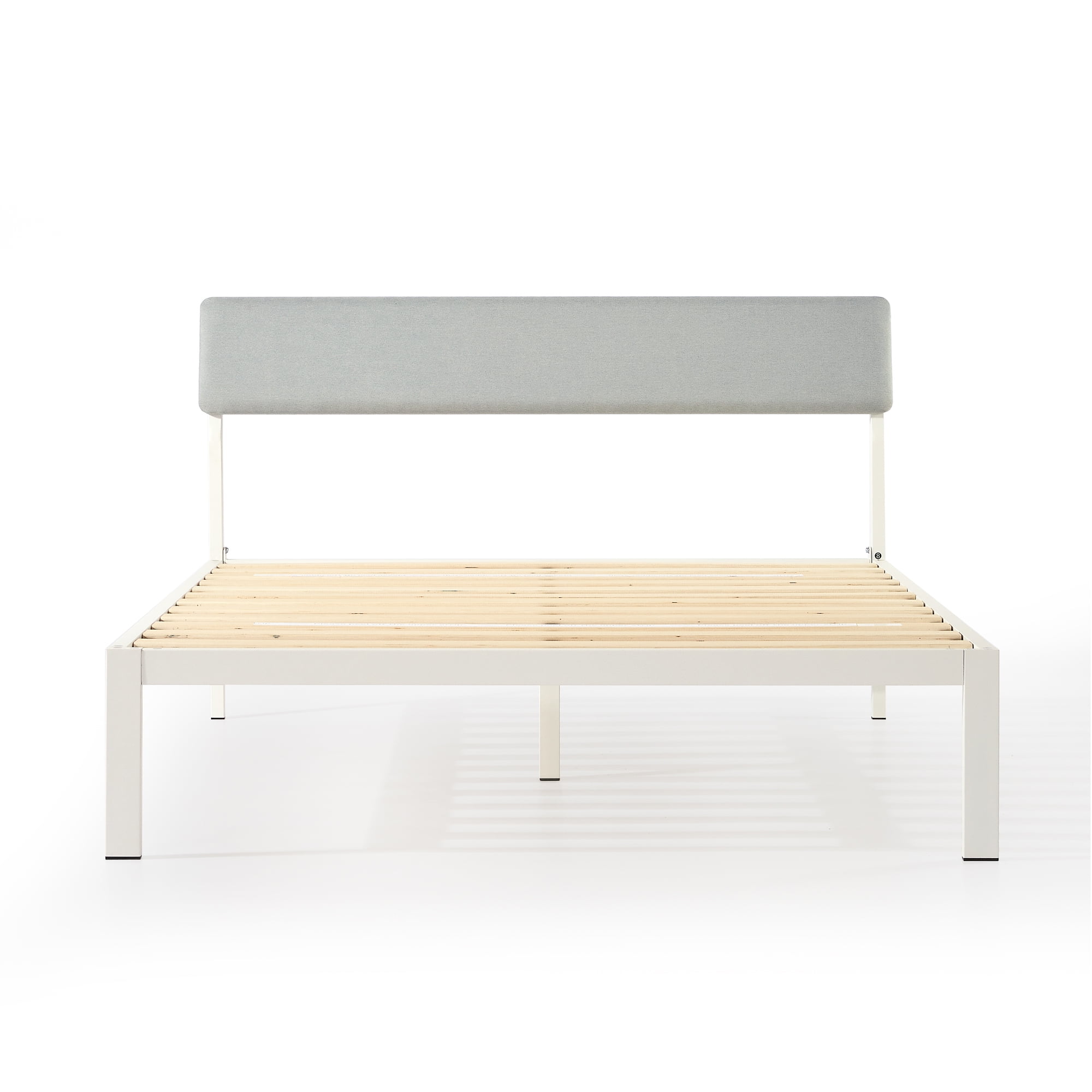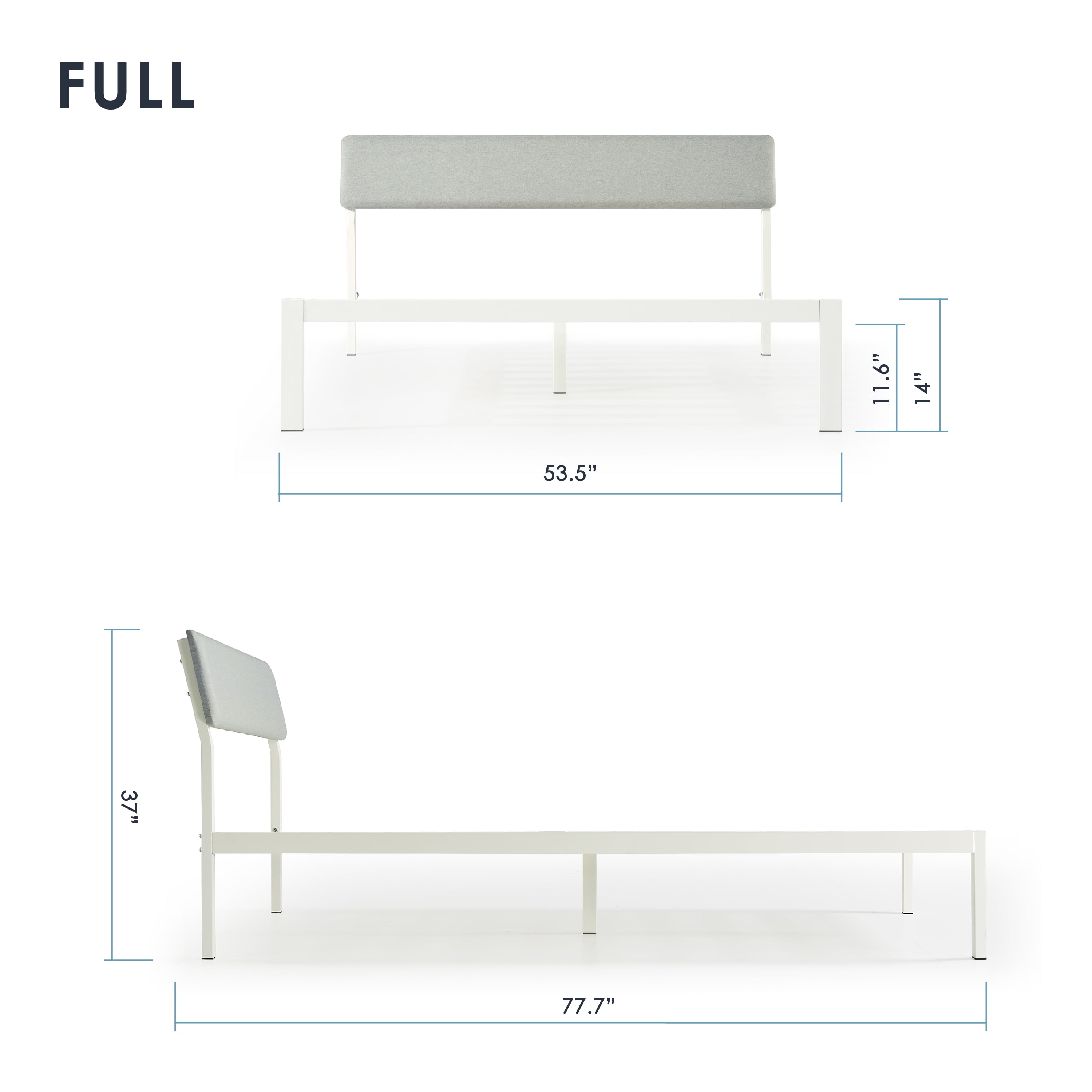 Simple modern design with a sleek metal frame and soft fabric headboard Angled backboard for the perfect leaning position Classic grey upholstered backboard filled with high density foam Non-slip taped solid wooden slats with easy roll-out installation Foam noise-free padding 11″ under bed clearance for storage Easy assembly with no other tools needed CertiPUR-US® certified foam, OEKO-TEX® certified fabric 5-year manufacturer’s warranty Recommended mattress height: 8 to 10 inches Product Dimensions: Twin 77.7″L x 38″W x 14″H Full 77.7″L x 53.5″W x 14″H Queen 82.8″L x 59.6″W x 14″H King 82.8″L x 75.6″W x 14″H