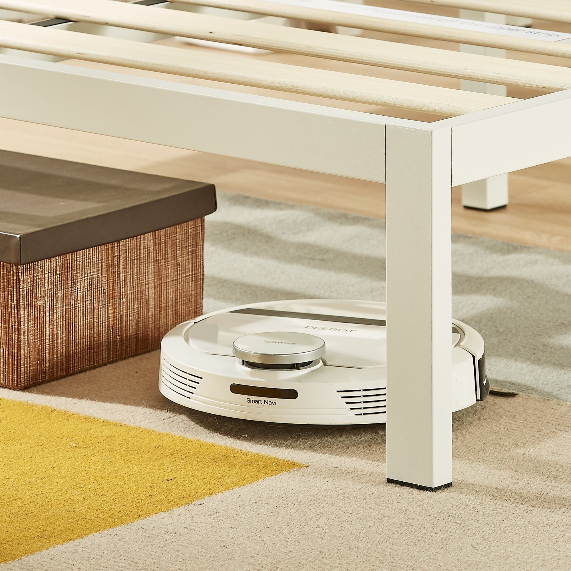 Mellow’s Kera mixed material platform bed is a simple and modern design made with a unique combination of metal and fabric. Unlike the traditional upholstered headboard, Kera’s is lowered in height and angled just right to create a backboard that provides the perfect leaning position. This backboard is filled with high density foam for both comfort and support. The Kera platform bed is available in two simple yet refined color combinations, sky grey upholstery on a white metal frame and classic grey upholstery on a black metal frame. We’ve also designed the frame to leave 11 inches of clearance under the bed for convenient storage space. Enjoy quick and easy assembly with non-slip taped wooden slats that roll out and firmly attach using strong hook and loop fasteners. Better yet, a free handy ratchet and everything else you need for assembly is included in your package, no other tools needed.