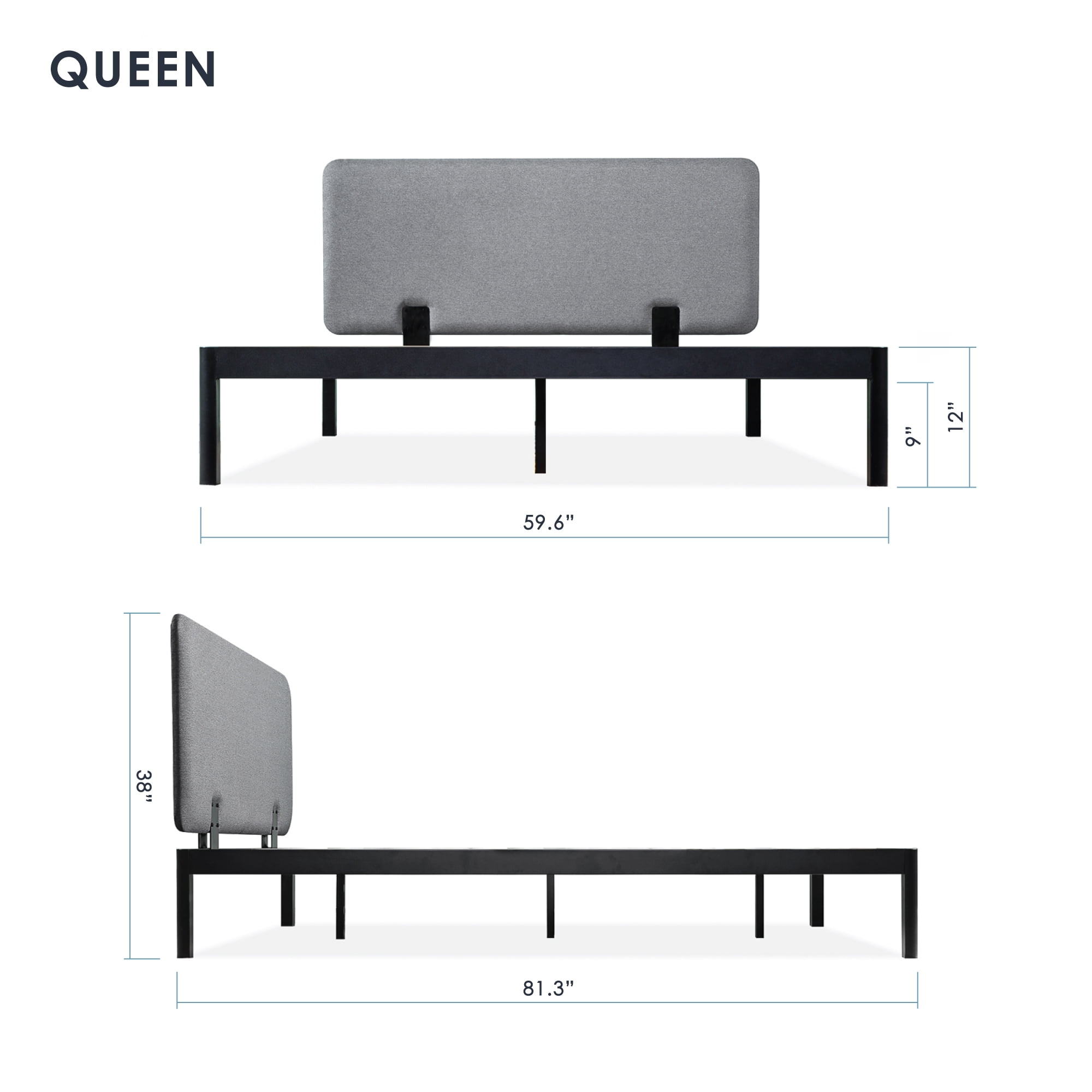 Mellow Kert Metal Platform Bed with Fabric Headboard and Rounded Legs, Classic Grey, Queen