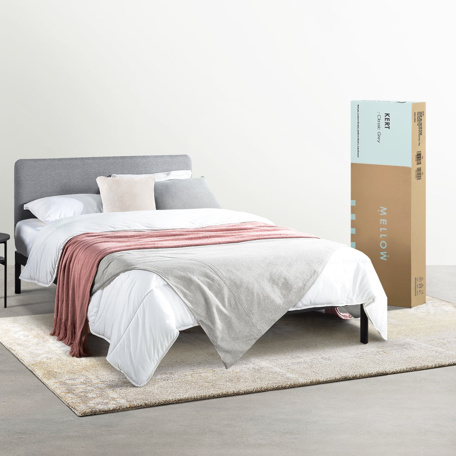 Mellow’s Kert platform bed is a simple, one-of-a-kind design adding just the right amount of modern and cozy to your bedroom interior. It is a mixed material bed that combines the best of both worlds by pairing an upholstered headboard with a metal body. The extra thick and sturdy metal frame includes rounding details in the legs and corners for your safety. The soft fabric headboard is filled with high density foam for support and comfort as you lean back and relax. Non-slip taped wooden slats help keep your mattress in place and eliminate the need for a separate box spring. Our Kert platform bed is available in three unique headboard colors: Oak Grey, Sunset Coral and Classic Grey. Enjoy easy assembly in minutes with everything you need included in your package and wooden slats that simply roll out and attach to the frame using strong hook and loop fasteners.