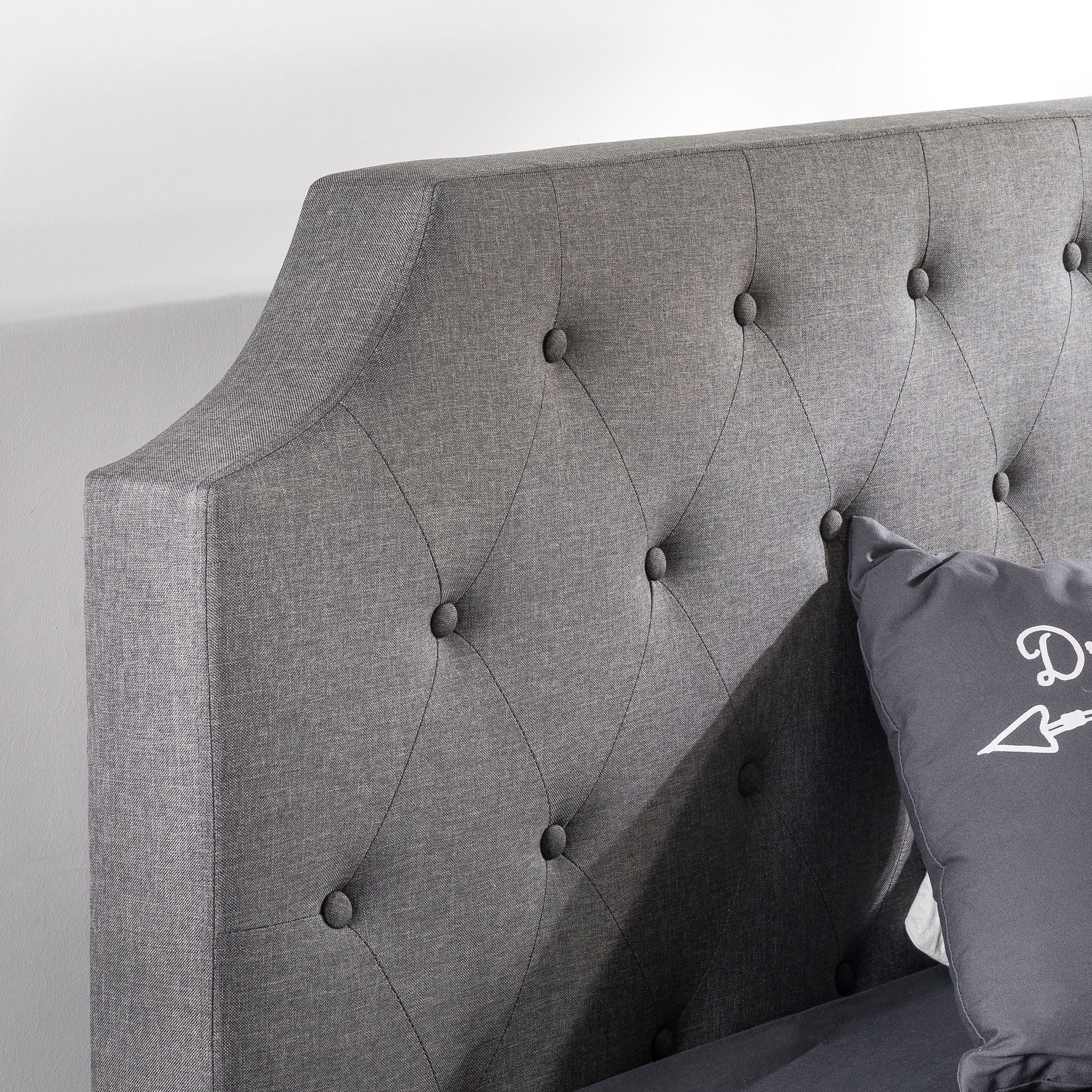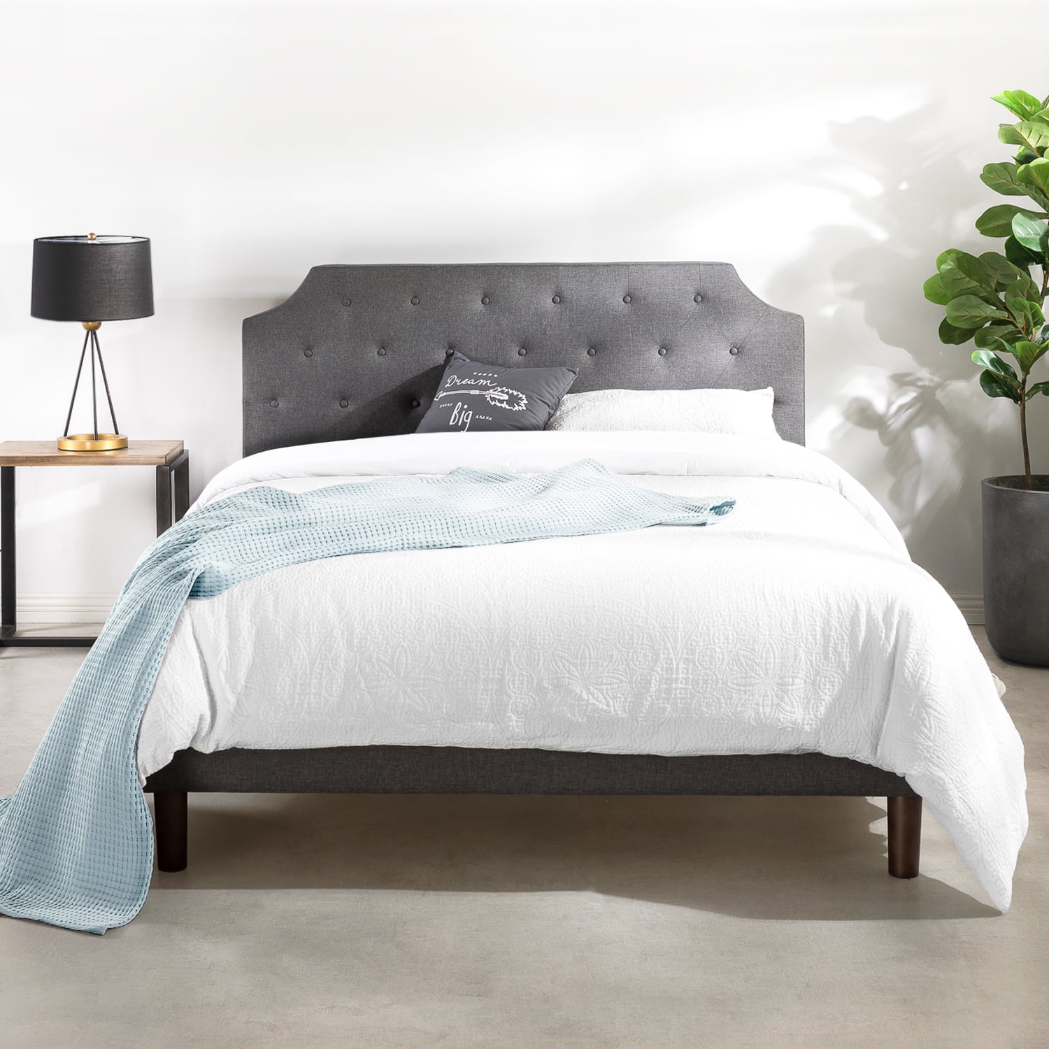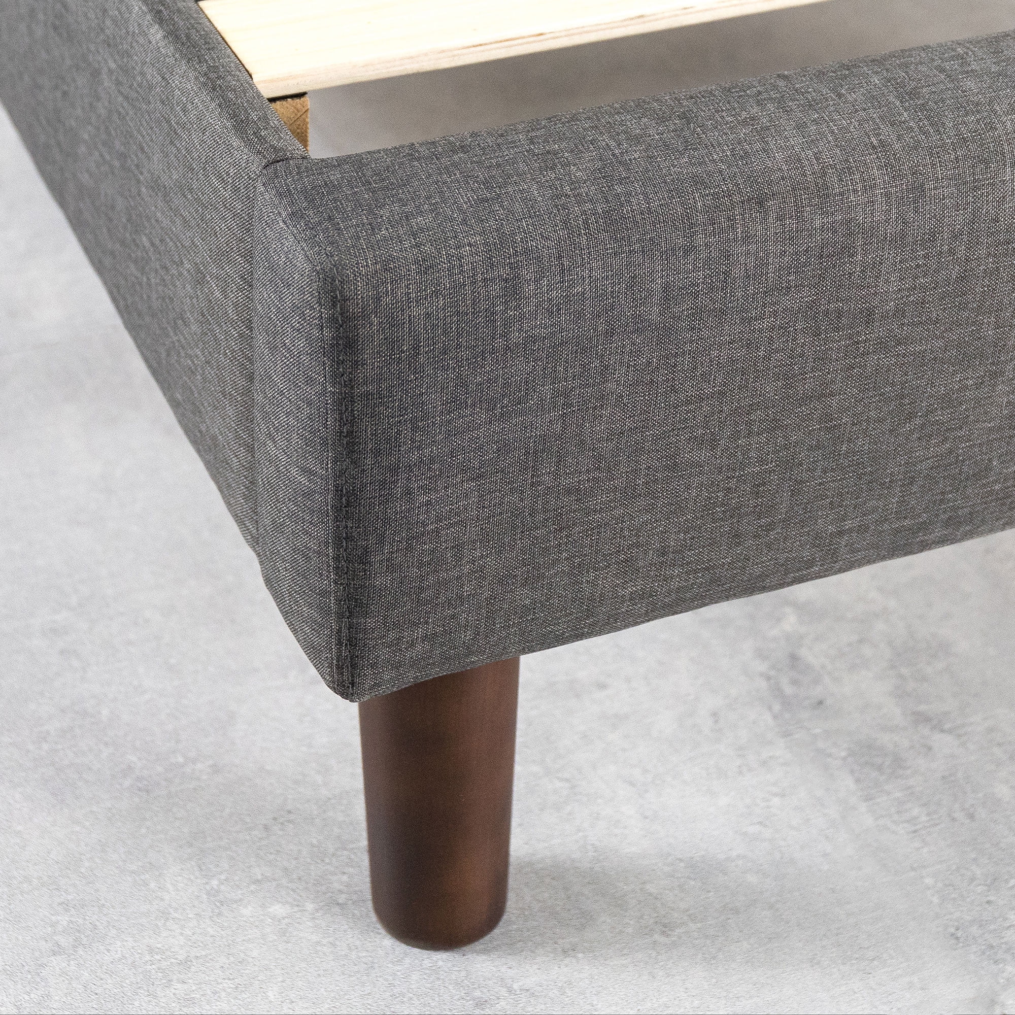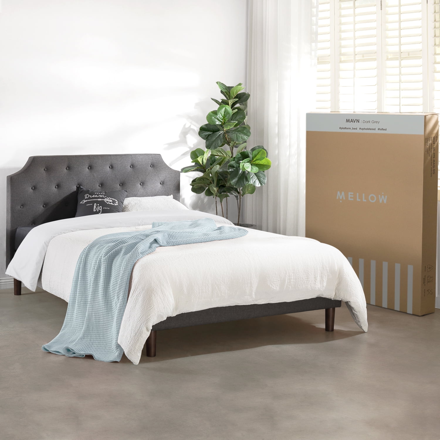 Mellow’s Mavn upholstered platform bed features a modern tufted design and headboard with elegant curves and modern edges. The dark grey fabric headboard is detailed with curves complemented with clean, edged corners and layered with foam for comfort as you lean back and relax. The authentic solid wooden slats provide sturdy, durable support without the need for a separate box spring. The legs are also made with solid wood for stability and a refined modern look. Enjoy quick and easy assembly with a free ratchet and everything you need included in the package, no other tools required. The Mavn platform bed is available in Full, Queen and King sizes and comes with a 5-year manufacturer’s warranty.