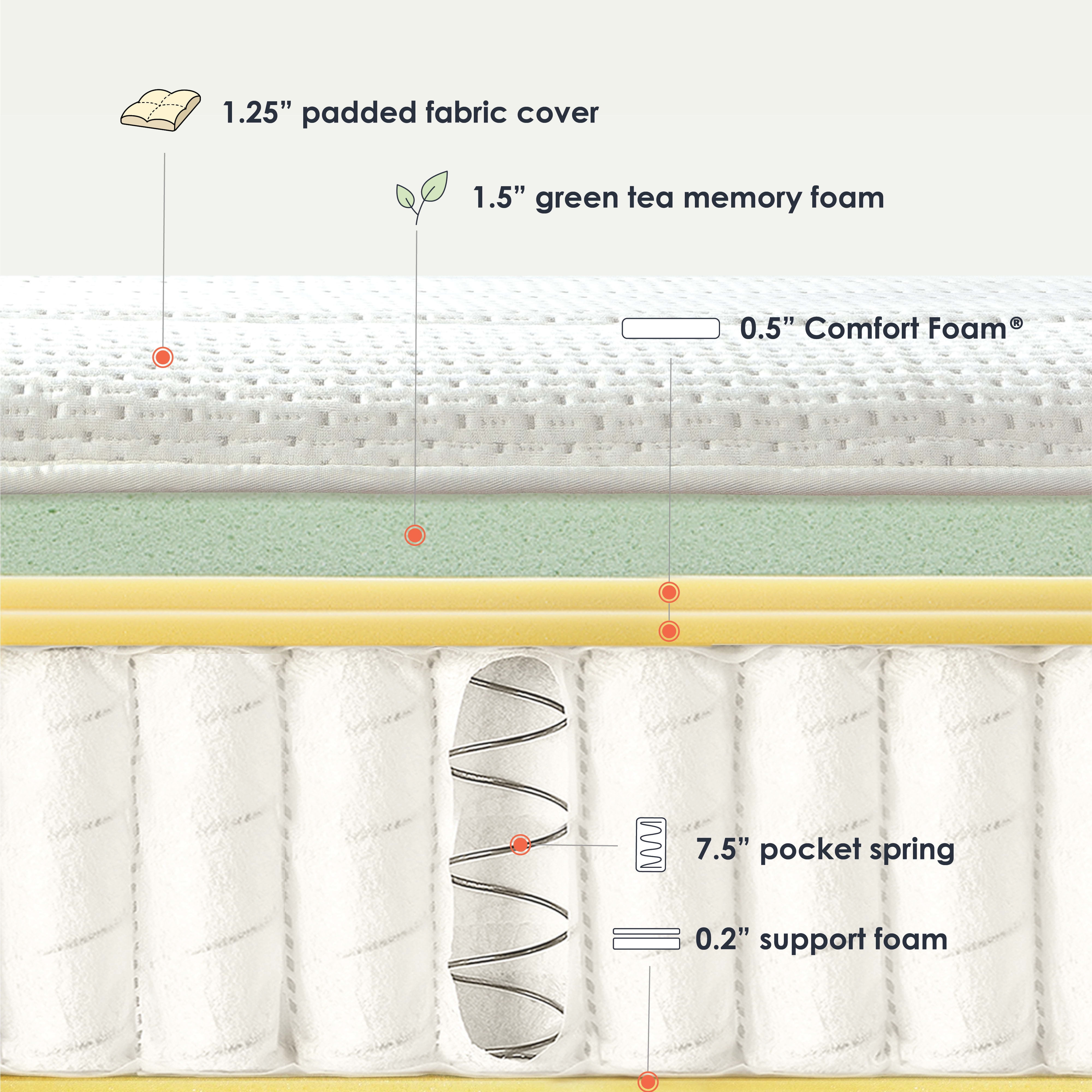 Medium firm euro top pocket spring mattress with pressure relieving foams and green tea memory foam Green tea infusion provides calming effects and helps keep your mattress fresh Individually wrapped pocket springs move independently so that you and your sleep partner can enjoy undisturbed, deep sleep Quilted euro top includes microfiber padding for added comfort Non-slip bottom helps keep your mattress in place on top of any bed base or frame Designed for ease, our mattress-in-a-box is compactly packaged and delivered straight to your door Made with CertiPUR-US® certified foams that are tested to meet high standards for content, emissions and durability 10-year manufacturer’s warranty included for defects Age Group: All Ages, Universal.