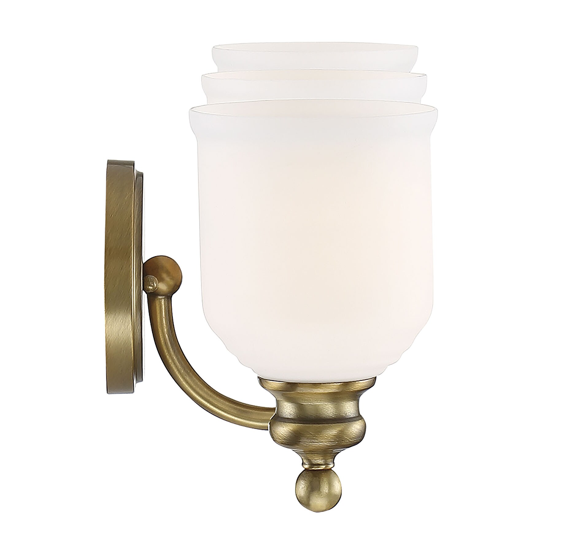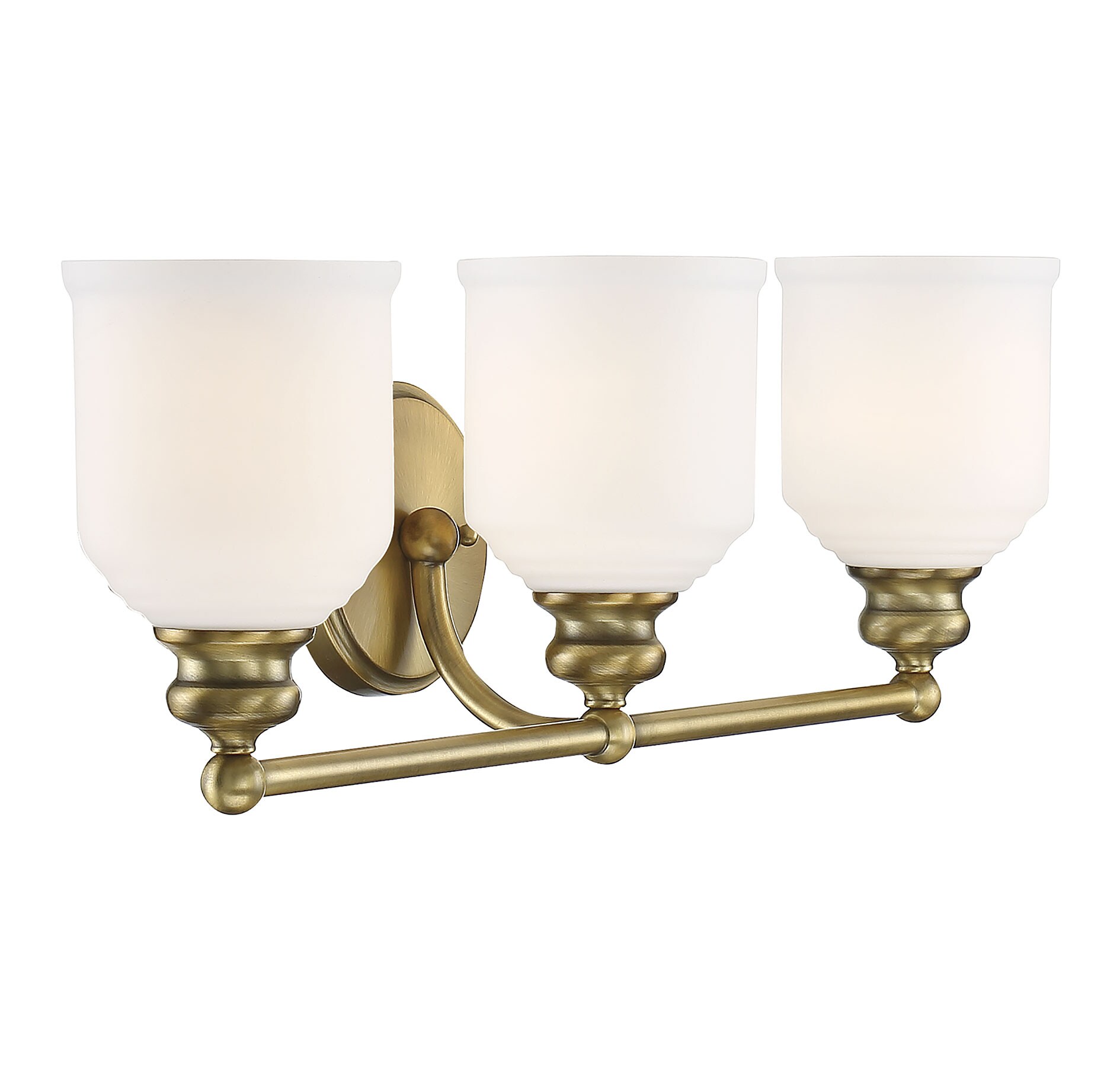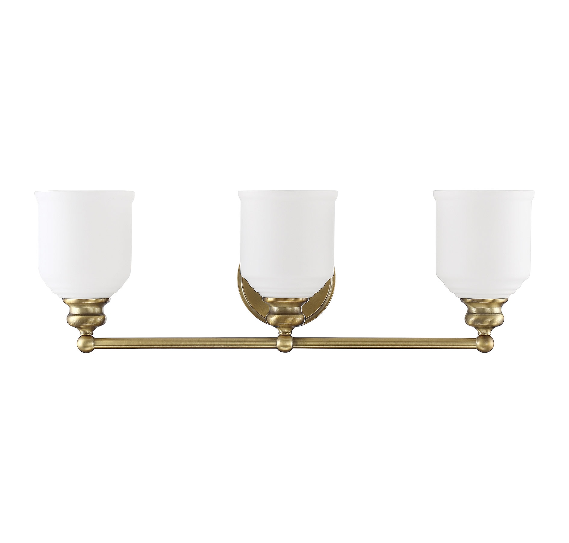 From Savoy House, the Melrose 3-light bath vanity bar stylishly updates classic Americana design for today’s interiors. It features modern lines, white opal glass shades and a warm brass finish. It may be mounted as either uplight or downlight. Bath bar lights are a classic choice for illuminating vanity mirrors in bathrooms big and small. The warm brass finish can be paired with brass hardware or mixed with hardware in other finishes. Bring Melrose into bathrooms of traditional, transitional or classic style to improve the look and the lighting. When you choose a Savoy House lighting fixture, you can be certain you’ve selected a piece that will withstand the test of time.