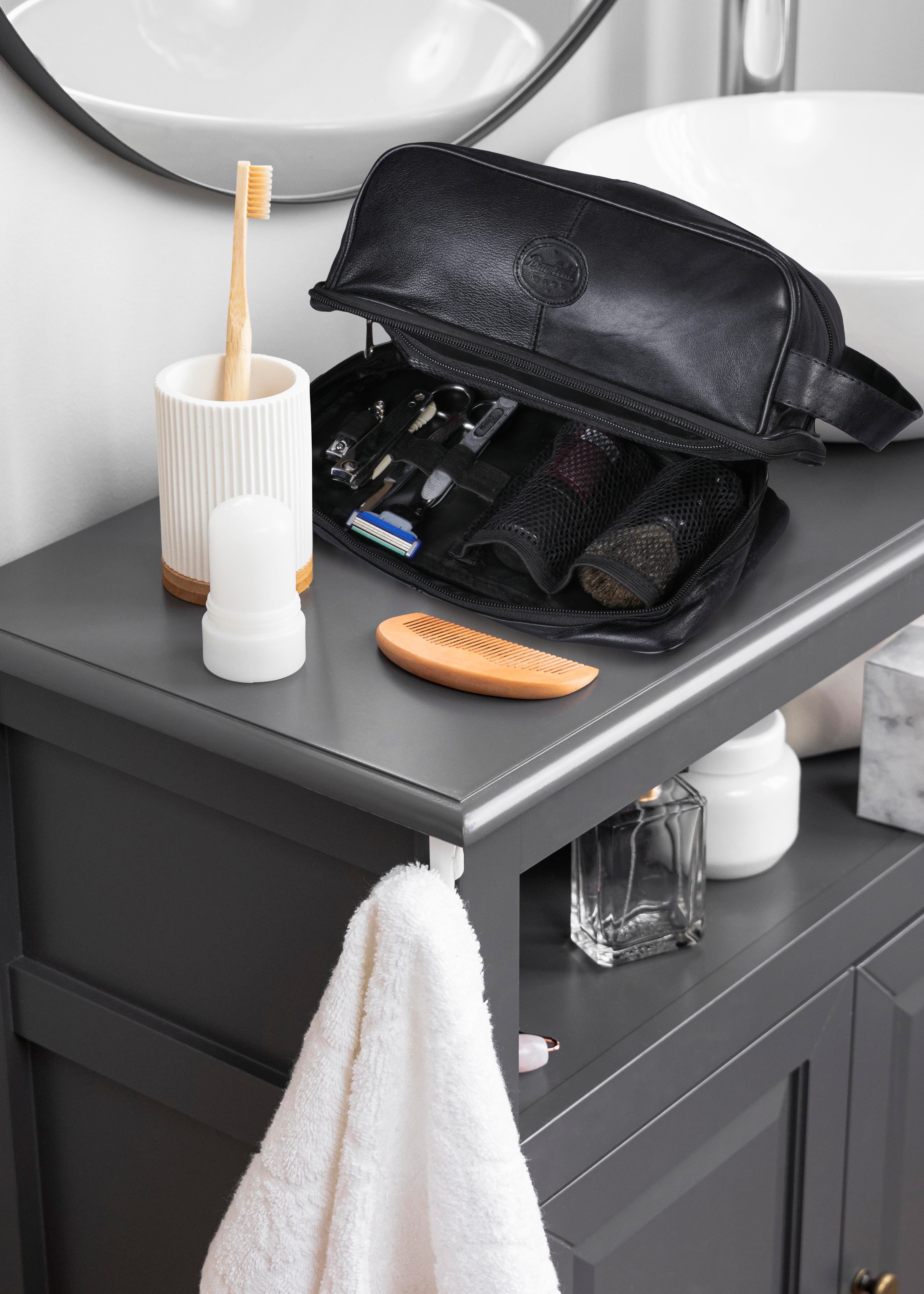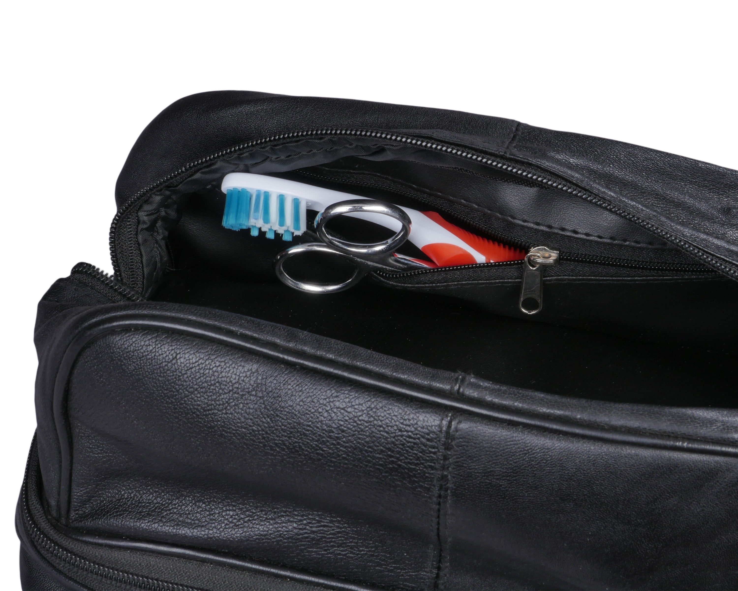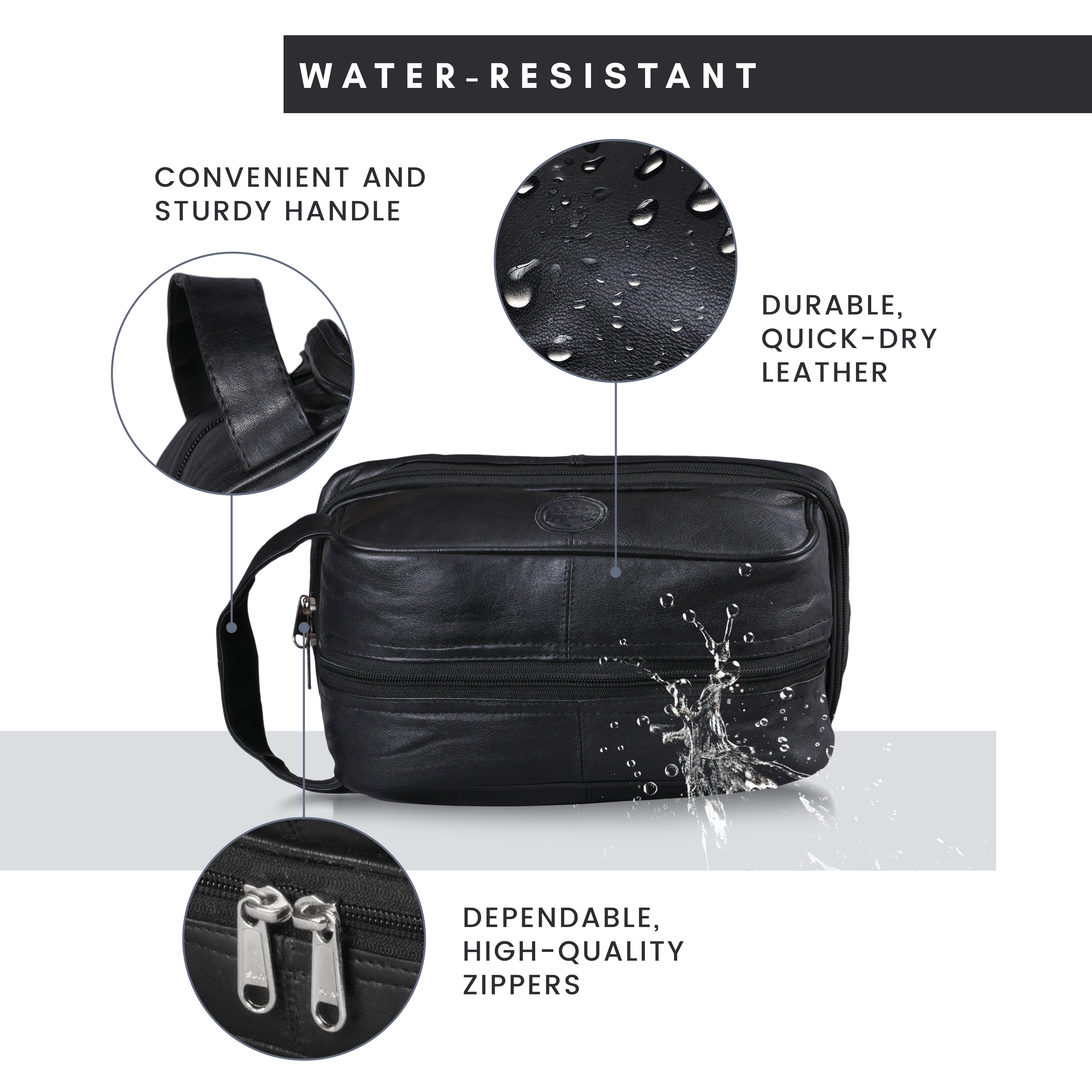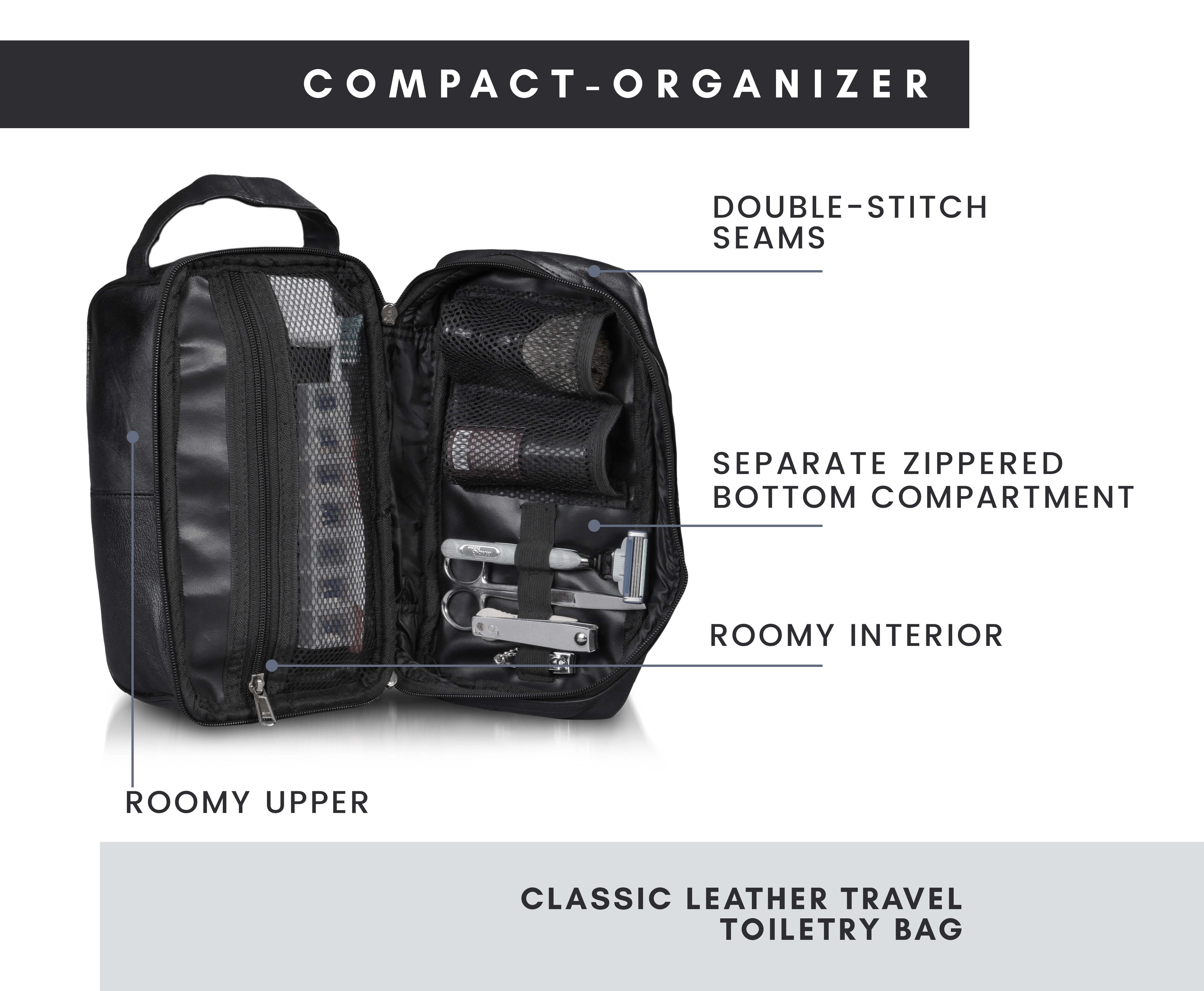 DOUBLE-STITCH SEAMS: This shower travel bag has double-stitched seams and heavy-duty zippers that last for years without splitting or breaking on this black onyx men’s shaving bag ROOMY INTERIOR: Our men’s travel toiletry bag stores and organizes all your toiletries supplies in one small bag (11x6x6 inches) This Dopp kit for men fits easily into a backpack or suitcase for travel and home SEPARATE ZIPPERED BOTTOM COMPARTMENT: Our shaving kit has a separate zippered bottom compartment that opens to store your shave brush, shave soap, and razor in mesh pockets and a wide elastic band for razor, clippers, tweezers in this toiletry bag for men ROOMY UPPER COMPARTMENT: Large zippered storage area on this top holds larger items like shaving cream, aftershave and toothpaste in this toiletry bag organizer CLASSIC LEATHER TRAVEL TOILETRY BAG: Classic leather Dopp bag for men or women gives you a product that gets better with age