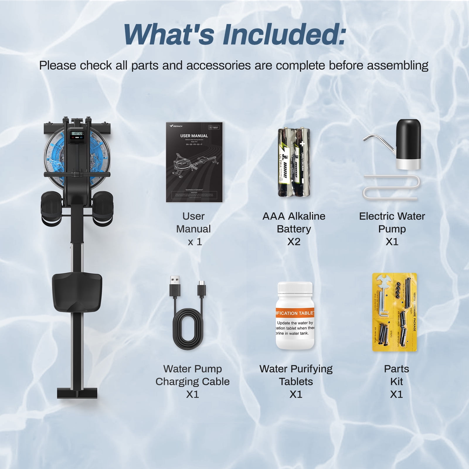 ??Key Feature 【Realistic Water Rowing Experience】 Experience the true sensation of rowing on water with a 12-blade advanced resistance system. The smooth, lifelike aquatic motion replicates the fluidity and inertia of real rowing, immersing you in a highly authentic workout experience. 【Durable Build and Powerful Performance】 The aerospace-grade 15L water tank is highly transparent, impact-resistant, and leak-proof, ensuring durability for long-term use. Paired with a robust steel frame and non-slip pedals, the machine supports up to 350 lbs, delivering stability and consistent resistance for effective full-body workouts. 【Smart Technology Integration】 Track essential metrics like calories, time, distance, and reps with a precision rowing monitor. Connect seamlessly to the MERACH APP via Bluetooth for live classes, virtual personal trainers, scenic rowing modes, and community sharing. The adjustable iPad stand enhances convenience and engagement. 【Comfort-Driven and Space-Saving Design】 The ergonomic super-soft cushioned seat and non-slip pedals ensure maximum comfort during workouts. Easily move and store the machine upright with transport wheels, saving space without worrying about water leakage. Perfect for any home environment. 【Effortless Setup and Reliable Support】 Arriving 90% pre-assembled, the rowing machine includes an electric pump and installation tutorials for swift setup. Backed by a 12-month warranty and 24/7 customer service, MERACH ensures a worry-free and satisfying user experience. ??Product Specifications: Brand: MERACH Color: Black and Red Maximum Weight Capacity: 350 LBS Frame Material: Alloy Steel Special Feature: 12 Multi-Blade+15L Large Capacity Non-slip Pedals+Adjustable Straps Easy to Assembly Ergonomic Soft Seat Durable Nylon Rope Quick Installation Connect Bluetooth and Free App Easy to Move and Storage 12 Multi-Blade+15L Large Capacity Non-slip Pedals+Adjustable Straps Easy to Assembly Ergonomic Soft Seat Durable Nylon Rope Quick Installation Connect Bluetooth and Free App Easy to Move and Storage ??What you get: User Manua x 1 AAA Alkaline Battery X2 Electric Water Pump X1 Water Pump Charging Cable X1 Water Purifying Tablets X1 Parts Kit X1