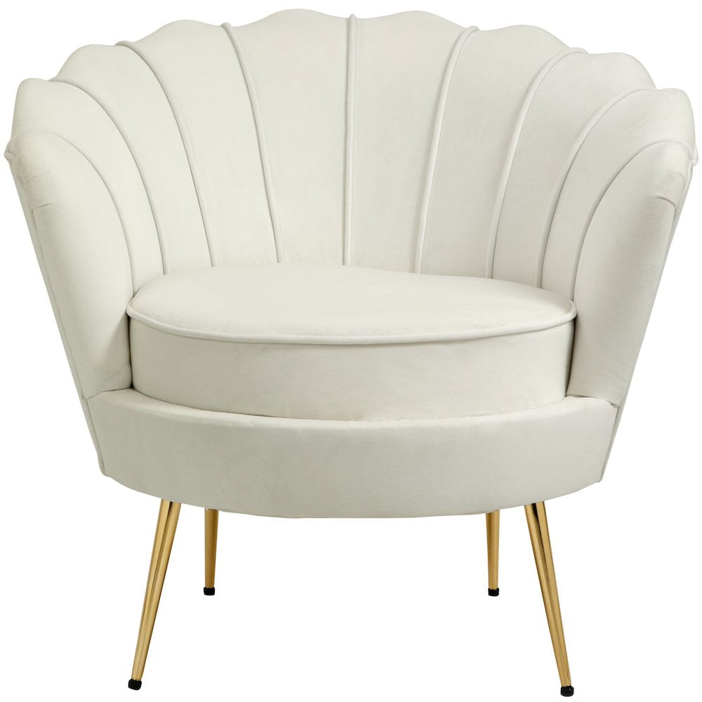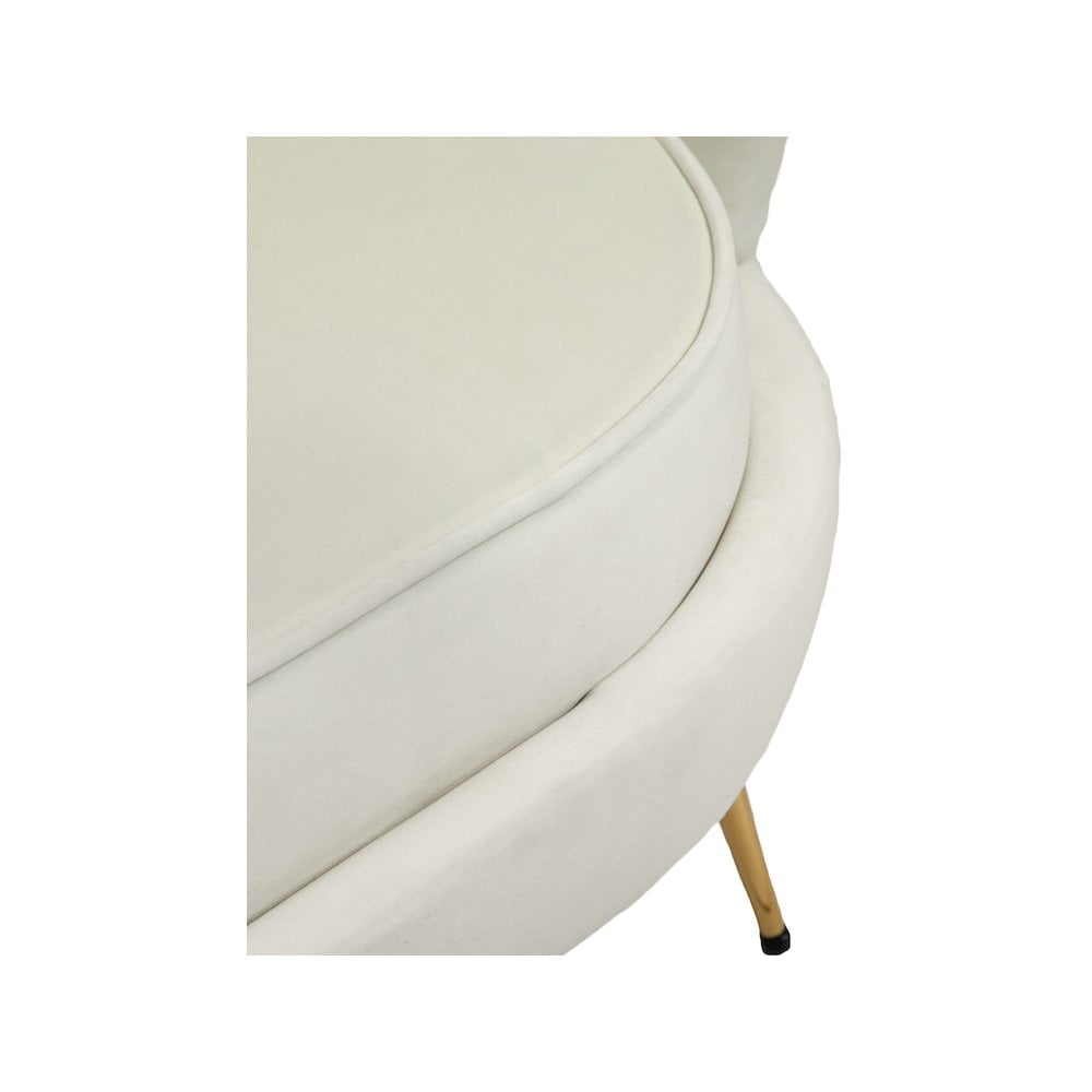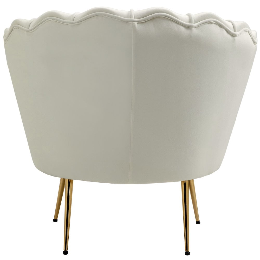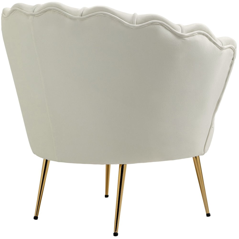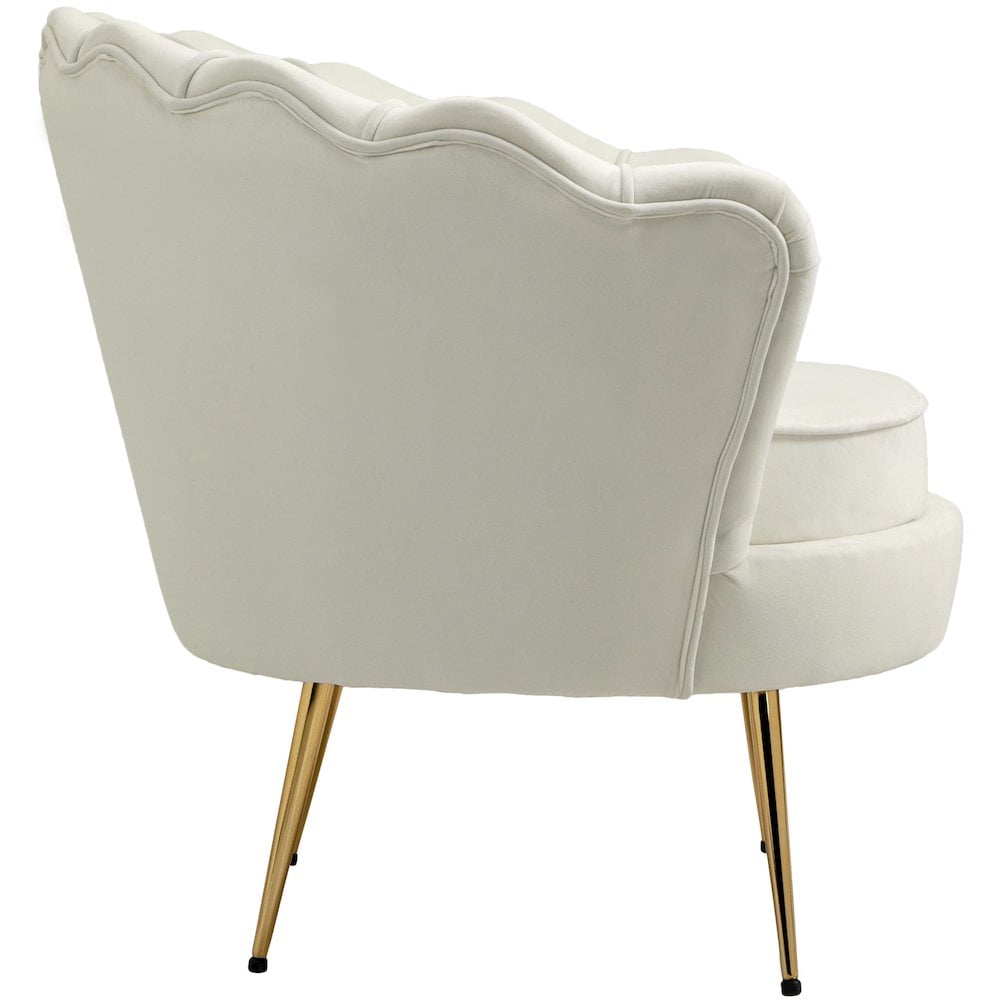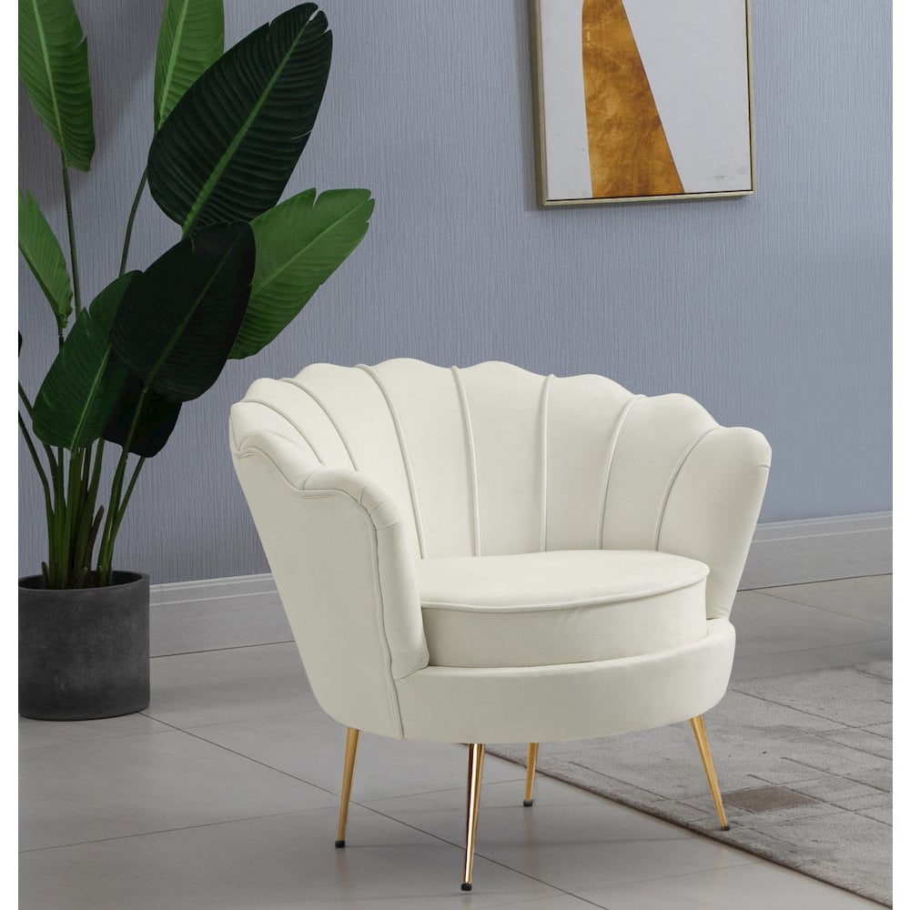 Turn heads in an instant when you add this Gardenia velvet chair to your room. This attention-demanding chair features a shell-shaped back with deep channel tufting for added textural appeal. The round seat cushion is deep and generously sized, so you have wiggle room to get comfortable. Soft cream velvet upholstery covers the entire chair except for its legs, which are made from chrome for durability and finished in gold for a touch of glam. Features: Soft Cream Velvet Gold and Chrome Legs Included Deep Channel Tufting Contemporary Design Specifications: Product Dimensions: 32″ W x 31″ D x 31″ H Assembly Required: Yes Seat Dimensions: Seat Width:20.87″ Seat Height:17.72″ Seat Depth:21.65″ Seat back height: 12.79″