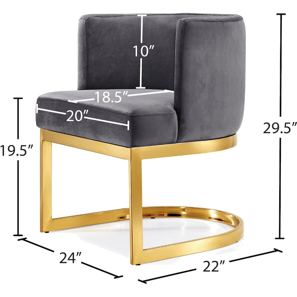 The back of the chair has a barrel design that cradles you in comfort while you enjoy a meal with friends, and the chair is thickly padded and upholstered in plush Gray velvet for a luxe feel. The base is made from stainless steel with a gold finish for a finish that’s stunningly beautiful. Features: Upholstery Material: Gray Velvet Finish: Rich Gold Sturdy Stainless Steel Base Solid Wood Frame Barrel Shape Padded with High Density Foam for Maximum Comfort Contemporary Design Specifications: Product Dimensions: 24″ W x 22″ D x 29.5″ H Product Weight: 30 lbs Assembly Required: Yes Seat Dimensions: Seat Width: 20″ Seat Height: 19.5″ Seat Depth: 18.5″ Arm Height: 29.5″