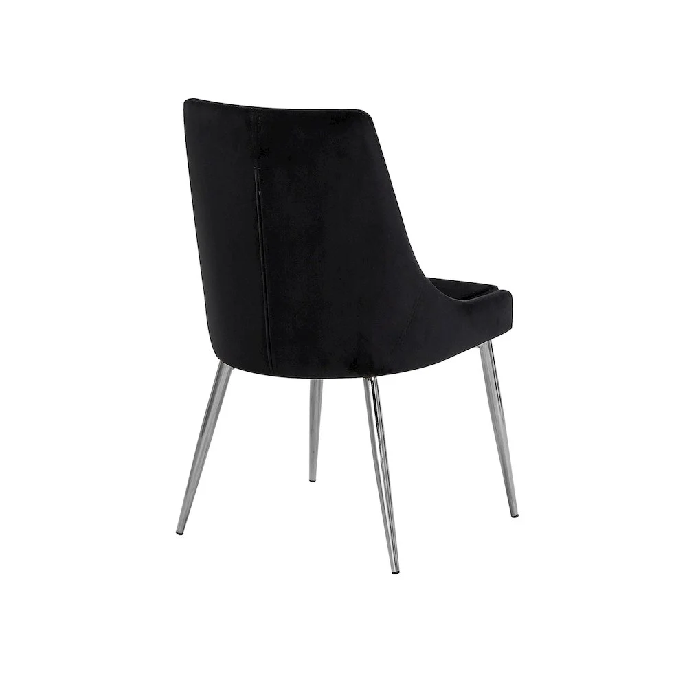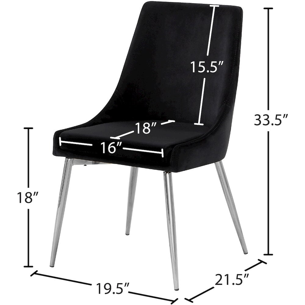 Extend contemporary panache to the dining room with this Karina Black Velvet Dining Chair. This dining chair features upholstery in sleek black velvet for a modern look and has an armless design for a retro-inspired vibe. The stark black color makes it easy to blend in with your existing decor colors or make a contrasting statement with ease. The slanted legs of this chair are chrome finished for added modernity and to provide reliable and durable support while you dine. Features: Upholstery Material: Black Velvet Finish: Polished Chrome Solid Wood Frame Retro-Inspired Padded with High Density Foam for Maximum Comfort Contemporary Design Specifications: Upholstery Material: Velvet Product Dimensions: 19.5″ W x 21.5″ D x 33.5″ H Seat Height: 18 Seat Width: 16 Frame Material: Wood Target Audience: All Ages Assembly details: Adult Assembly Required, No Tools Needed Warranty Description: 30 Day Limited Warranty Maximum Seating Capacity: 2 Seat back height: 15.5 Furniture Subtype: Armless Chairs Number of Pieces: 2 Product Weight: 33 lbs Assembly Required: Yes Seat Dimensions: Seat Width: 16″ Seat Height: 18″ Seat Depth: 18″