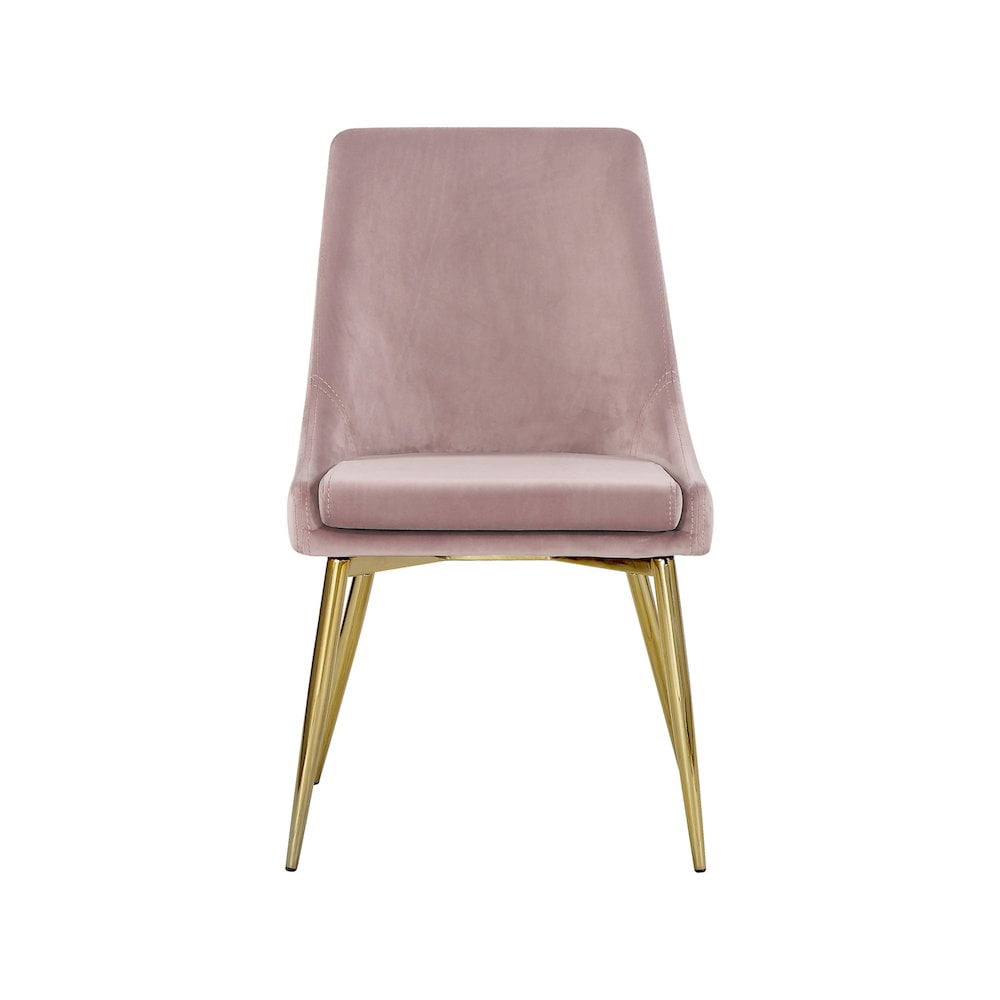 Extend contemporary panache to the dining room with this Karina Pink Velvet Dining Chair. This dining chair features upholstery in sleek pink velvet for a modern look and has an armless design for a retro-inspired vibe. The stark pink makes a contrasting statement with ease. The slanted legs of this chair are gold finished for added modernity and to provide reliable and durable support while you dine. Features: Upholstery Material: Pink Velvet Finish: Polished Gold Solid Wood Frame Retro-Inspired Padded with High Density Foam for Maximum Comfort Contemporary Design Specifications: Product Dimensions: 19.5″ W x 21.5″ D x 33.5″ H Product Weight: 33 lbs Assembly Required: Yes Seat Dimensions: Seat Width: 16″ Seat Height: 18″ Seat Depth: 18″