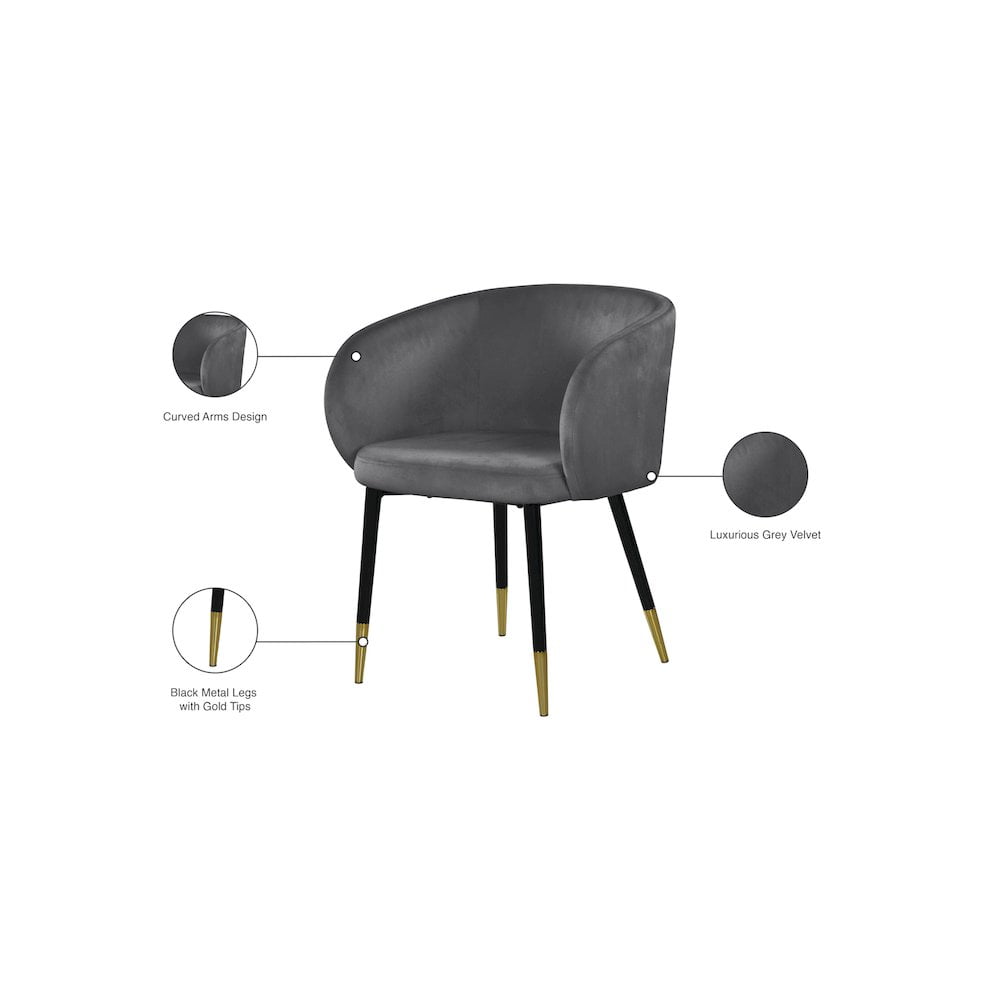 Upholstery Material: Gray Velvet Black Legs with Gold Tips Sturdy Metal Legs with Gold Tips Solid Wood Frame Curved Back Padded with High Density Foam for Maximum Comfort Contemporary Design