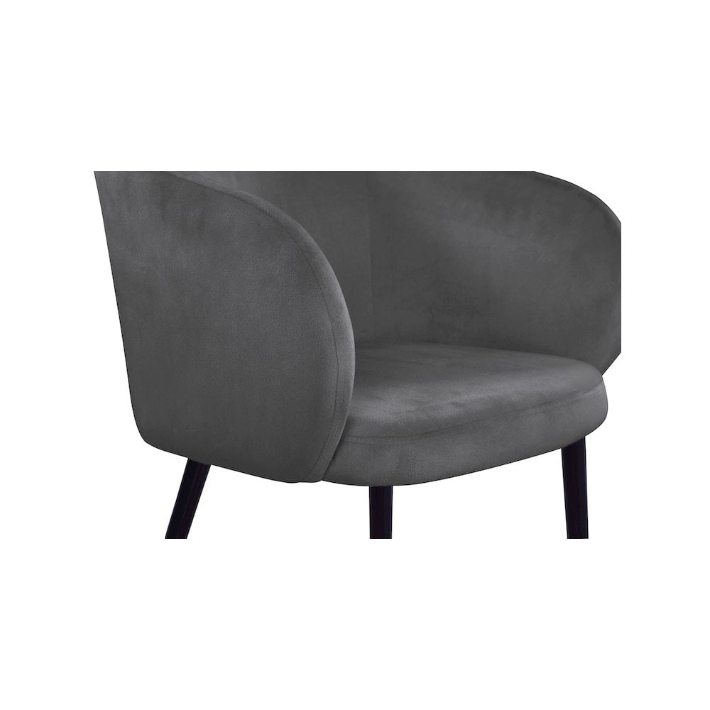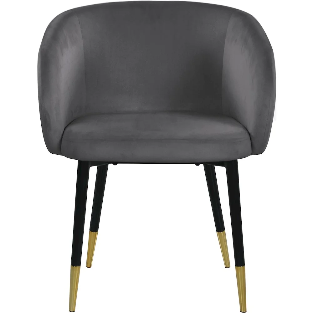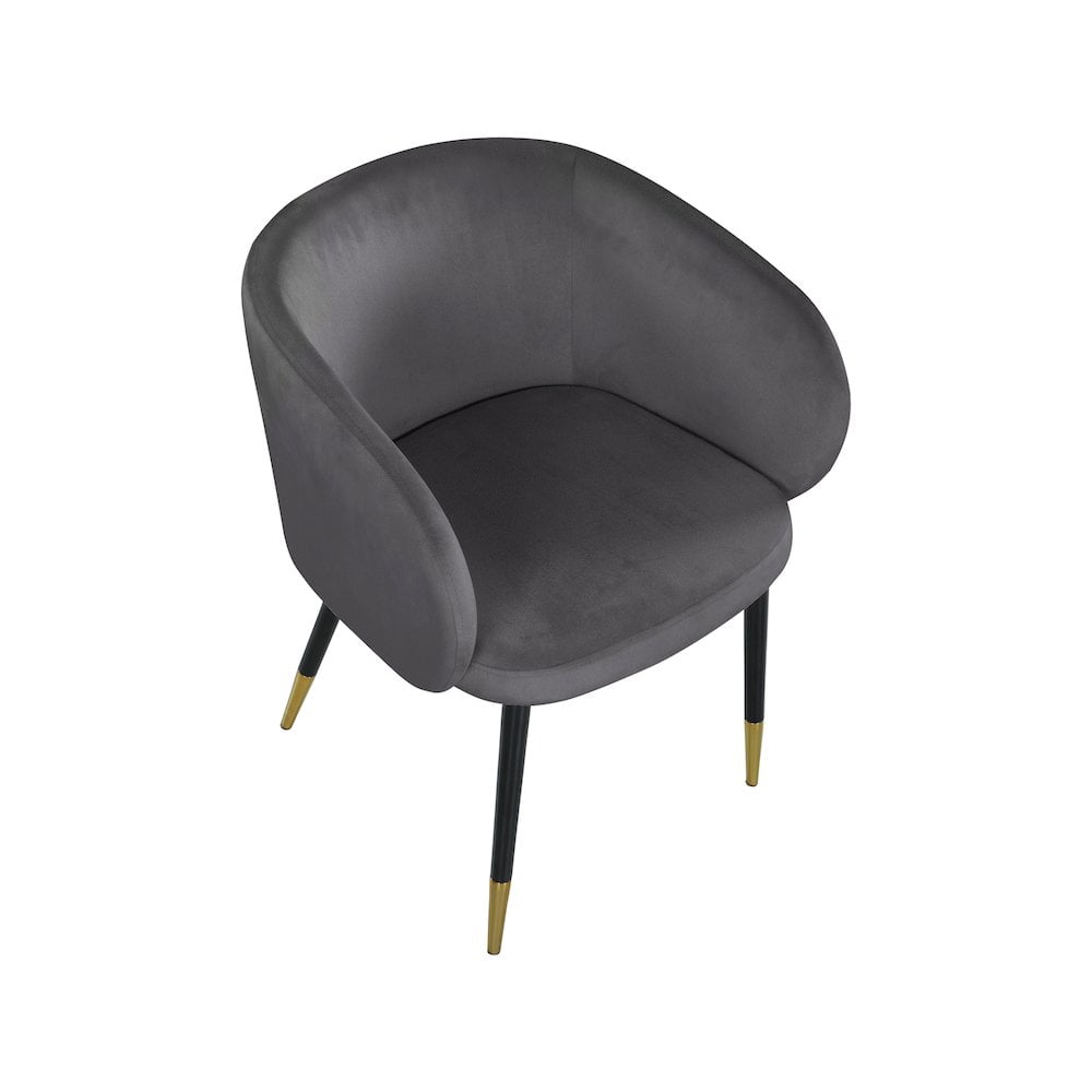 Redefine your living space with this modish Louise Velvet Dining Chair in Gray. Featuring stunning velvet Gray upholstery and a curved back, this chair offers a comfortable seat for you to relax in. With a frame supported by black metal legs with gold tips, this contemporary chair is not only sturdy and eye-catching; it’s stylish appeal and durability is sure to make it a favorite in your home for years to come. Features: Upholstery Material: Gray Velvet Black Legs with Gold Tips Sturdy Metal Legs with Gold Tips Solid Wood Frame Curved Back Padded with High Density Foam for Maximum Comfort Contemporary Design Specifications: Product Dimensions: 24″ W x 23.5″ D x 30″ H Product Weight: 24.5 lbs Assembly Required: Yes Seat Dimensions: Seat Width: 19″ Seat Height: 18″ Seat Depth: 18″