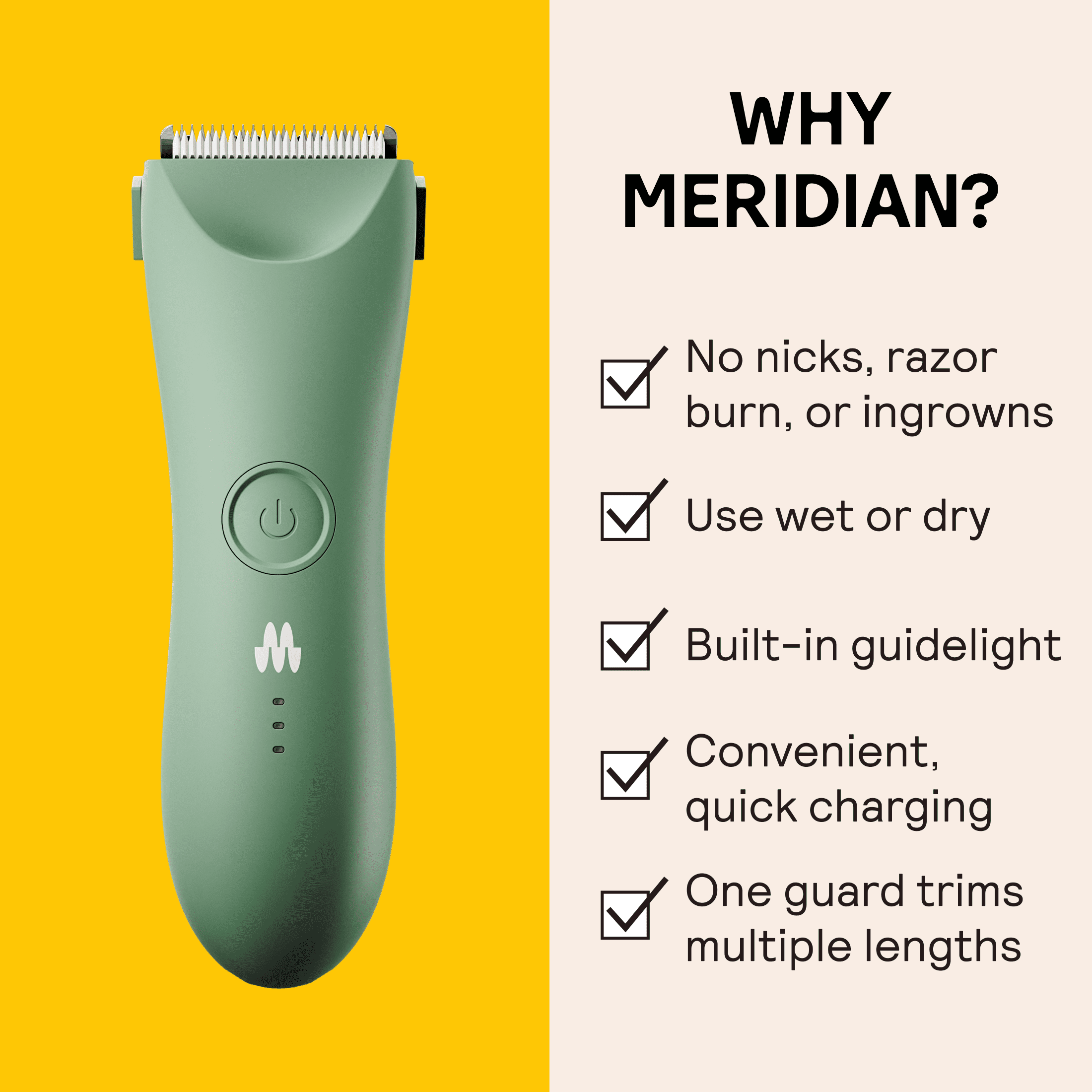 Whether you prefer bare, buzzed or a full bush look, Meridian provides premium trimmers for hair grooming everywhere on your body. The Trimmer Plus, the next generation of it’s original trimmer, is designed for an effortless and precise trim, featuring a fixed guard with 5 adjustable settings. High-quality ceramic blade provides a gentle glide that removes the coarsest of hair with no nicks or cuts. Whether you prefer a bare, buzzed, or full bush look – you’ll love the quiet, but high-powered performance this body and pubic hair trimmer delivers. The ideal trimmer for travel with built-in travel lock, LED spotlight and wet/dry technology. Color: Sage