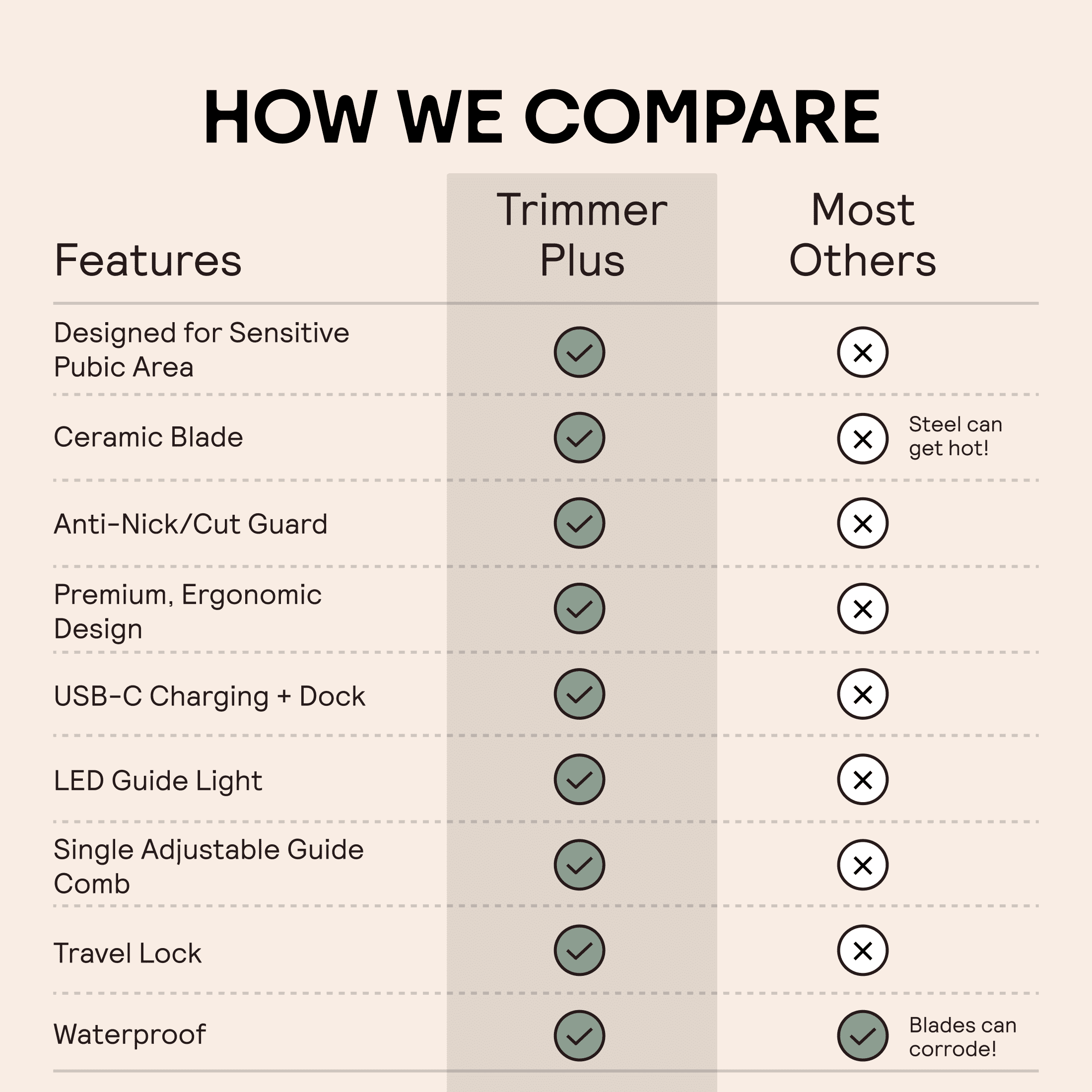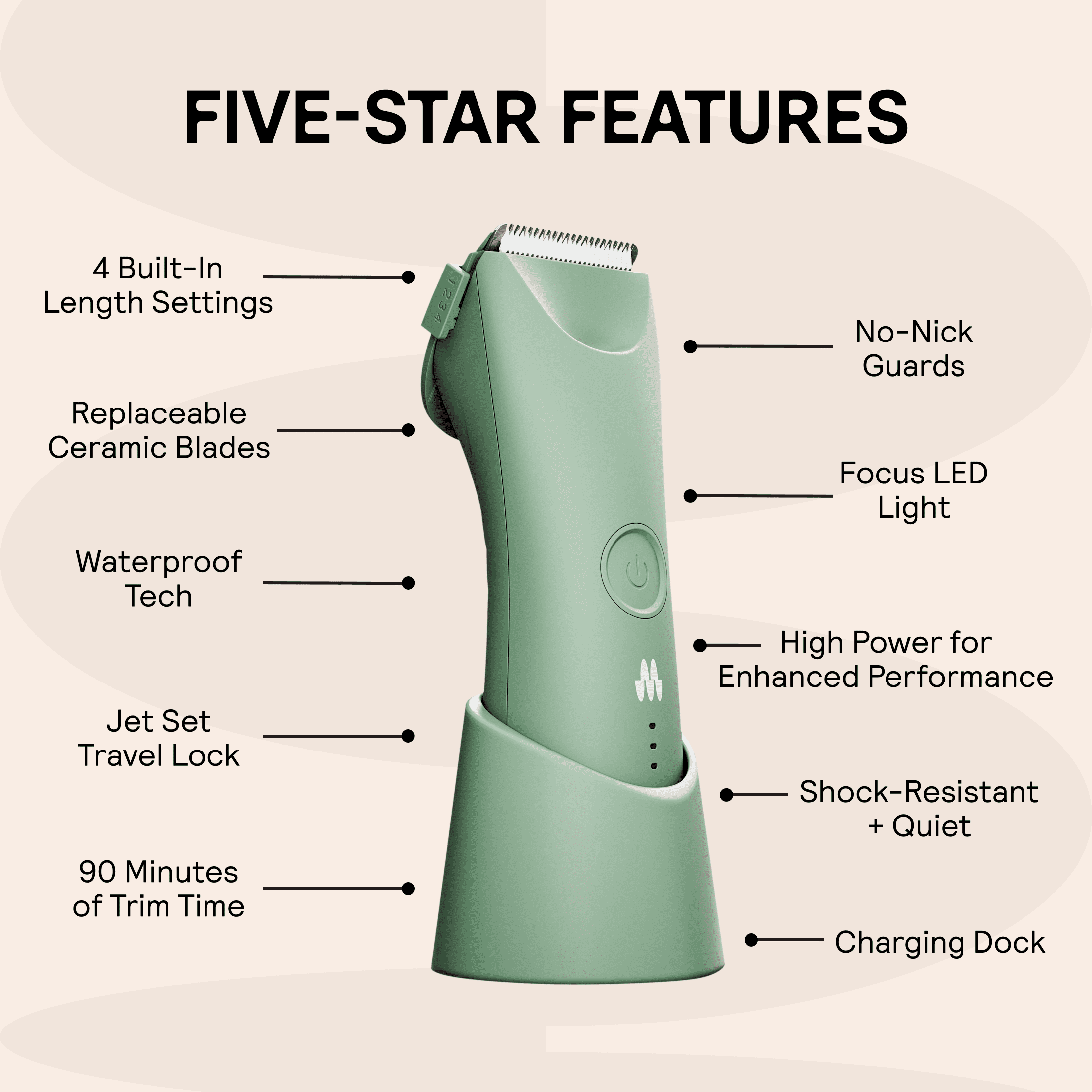 Effortless and precise trim 5-Adjustable settings LED spotlight Ceramic blade Wet/dry technology Quiet and powerful performance No nicks or cuts Built-in travel lock UPC 81004883280