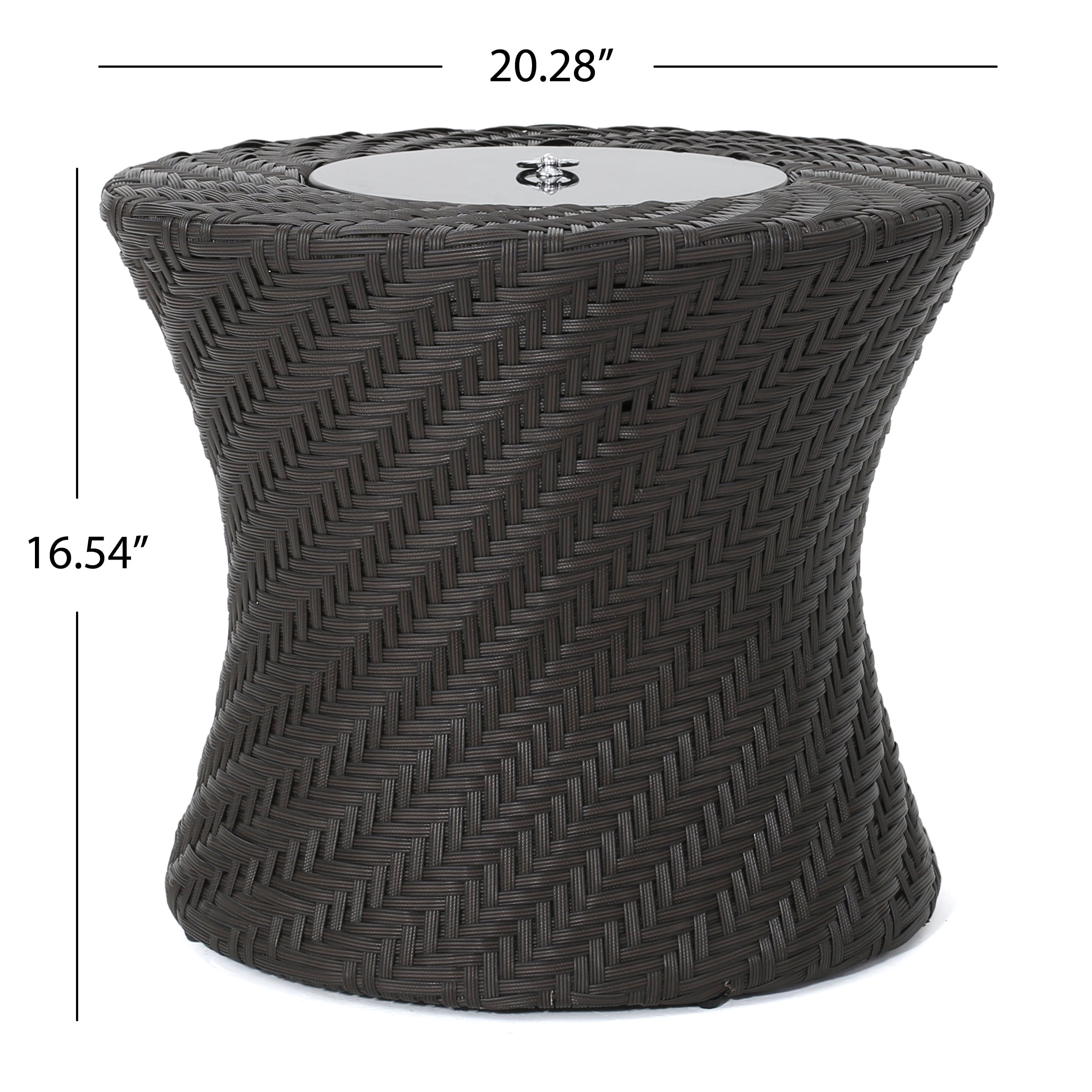 Includes: One (1) Accent Table Material: Polyethylene Wicker Frame Material: Iron Wicker Finish: Brown No Assembly Required Dimensions: 20.28 inches deep x 20.28 inches wide x 16.54 inches high